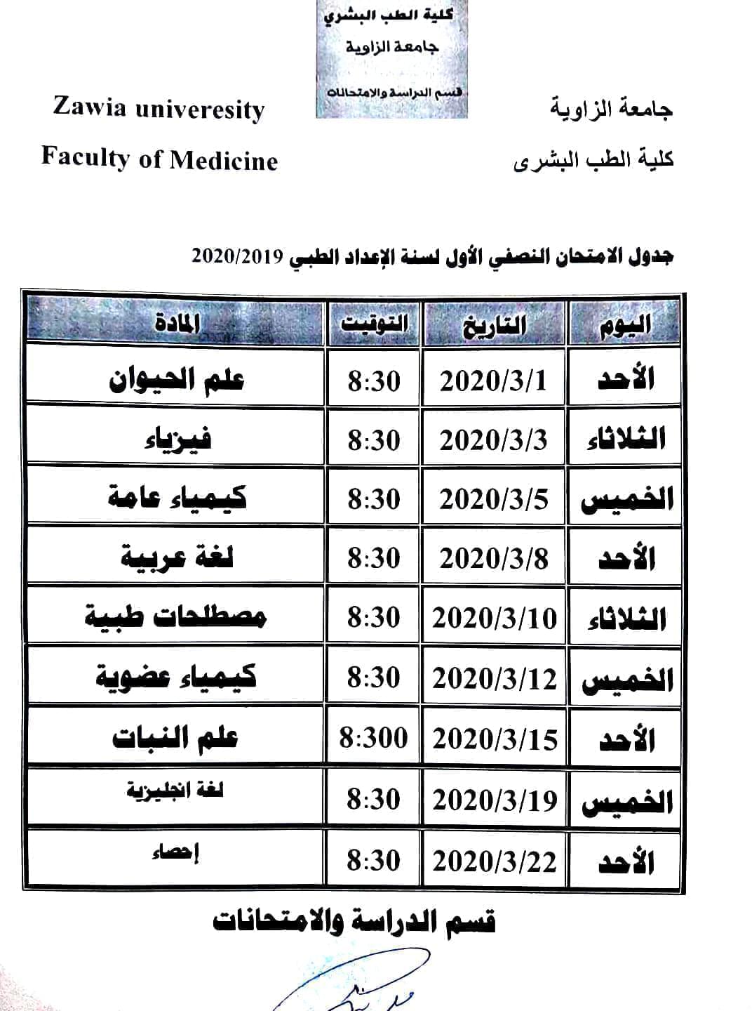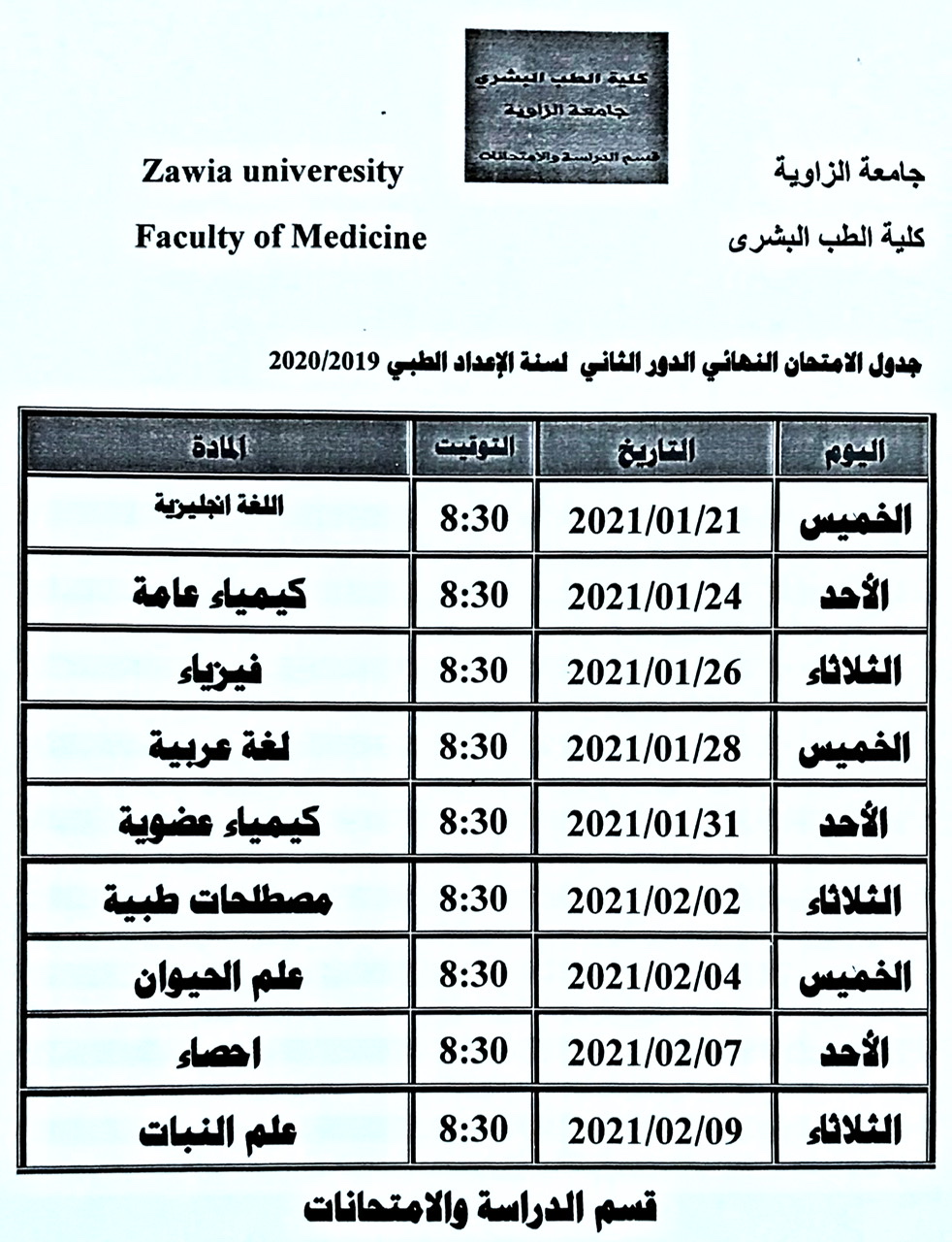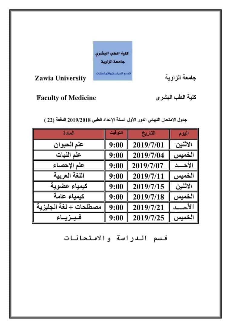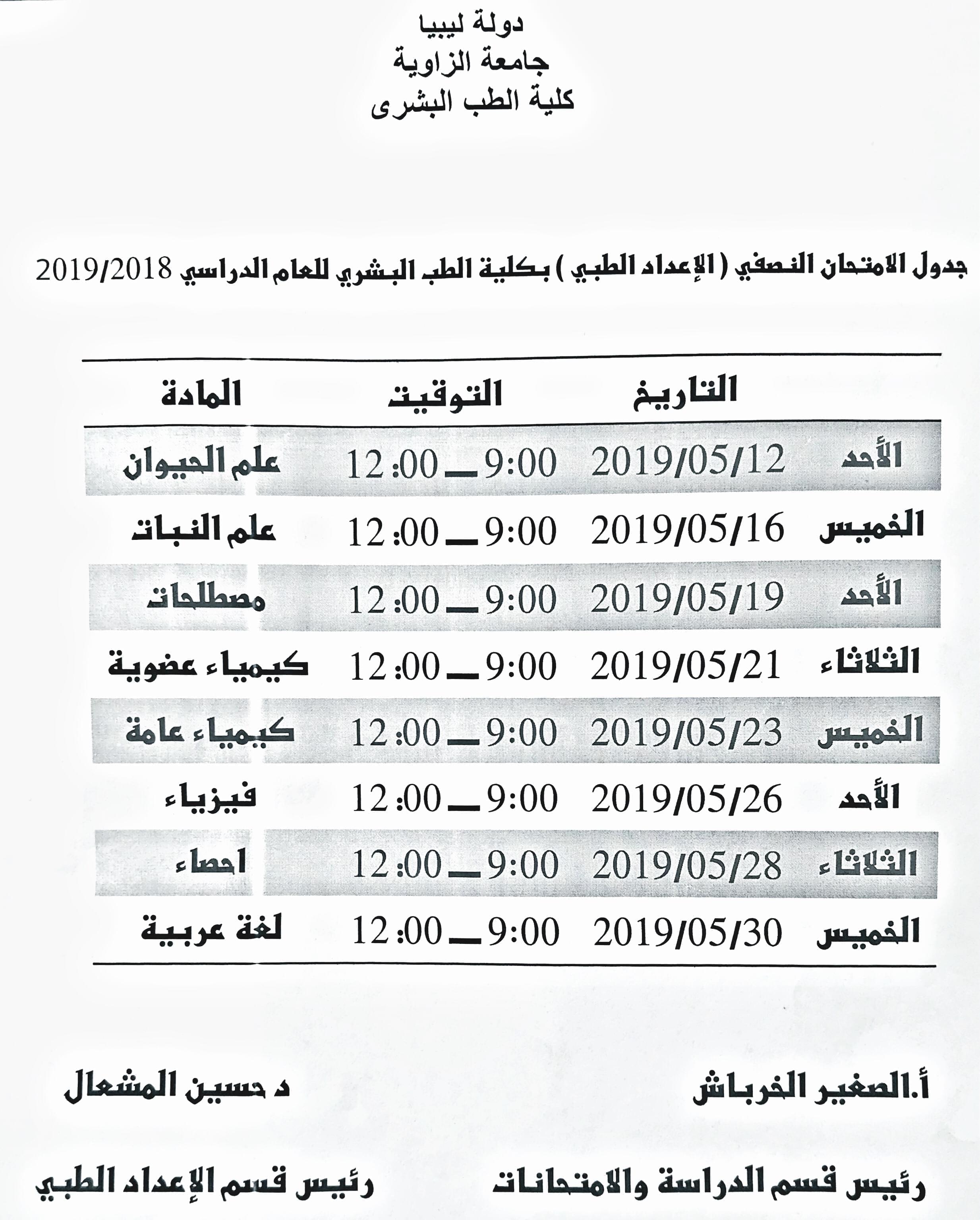 جدول الإمتحان النصفي الثاني لسنة الإعداد الطبي للعام الجامعي 2018-2019.