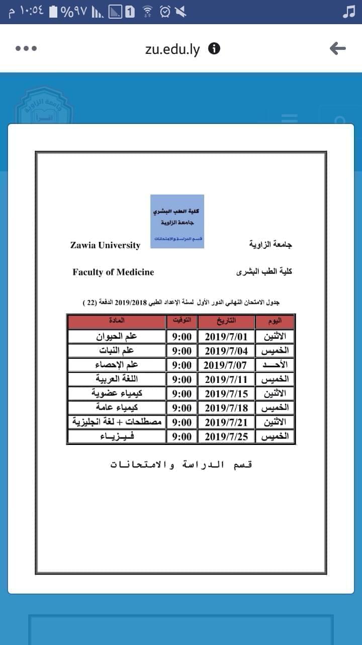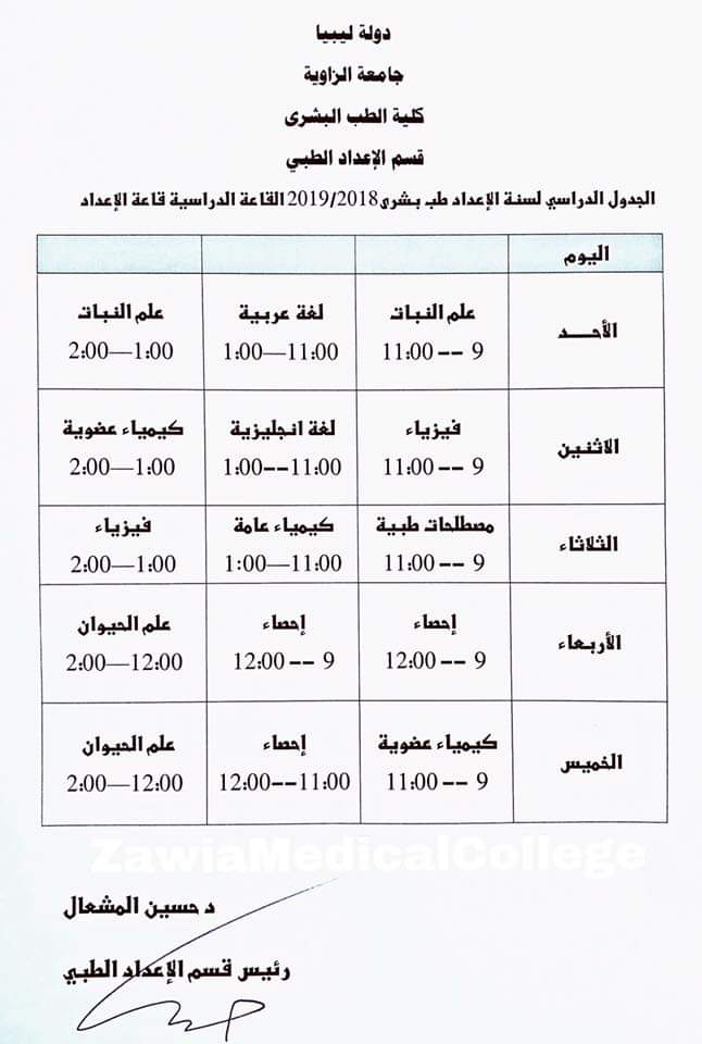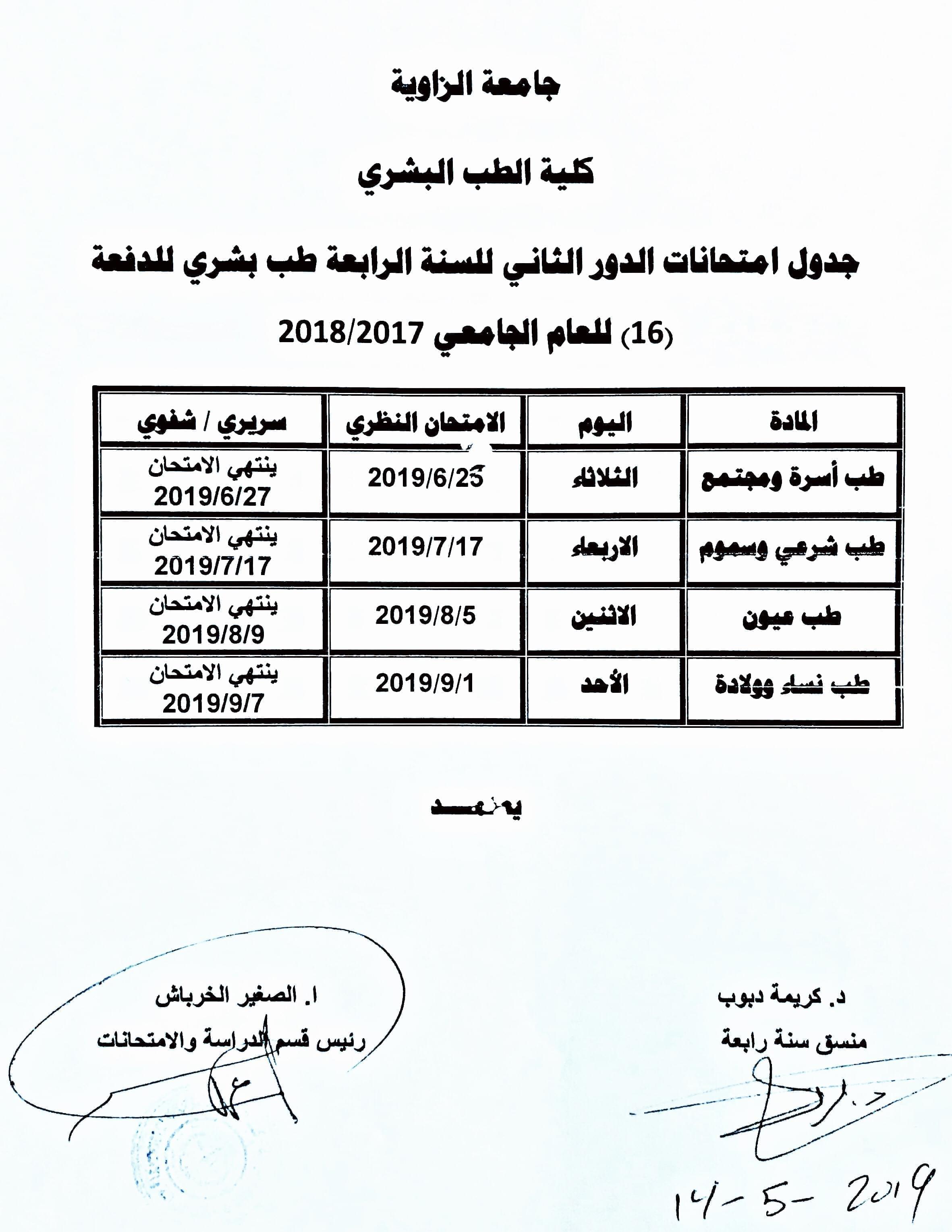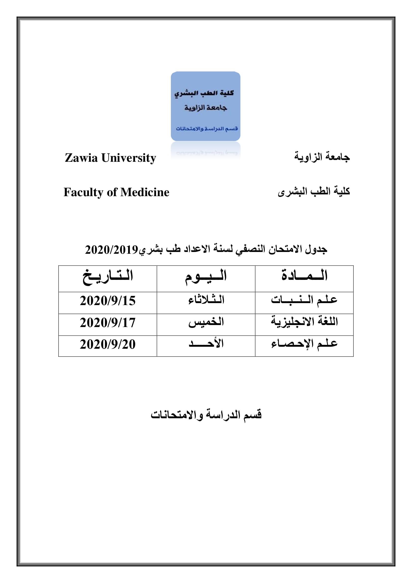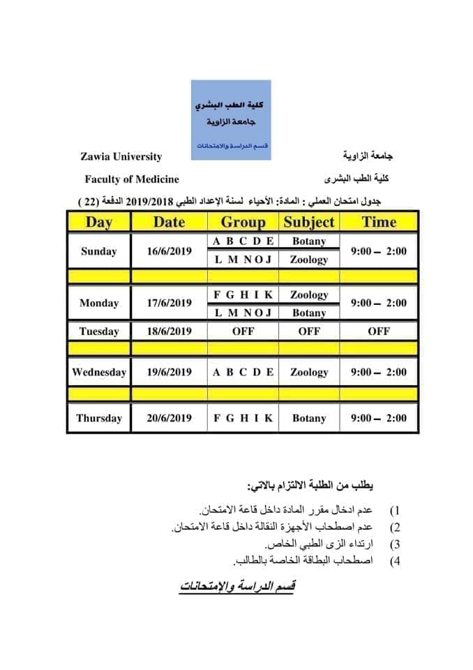 جدول الإمتحان النصفي الثاني لسنة الإعداد الطبي للعام الجامعي 2018-2019.