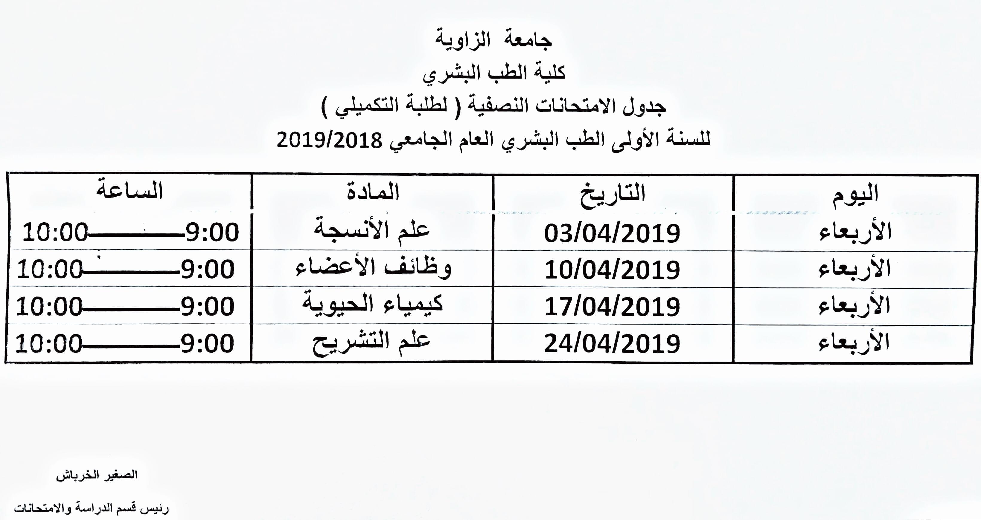 جدول الإمتحانات النصفية لطلبة التكميلي لسنة أولى طب بشري للعام الجامعي (2018-2019)