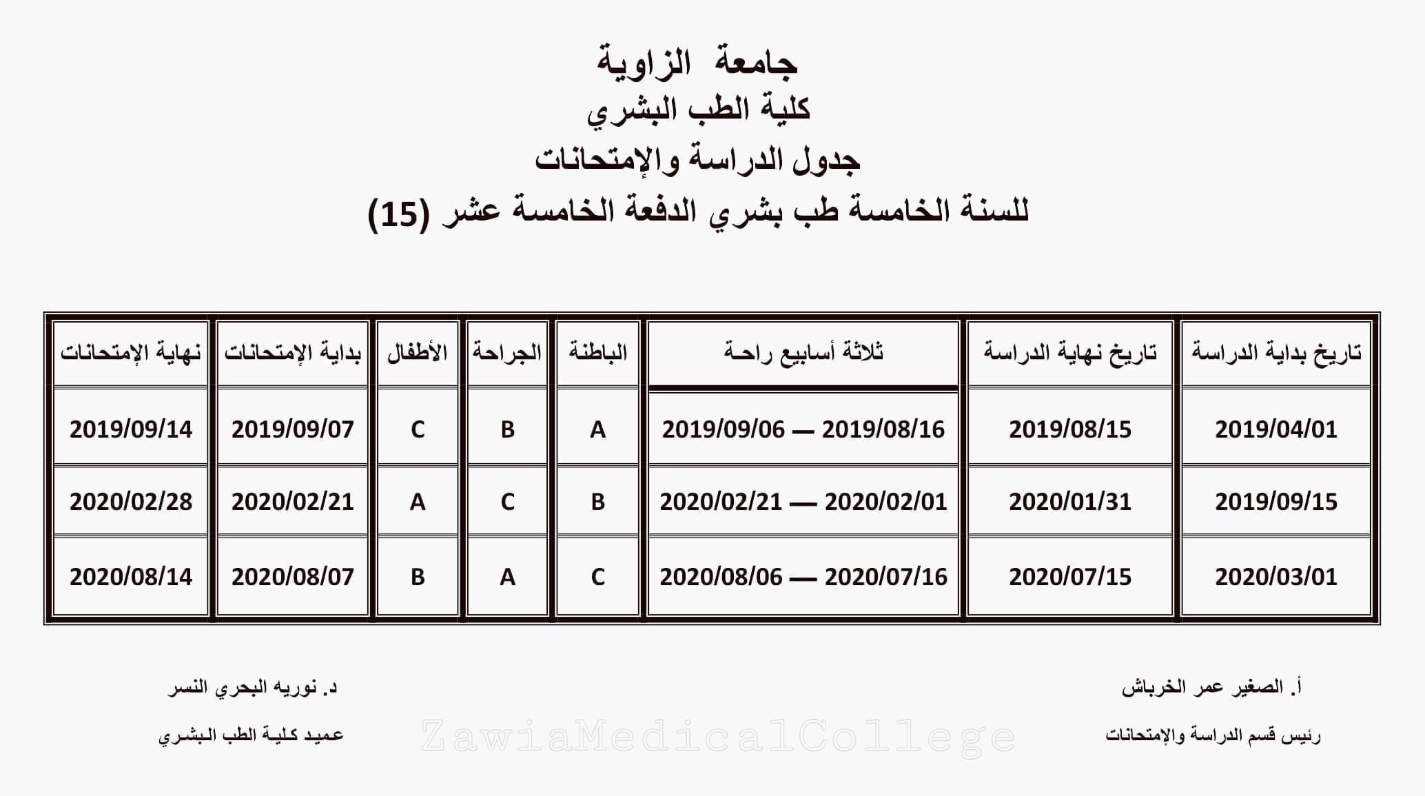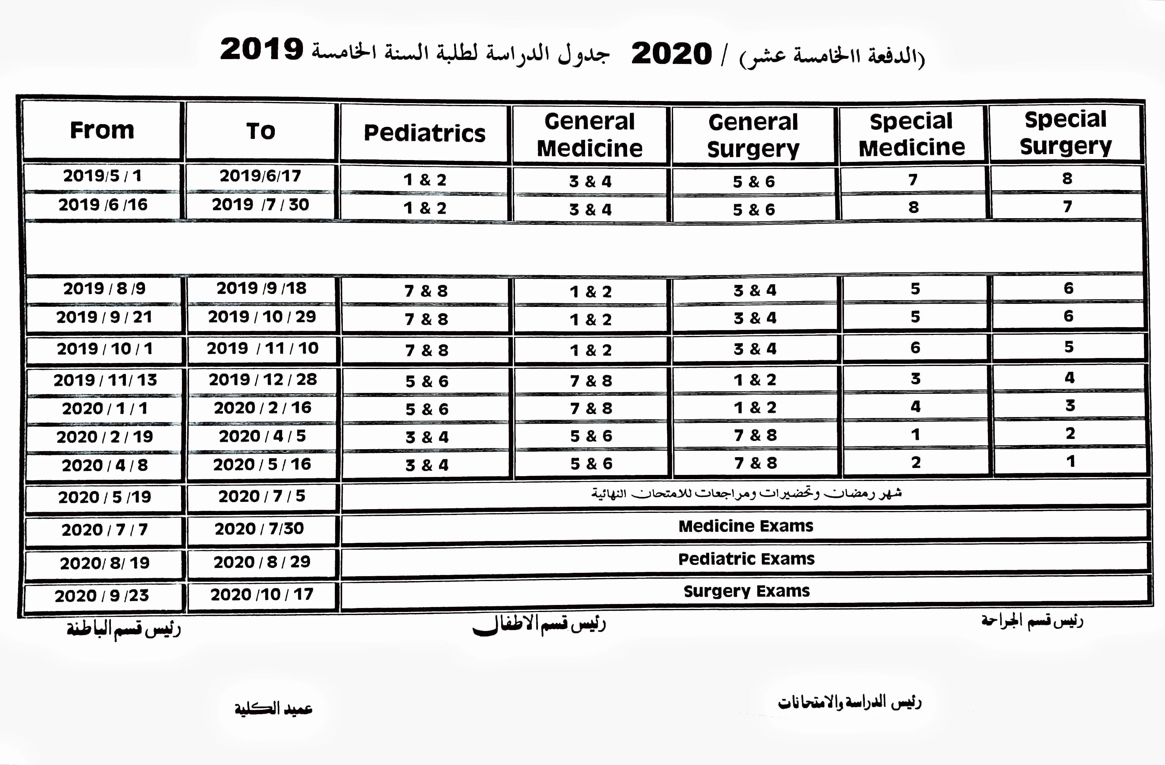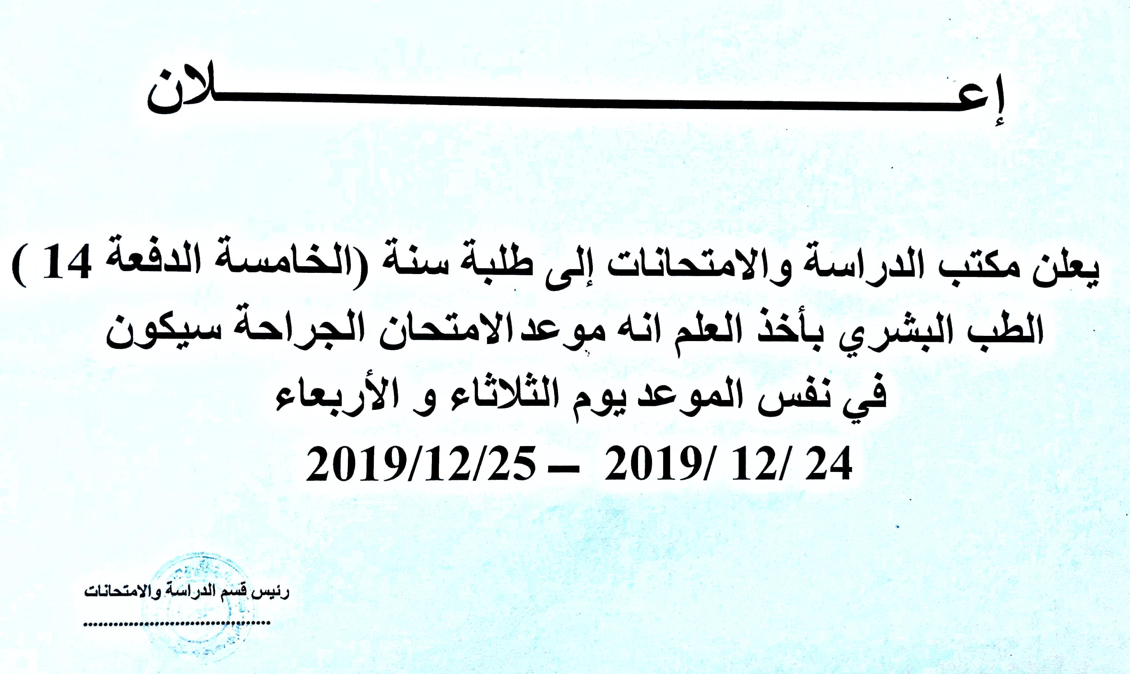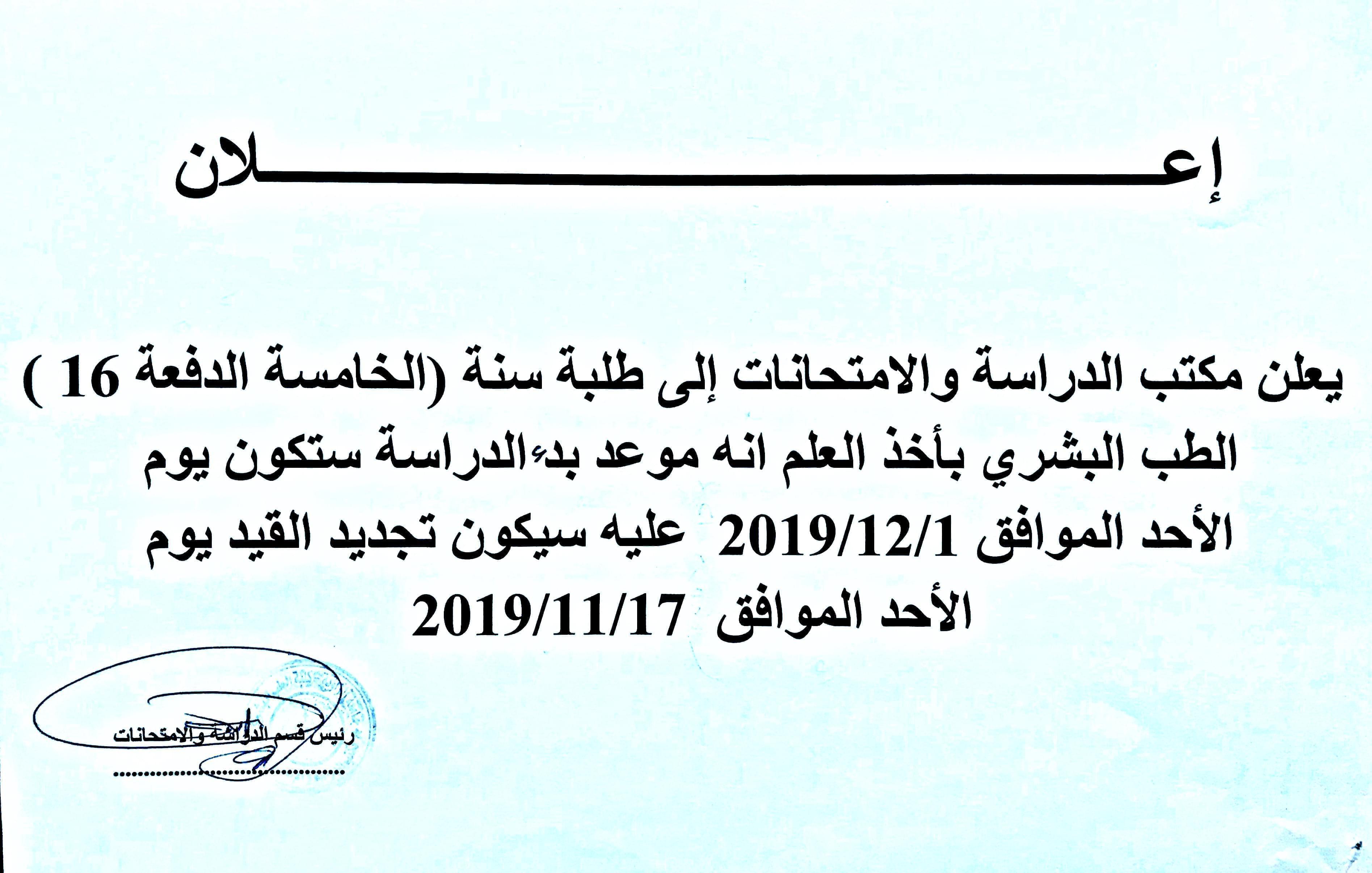 يعلن قسم الدراسة والامتحانات بكلية الطب البشري ان بداية العام الدراسي لسنة الخامسة الدفعة 15 هو 1-4-2019