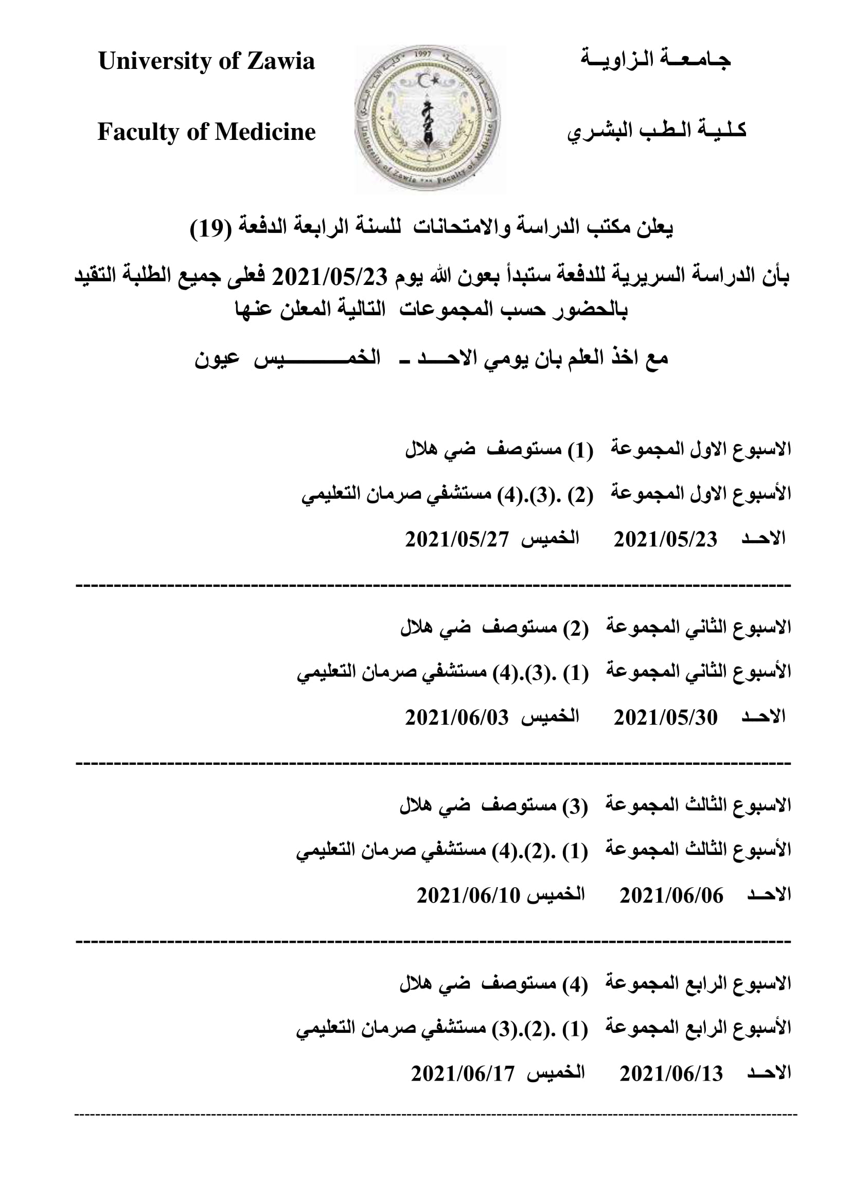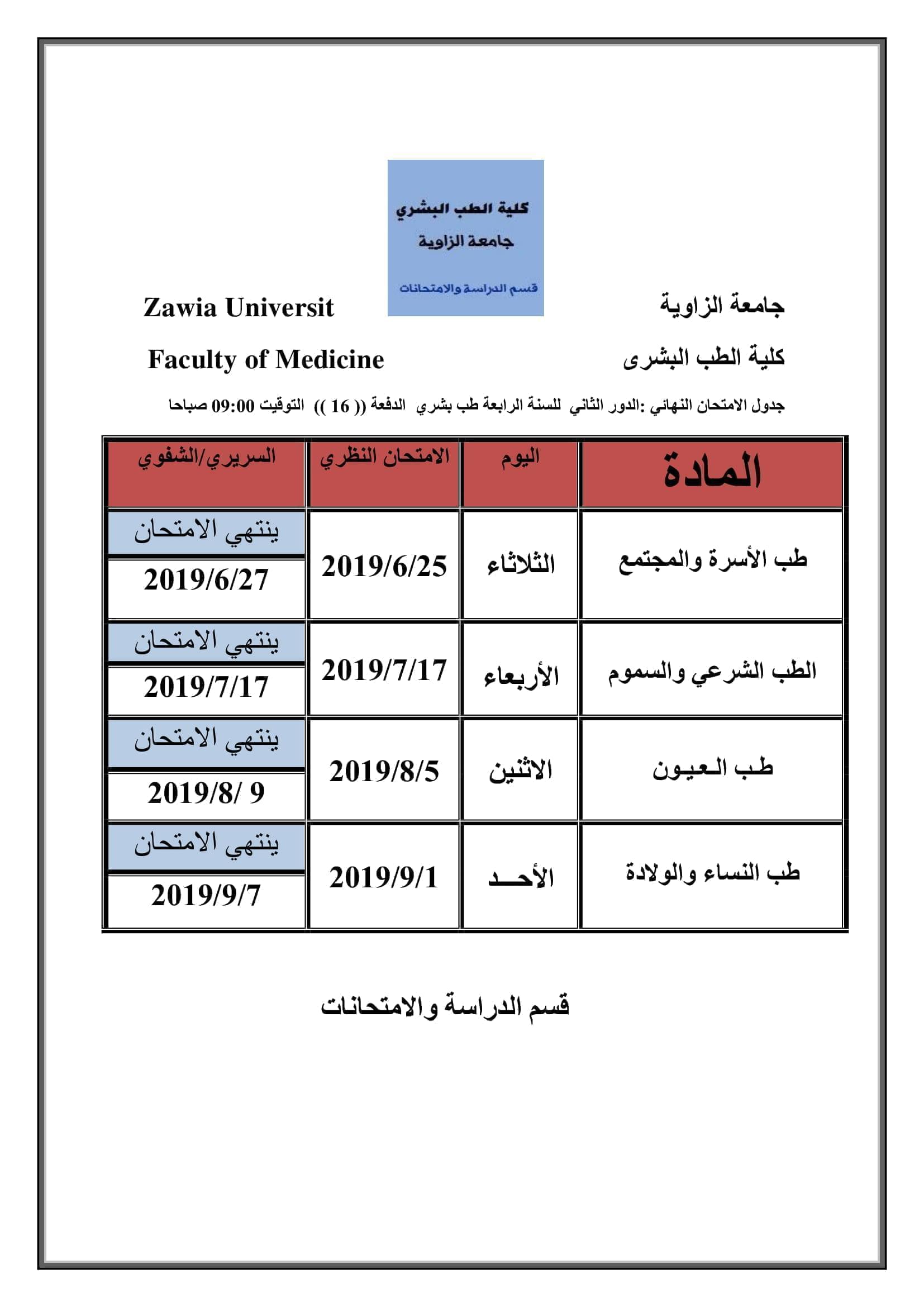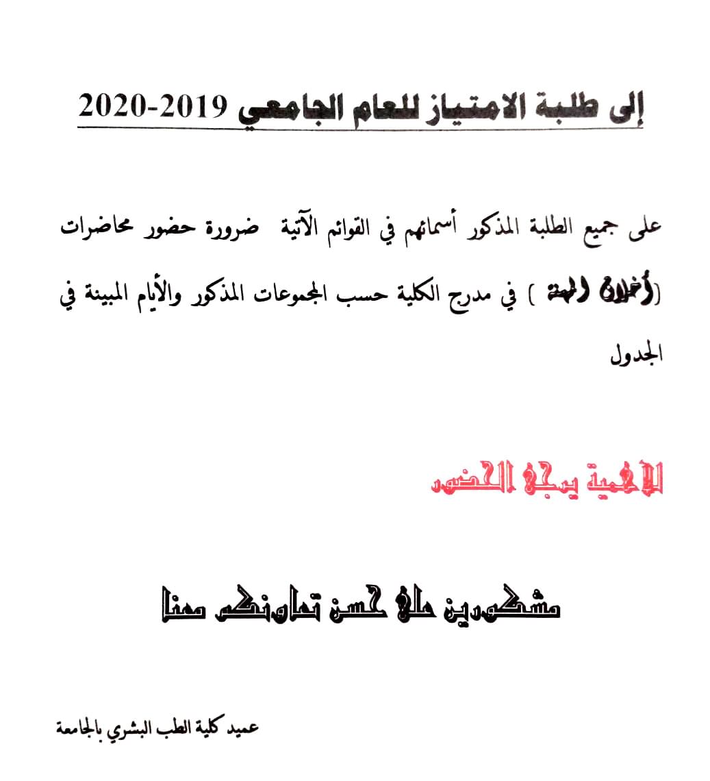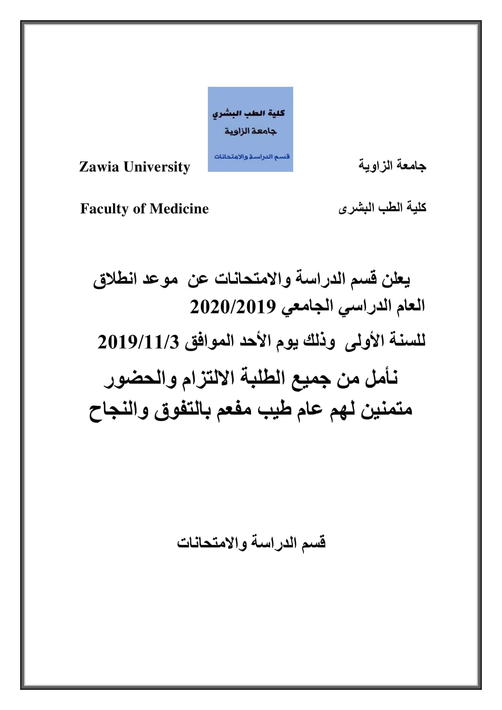 يعلن قسم الدراسة والامتحانات بكلية الطب البشري ان بداية العام الدراسي لسنة الخامسة الدفعة 15 هو 1-4-2019