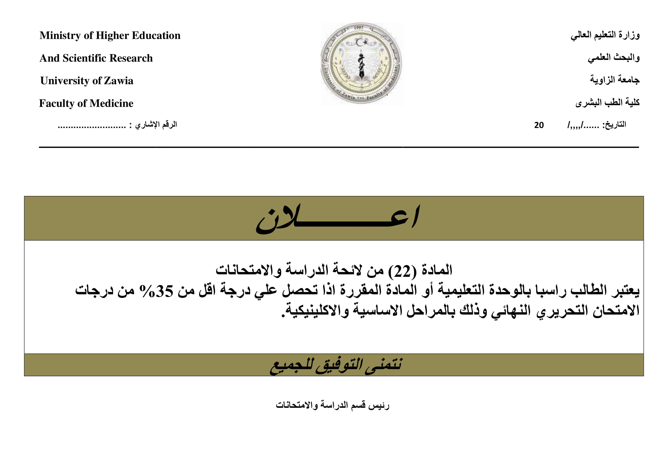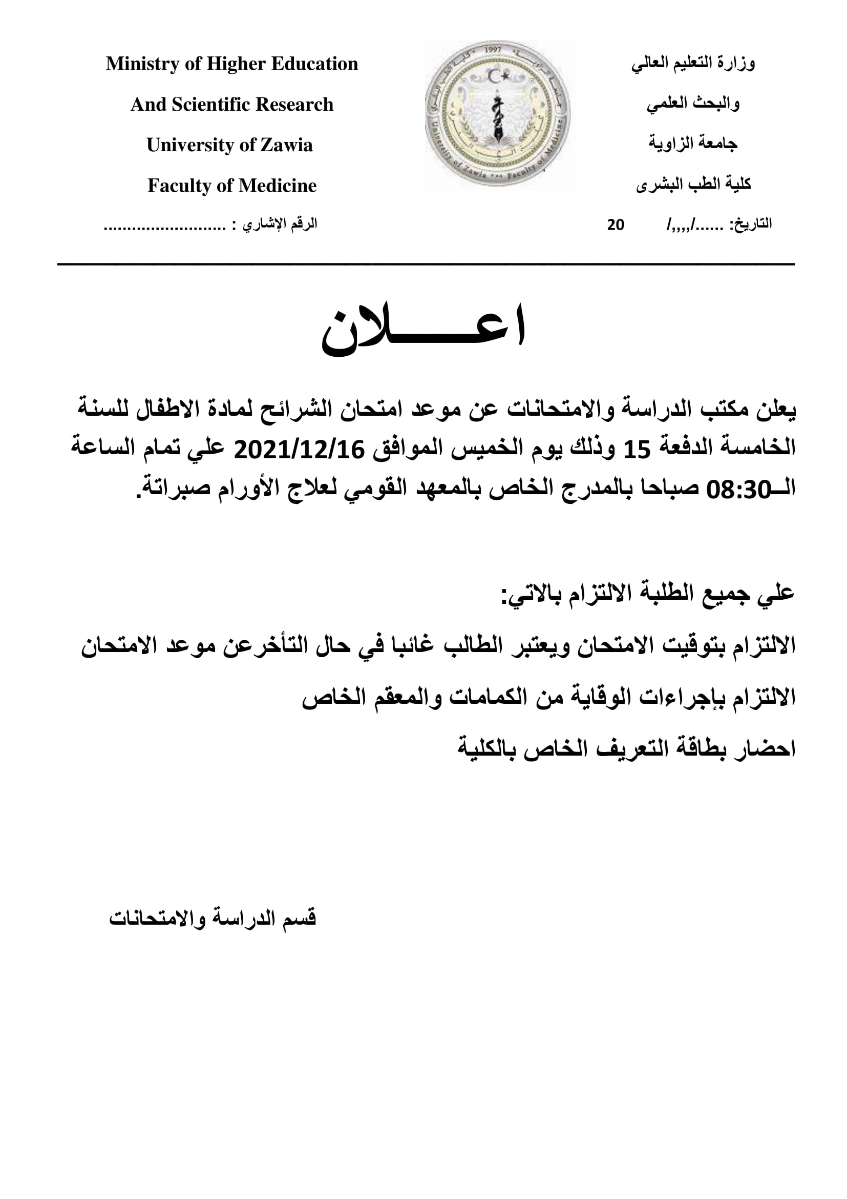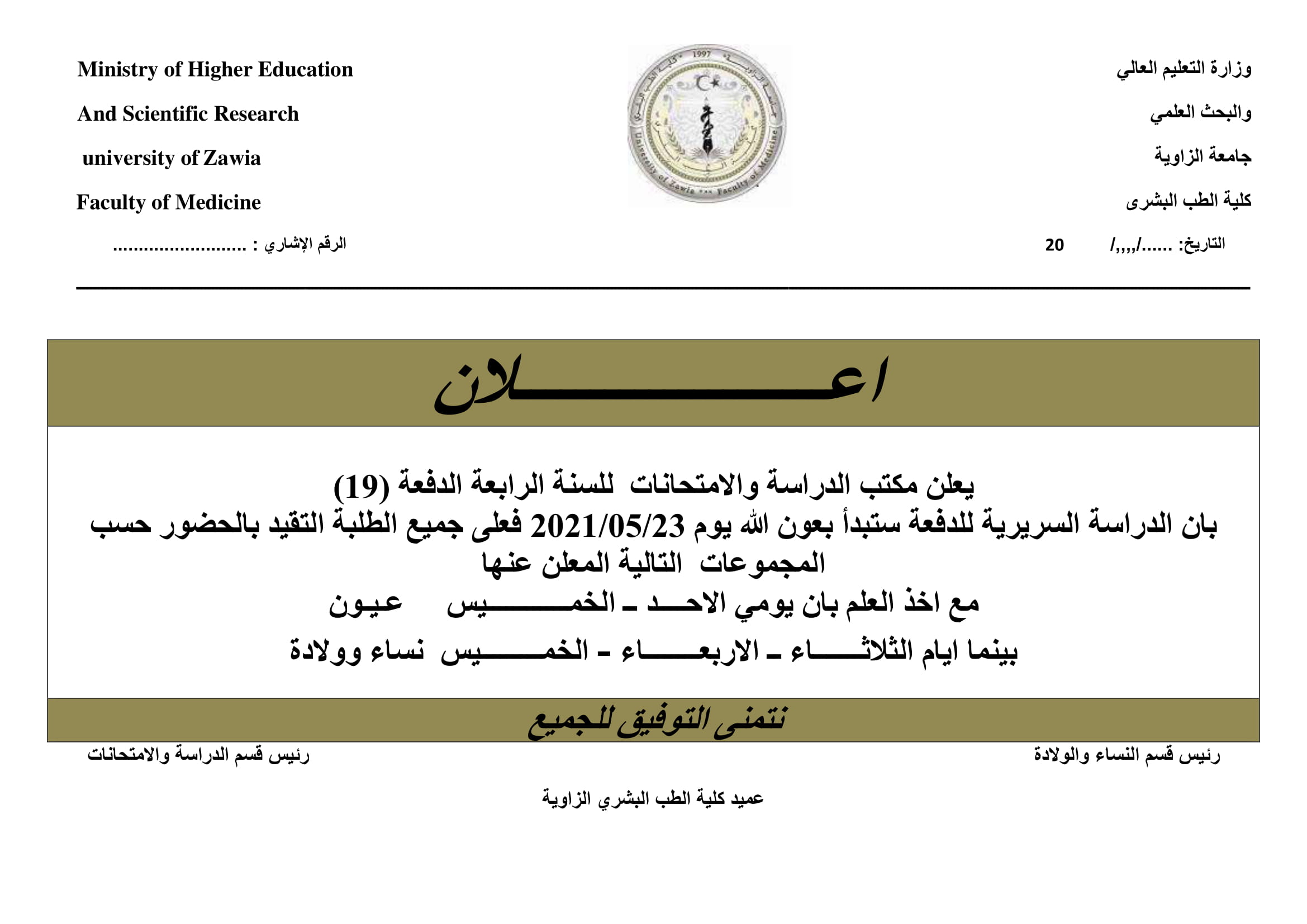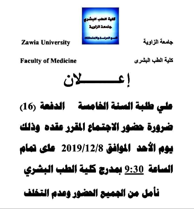 يعلن قسم الدراسة والامتحانات بكلية الطب البشري ان بداية العام الدراسي لسنة الخامسة الدفعة 15 هو 1-4-2019