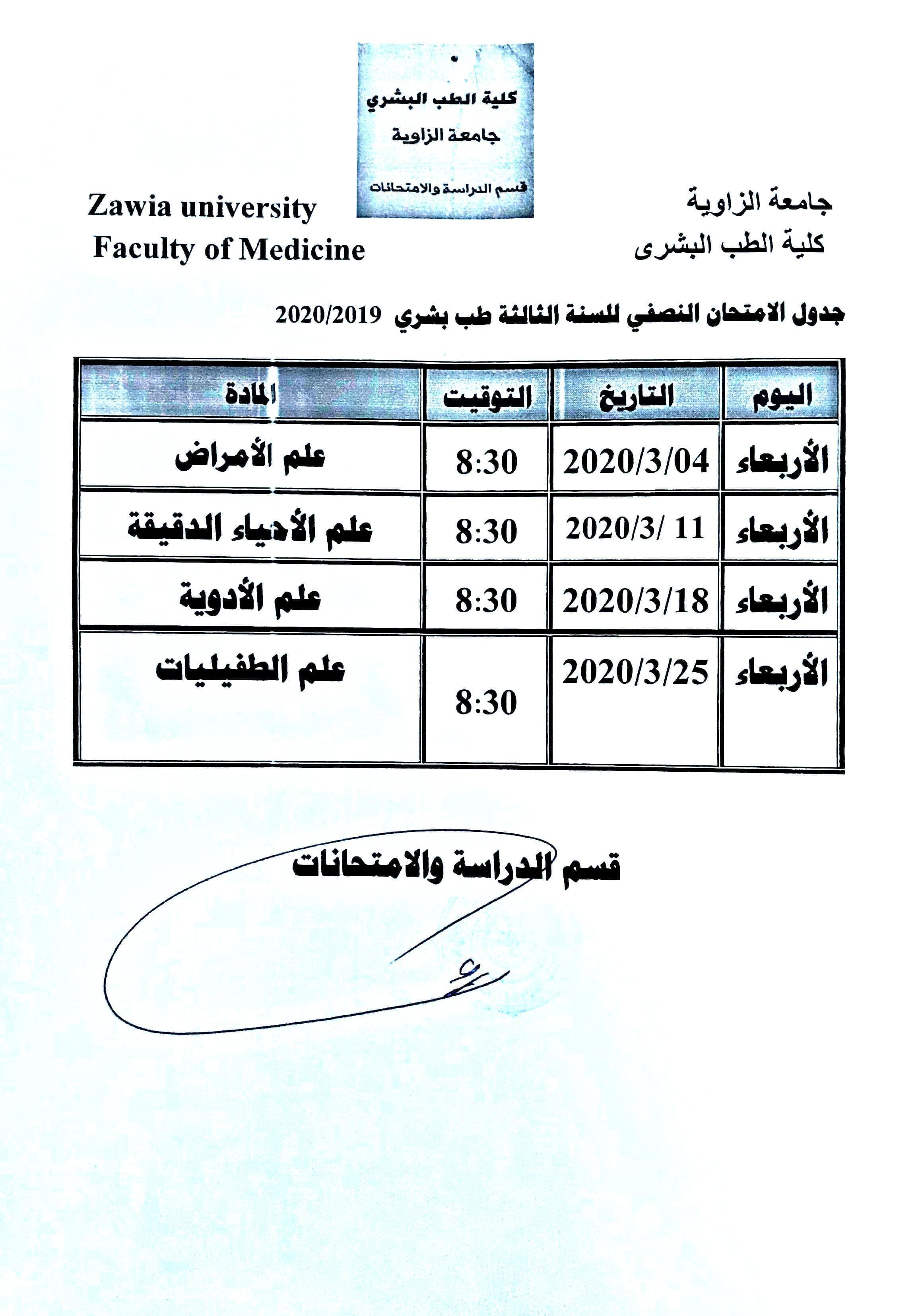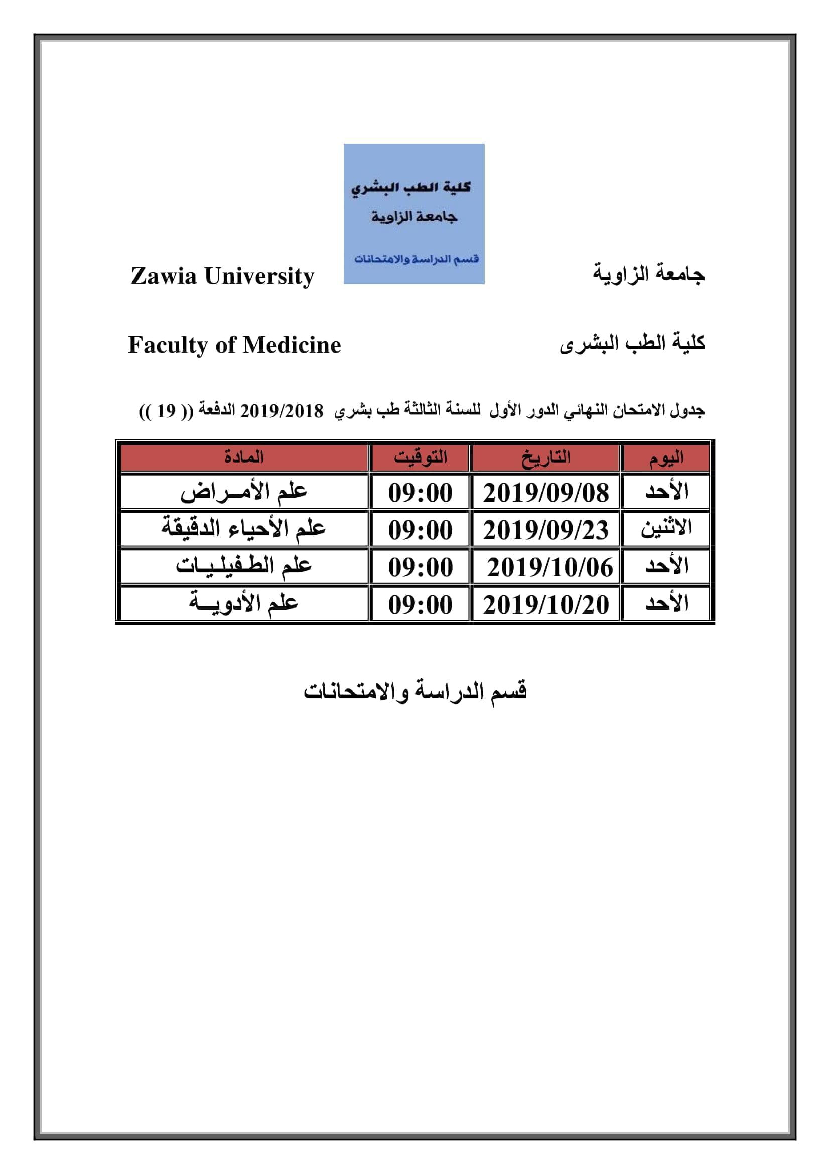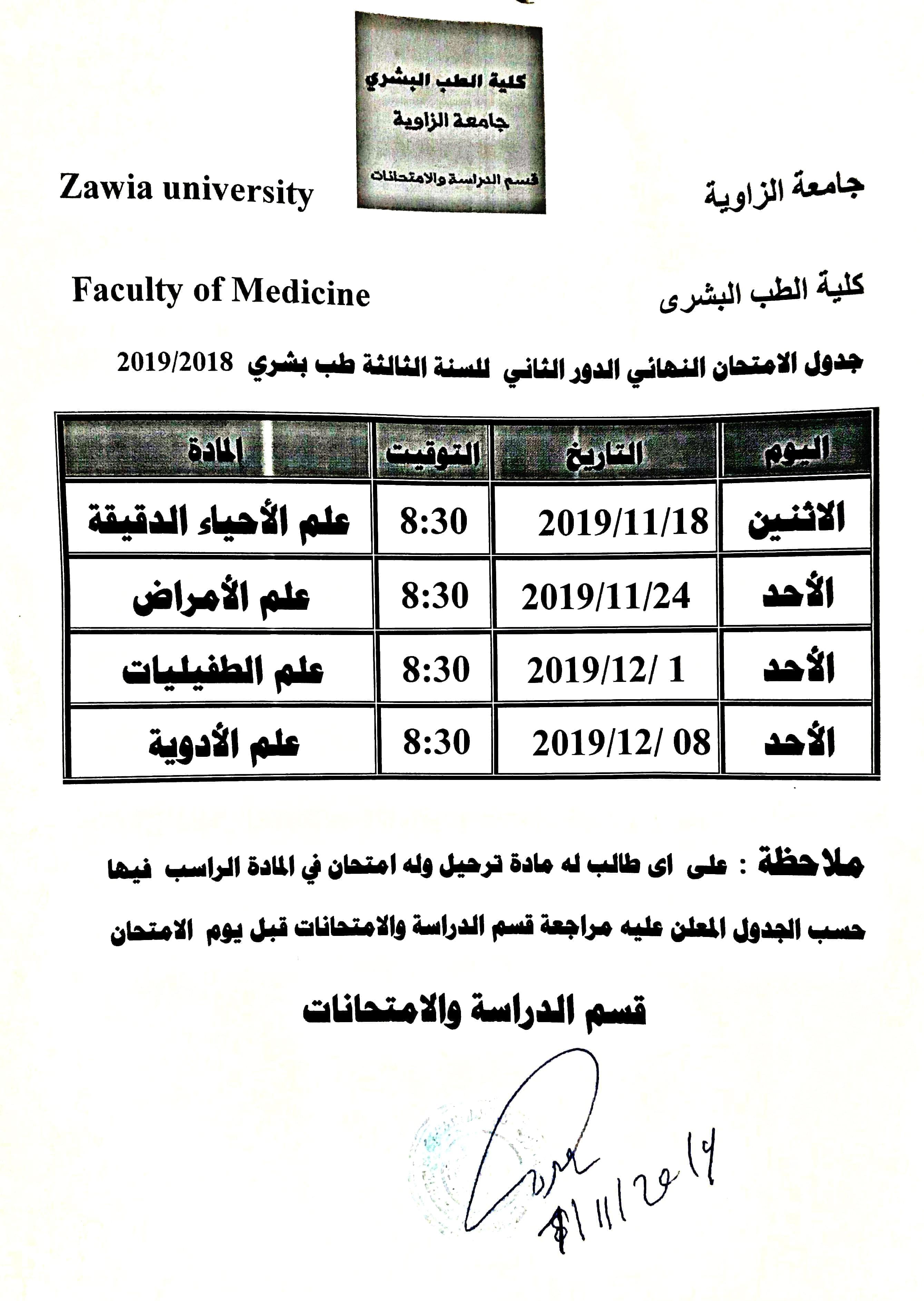 جدول الإمتحان النهائي (الدور الأول) للسنة الثالثة طب بشري للعام الجامعي 2018-2019 ومرفق بقوائم الطلبة المستهدفين لدخول الإمتحانات للمواد الآتية: