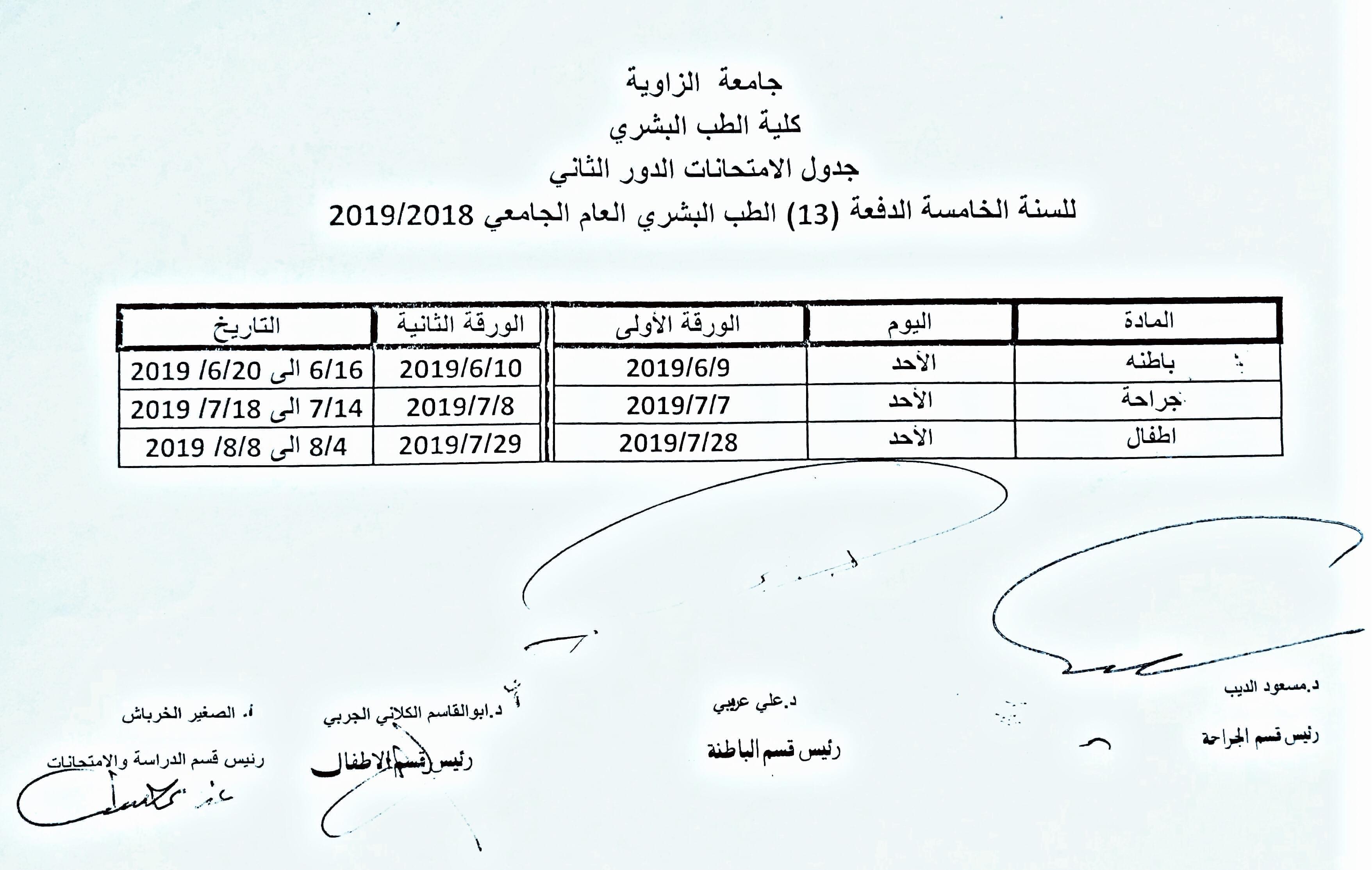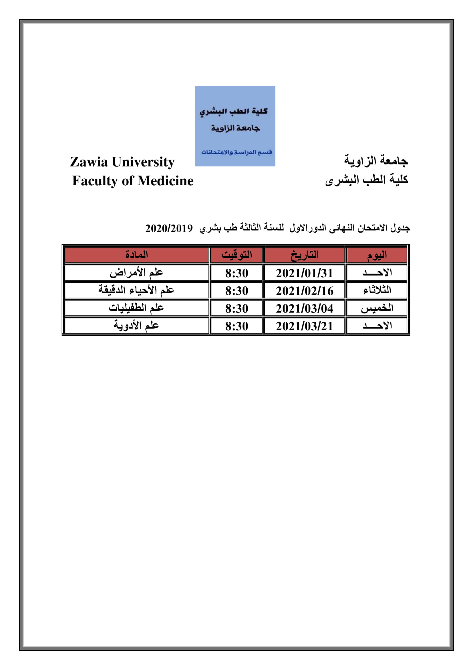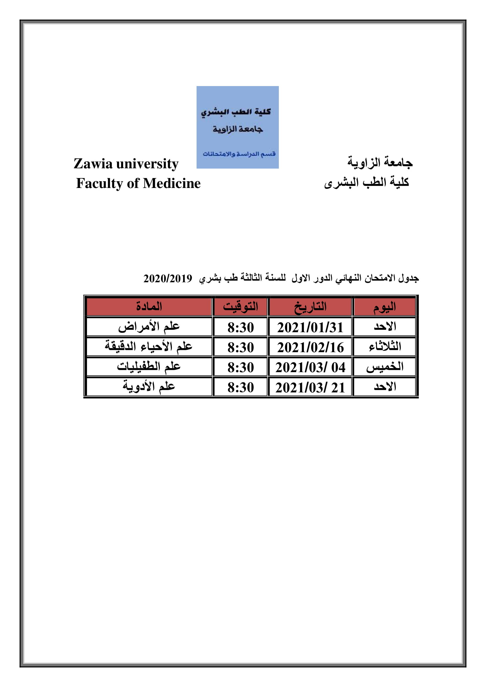 جدول الإمتحان النهائي (الدور الأول) للسنة الثالثة طب بشري للعام الجامعي 2018-2019 ومرفق بقوائم الطلبة المستهدفين لدخول الإمتحانات للمواد الآتية: