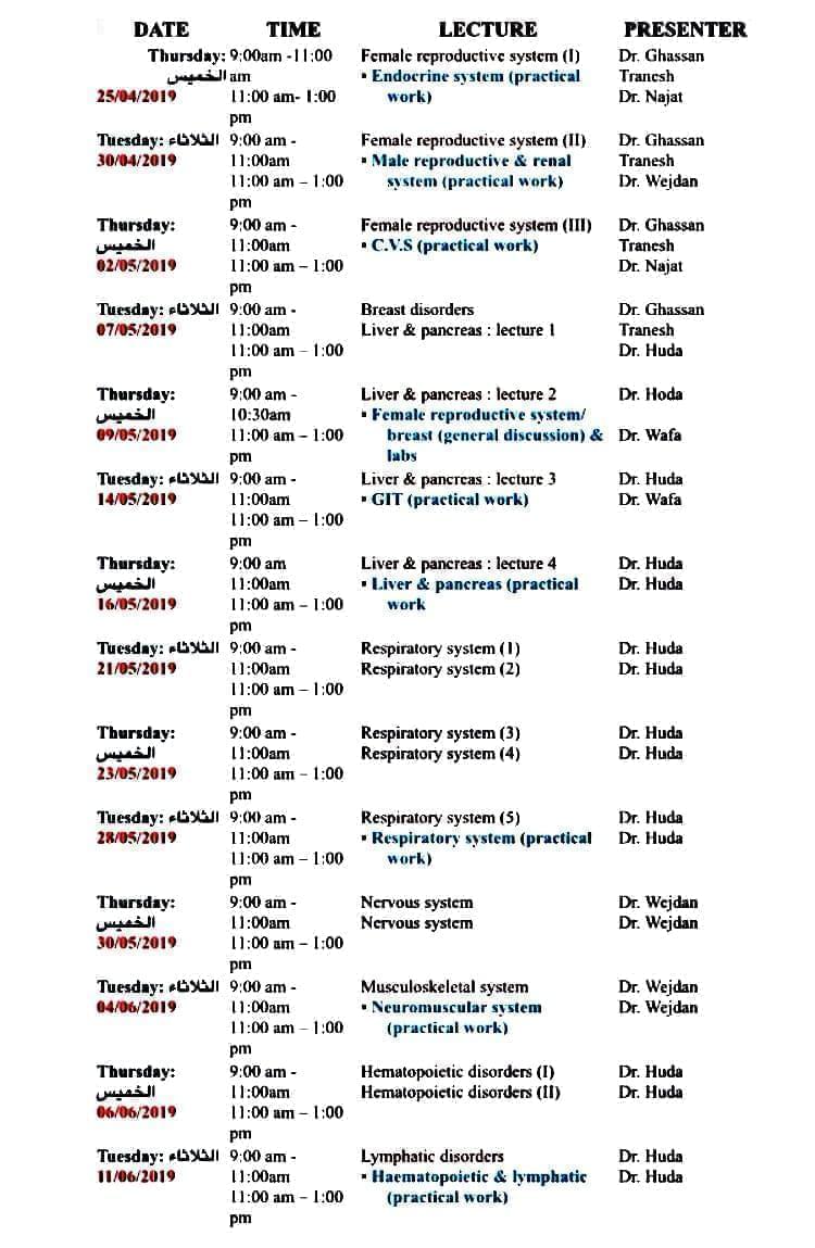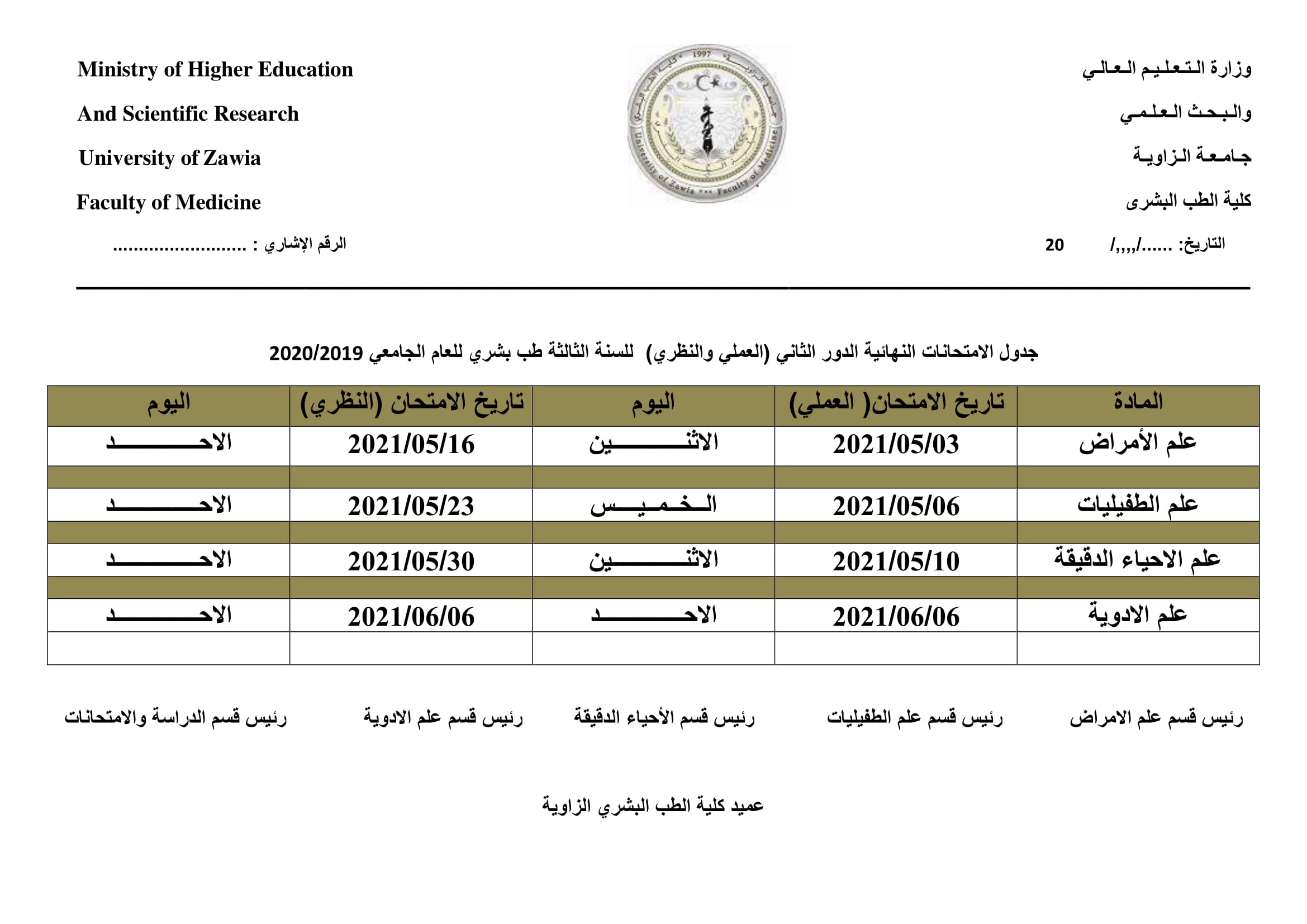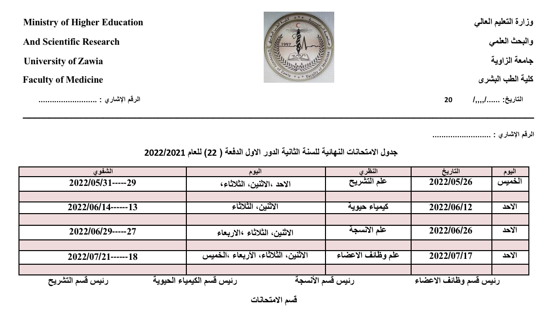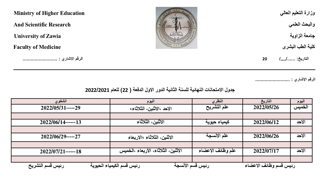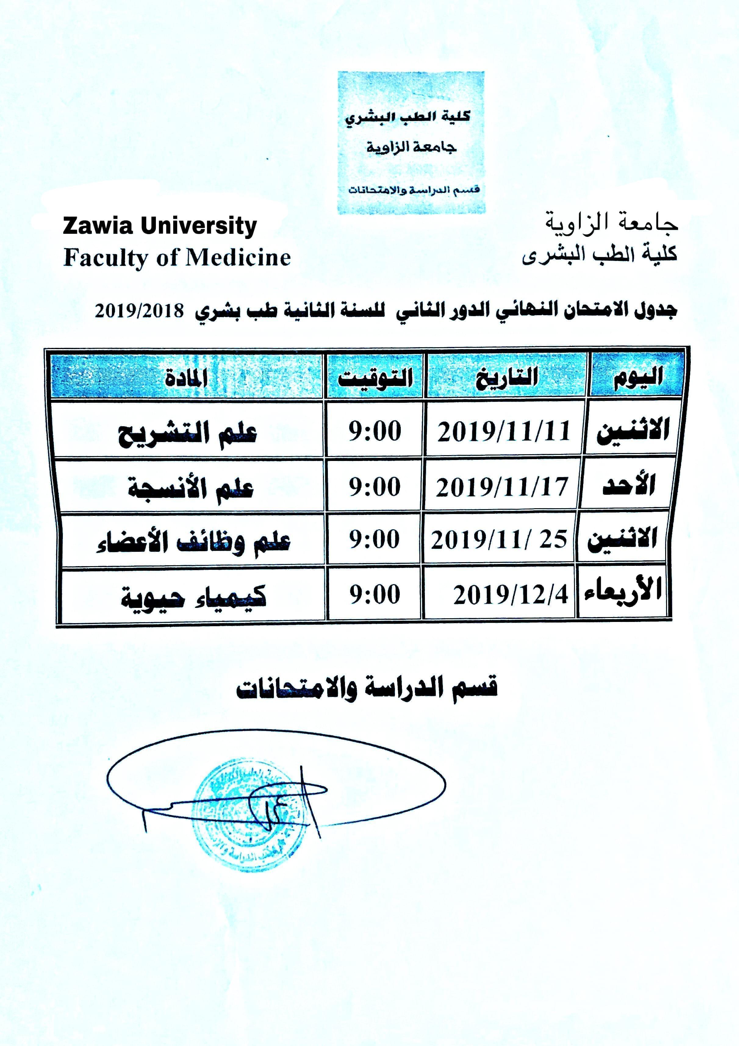 جدول الامتحانات النهائيه الدور الأول (العملي والنظري) للسنة الثانية طب بشري.
