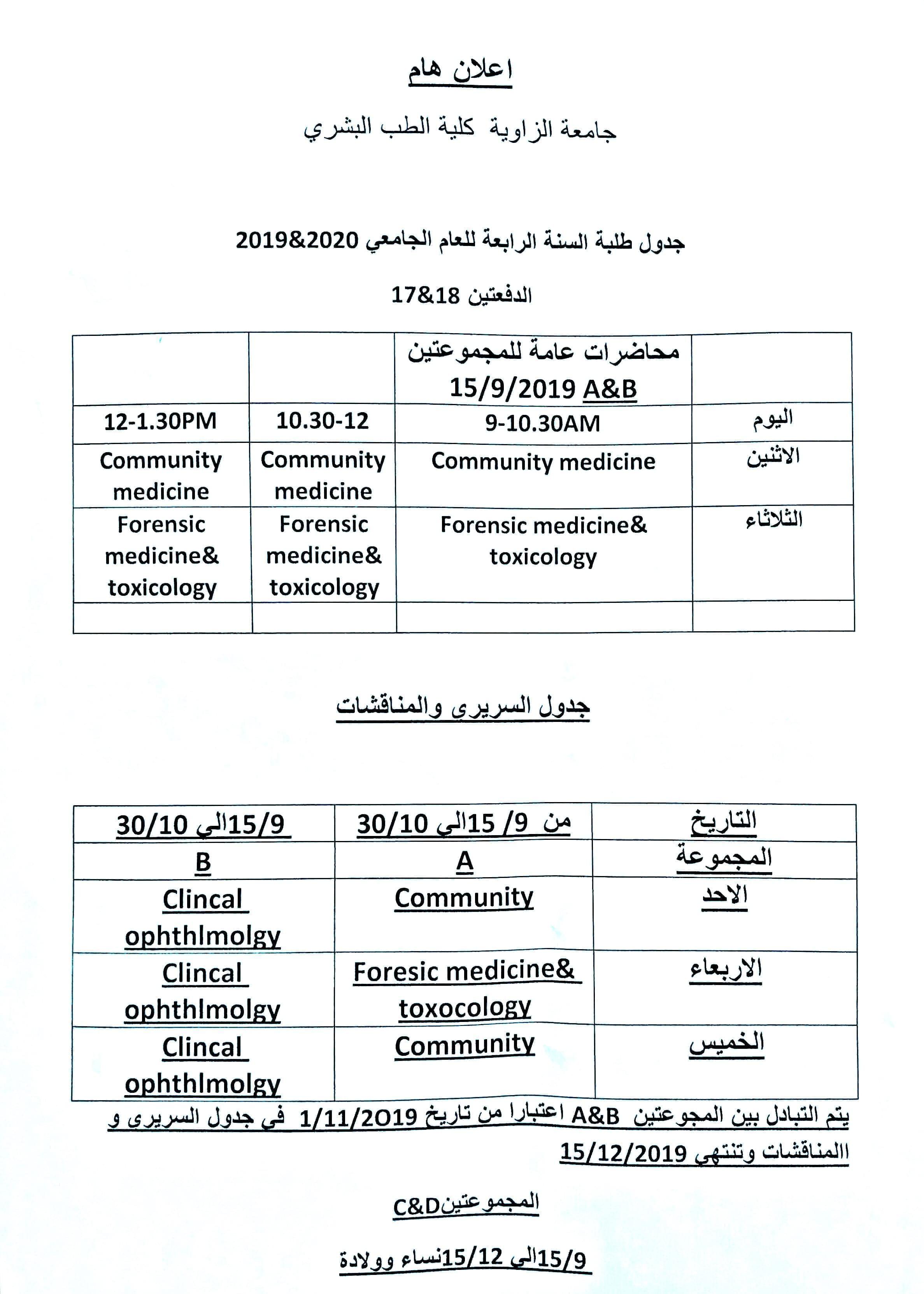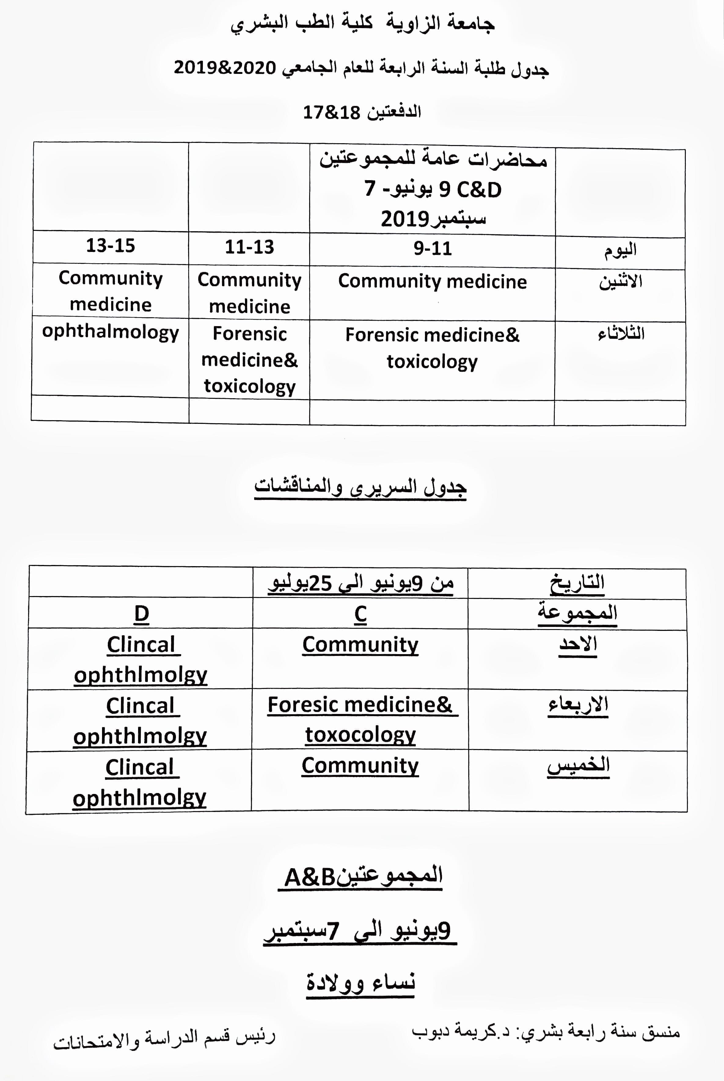 الجدول الدراسي وتقسيم المجموعات للسنة الرابعة طب بشري الدفعتين (18،17) للعام الجامعي 2018-2019