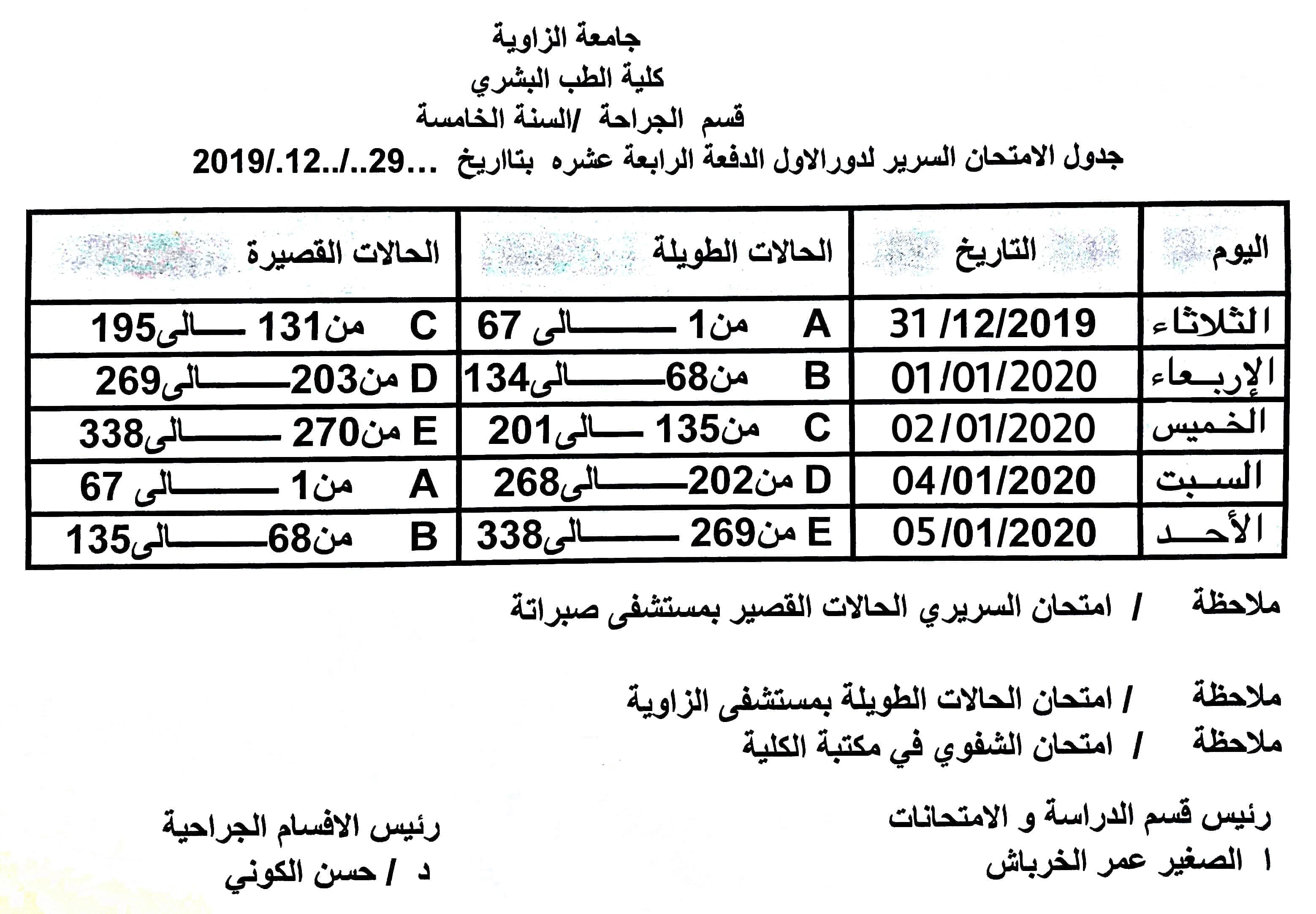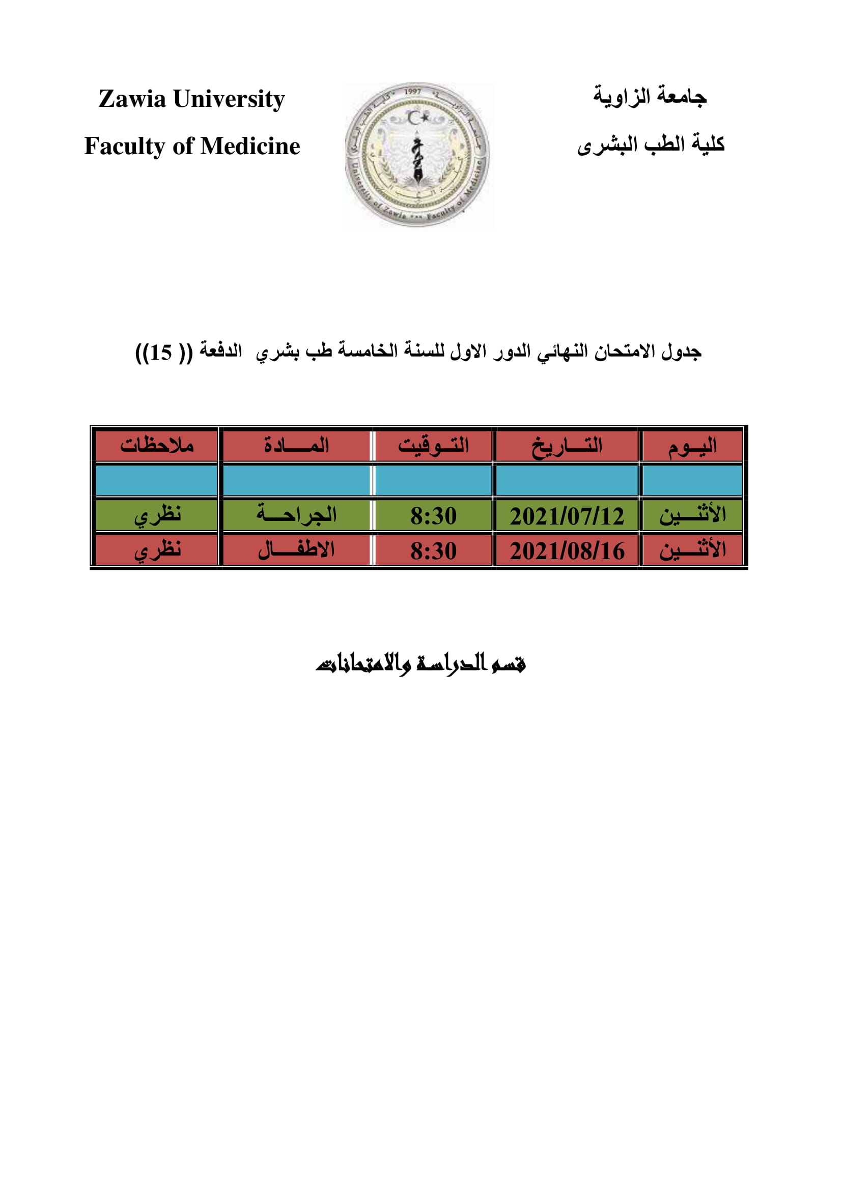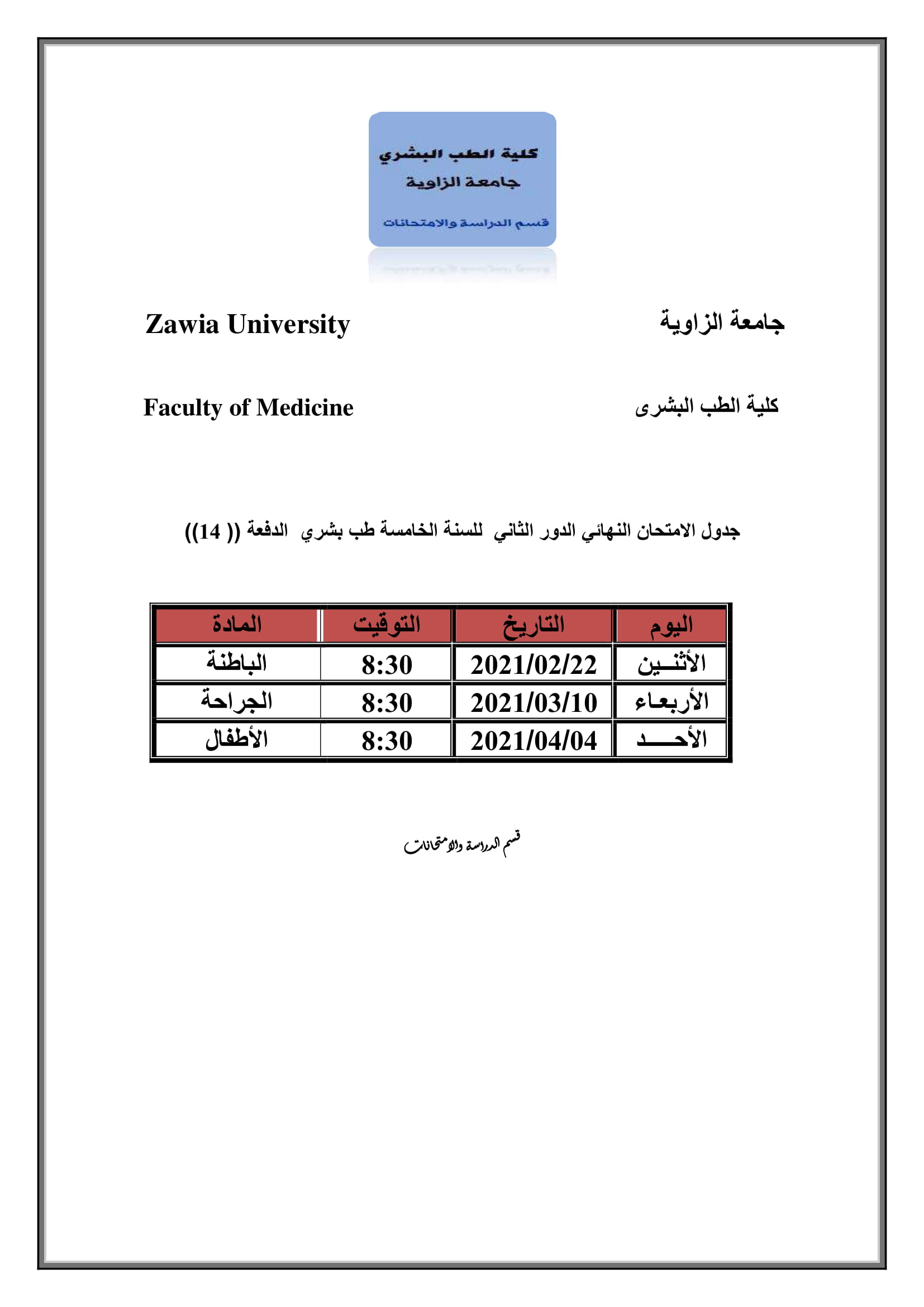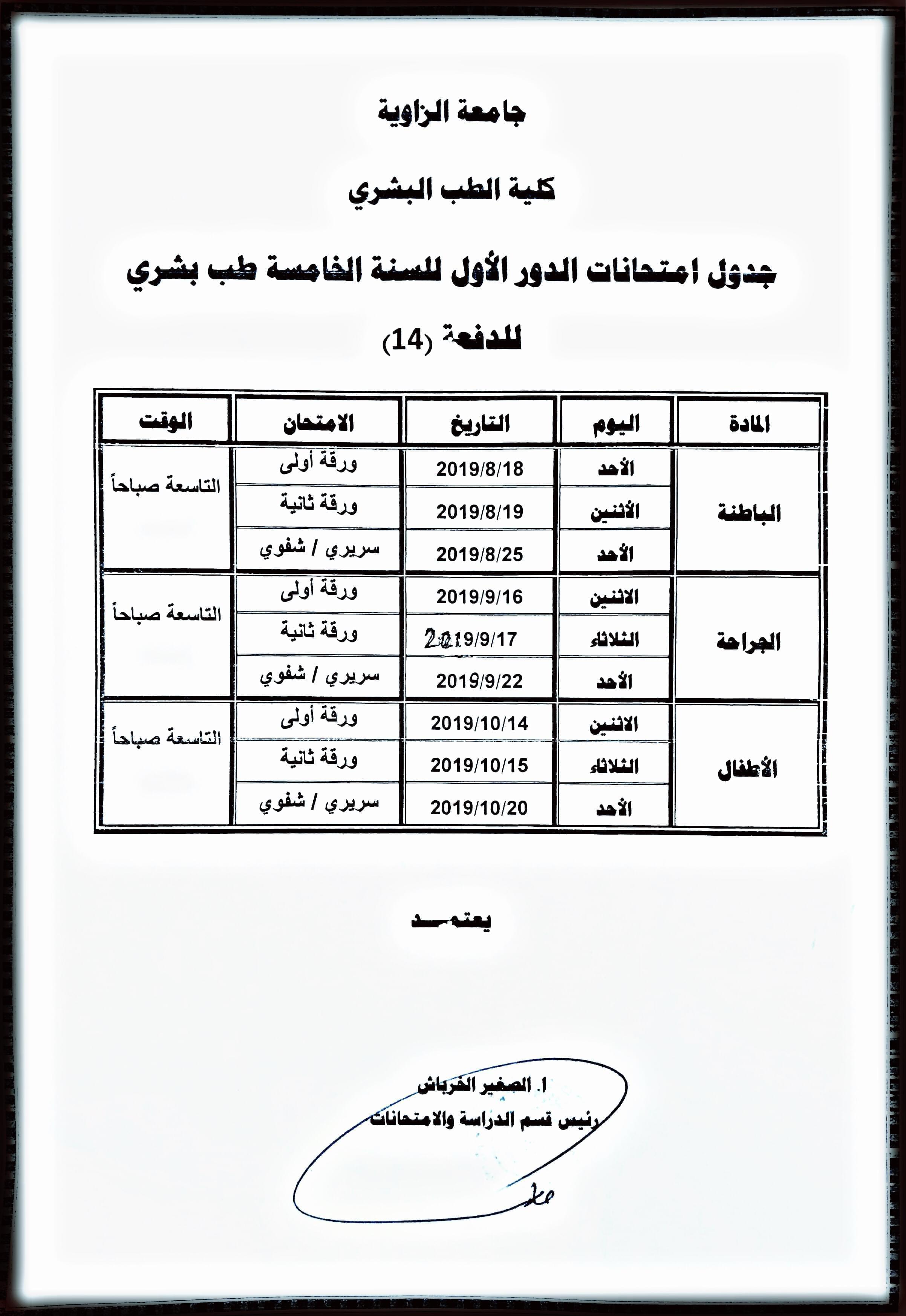 جدول إمتحانات الدور الاول للسنة الخامسة طب بشري الدفعة 14.