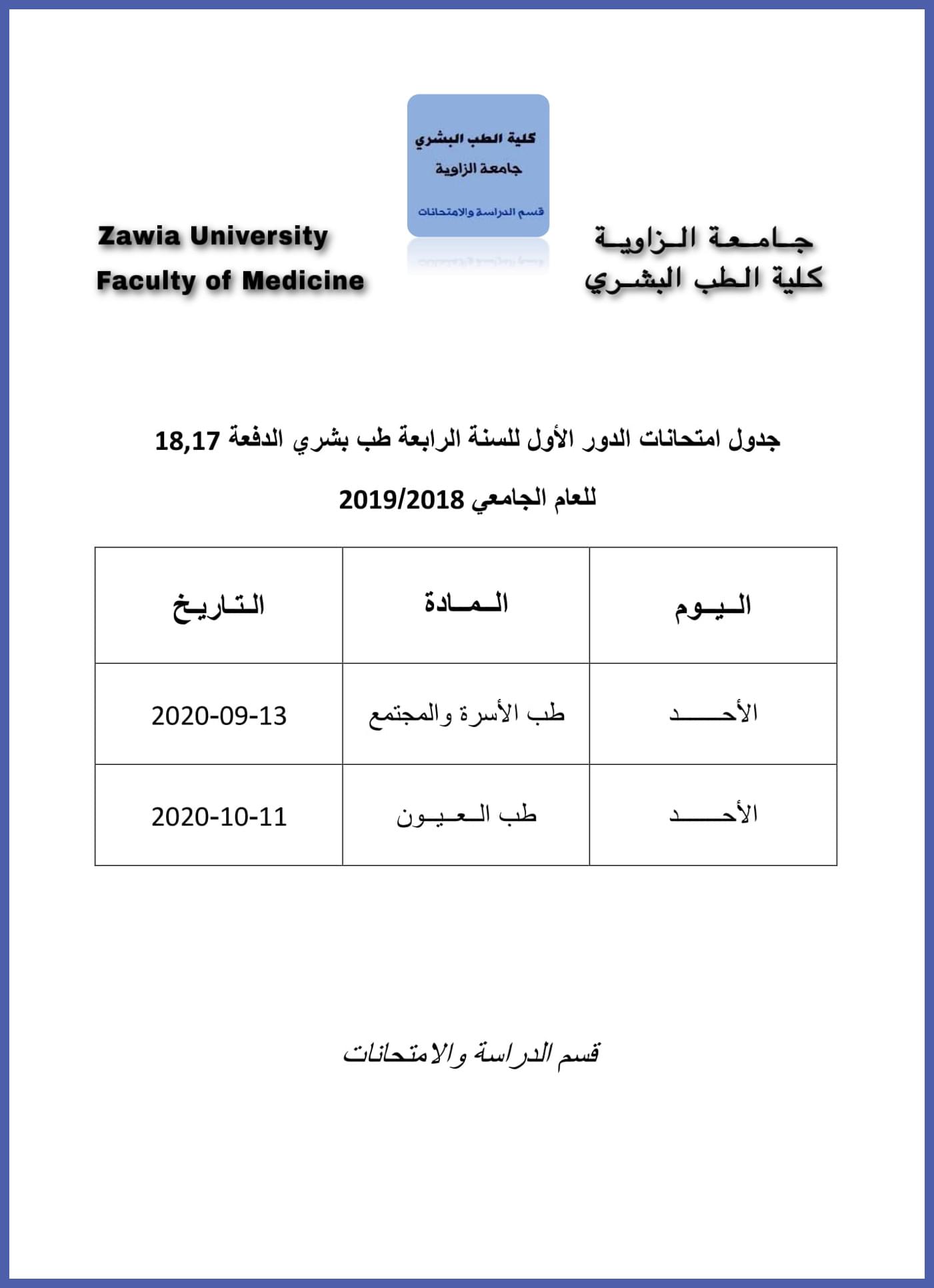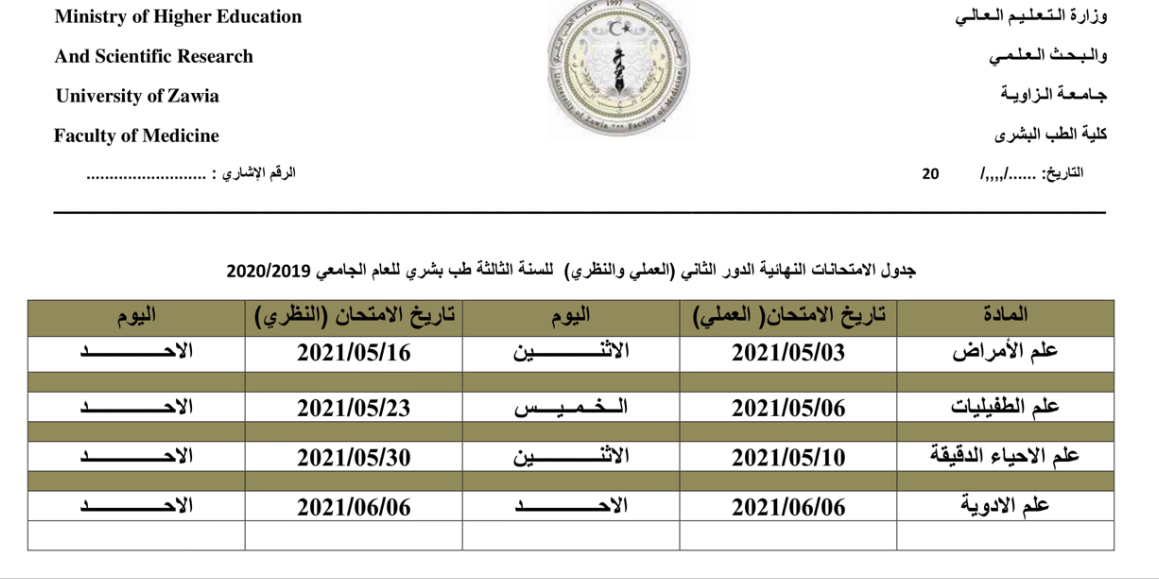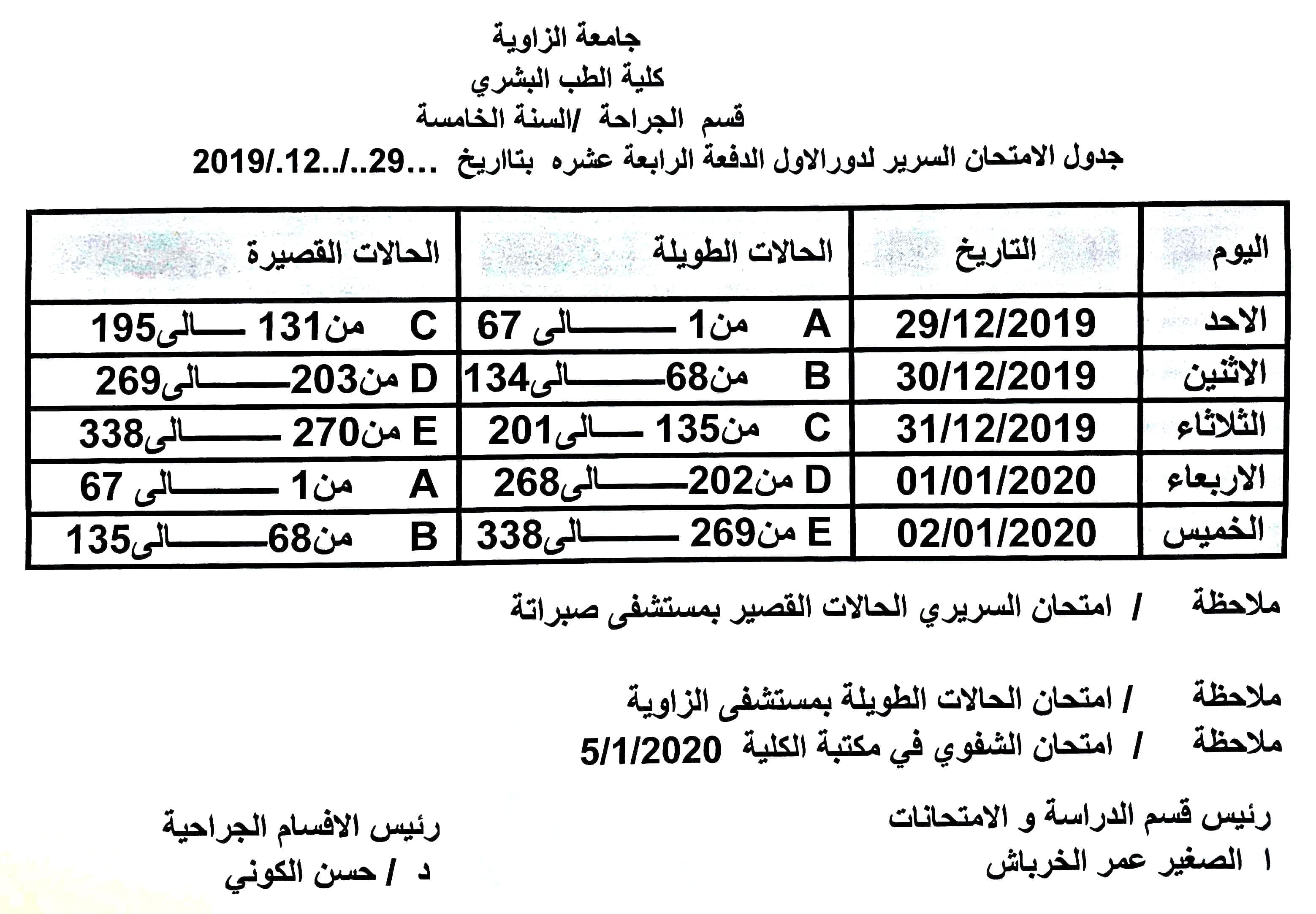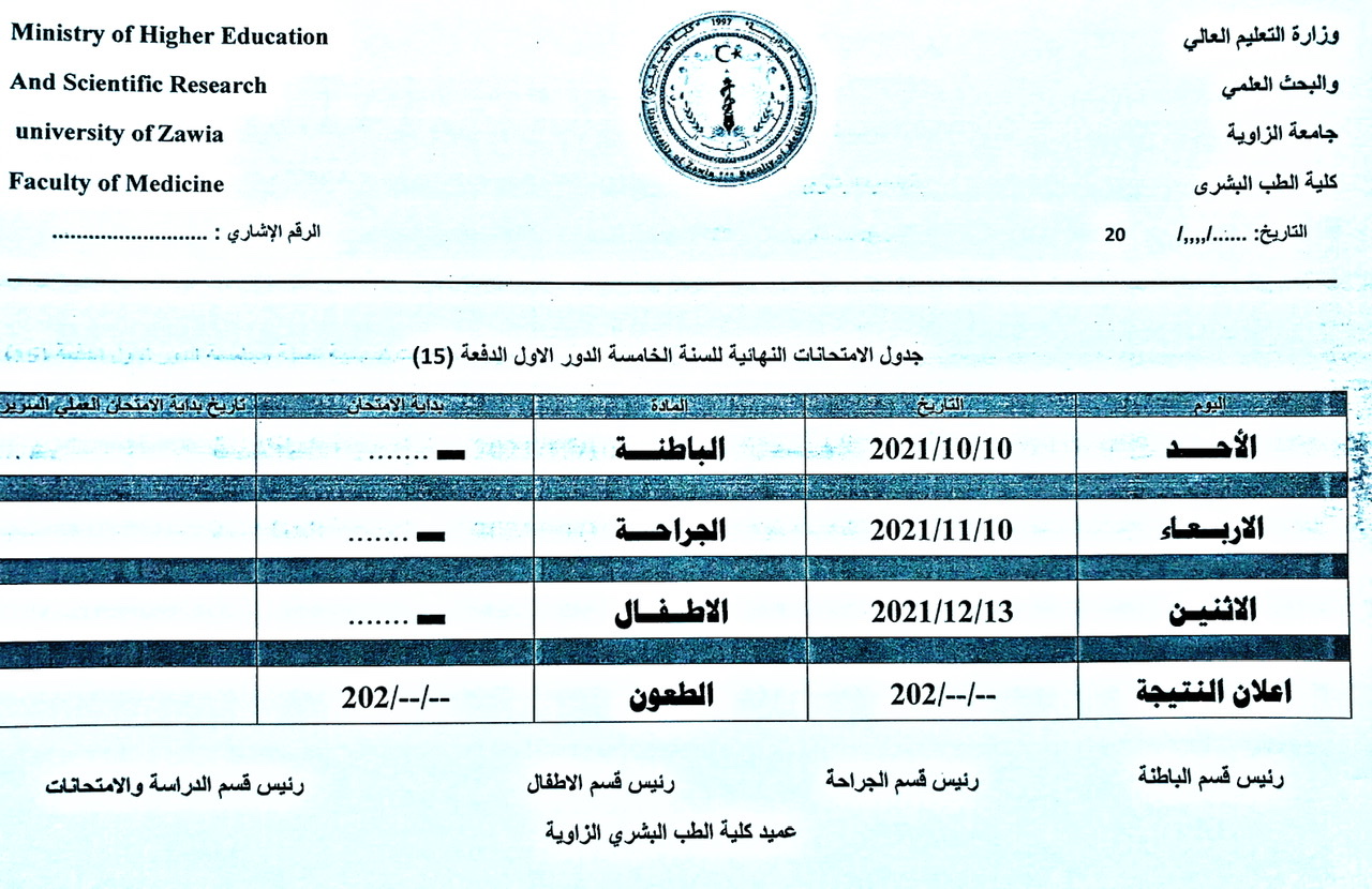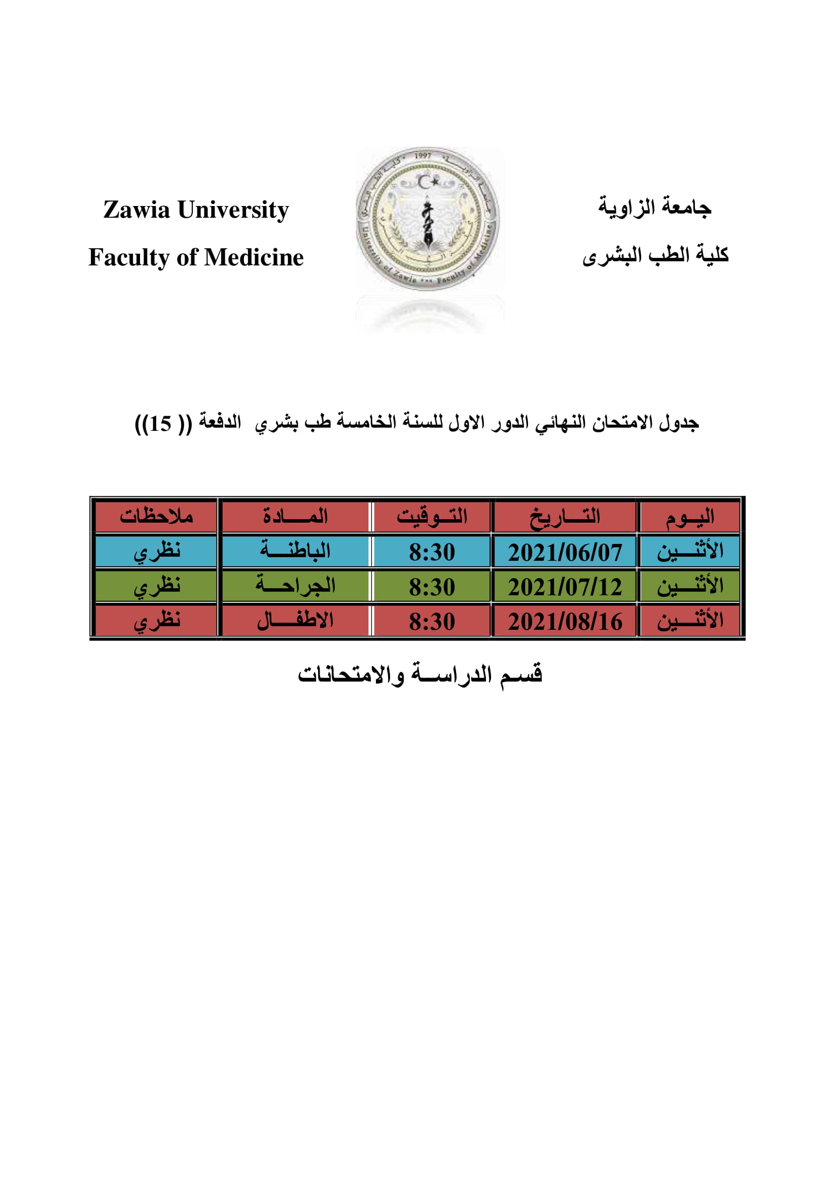 جدول إمتحانات الدور الاول للسنة الخامسة طب بشري الدفعة 14.