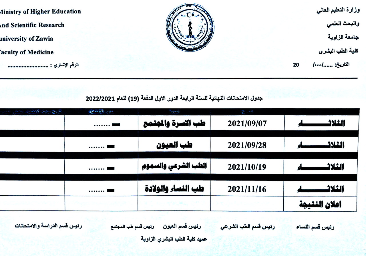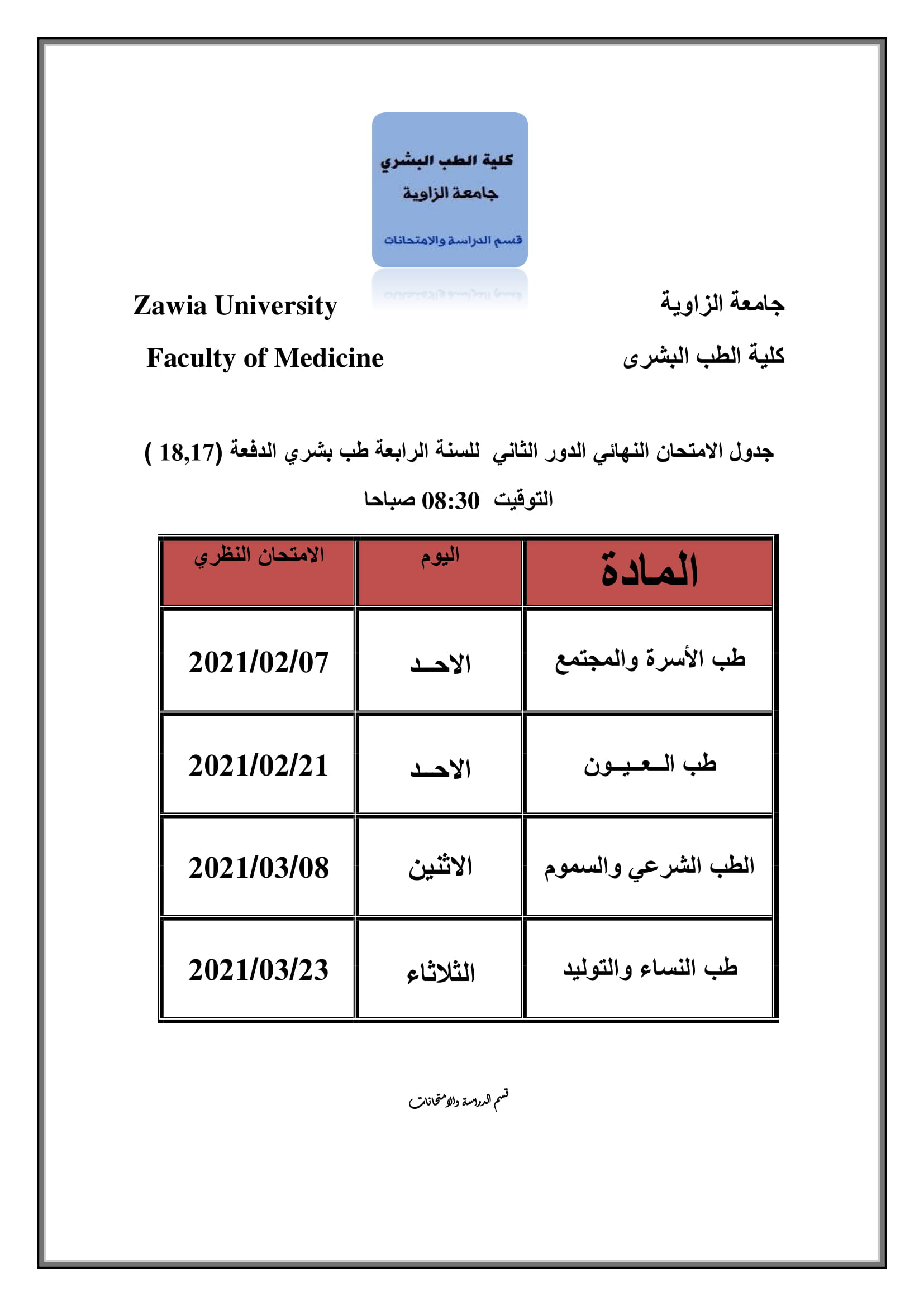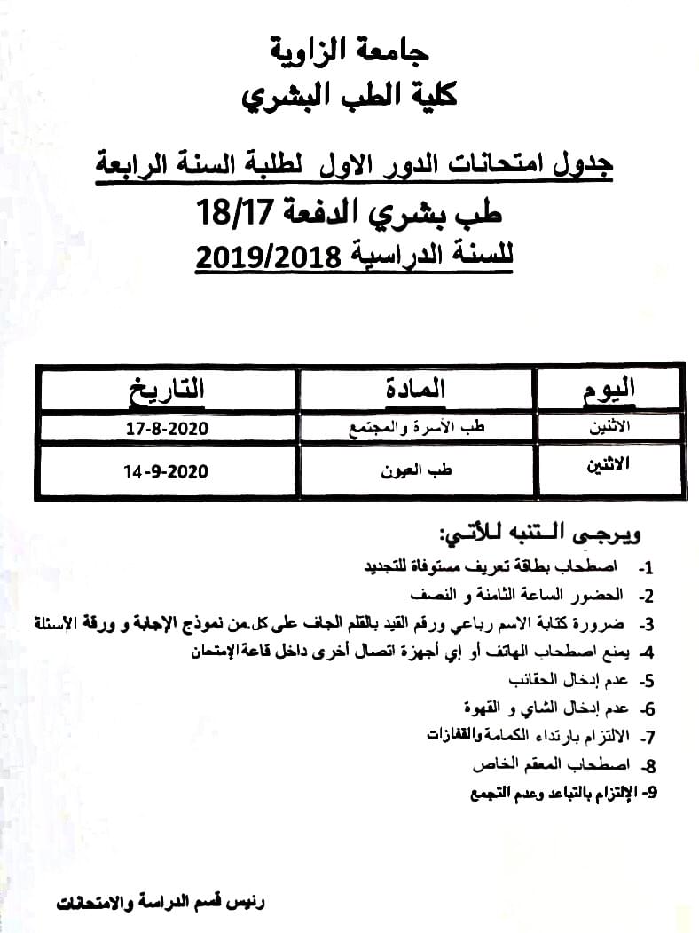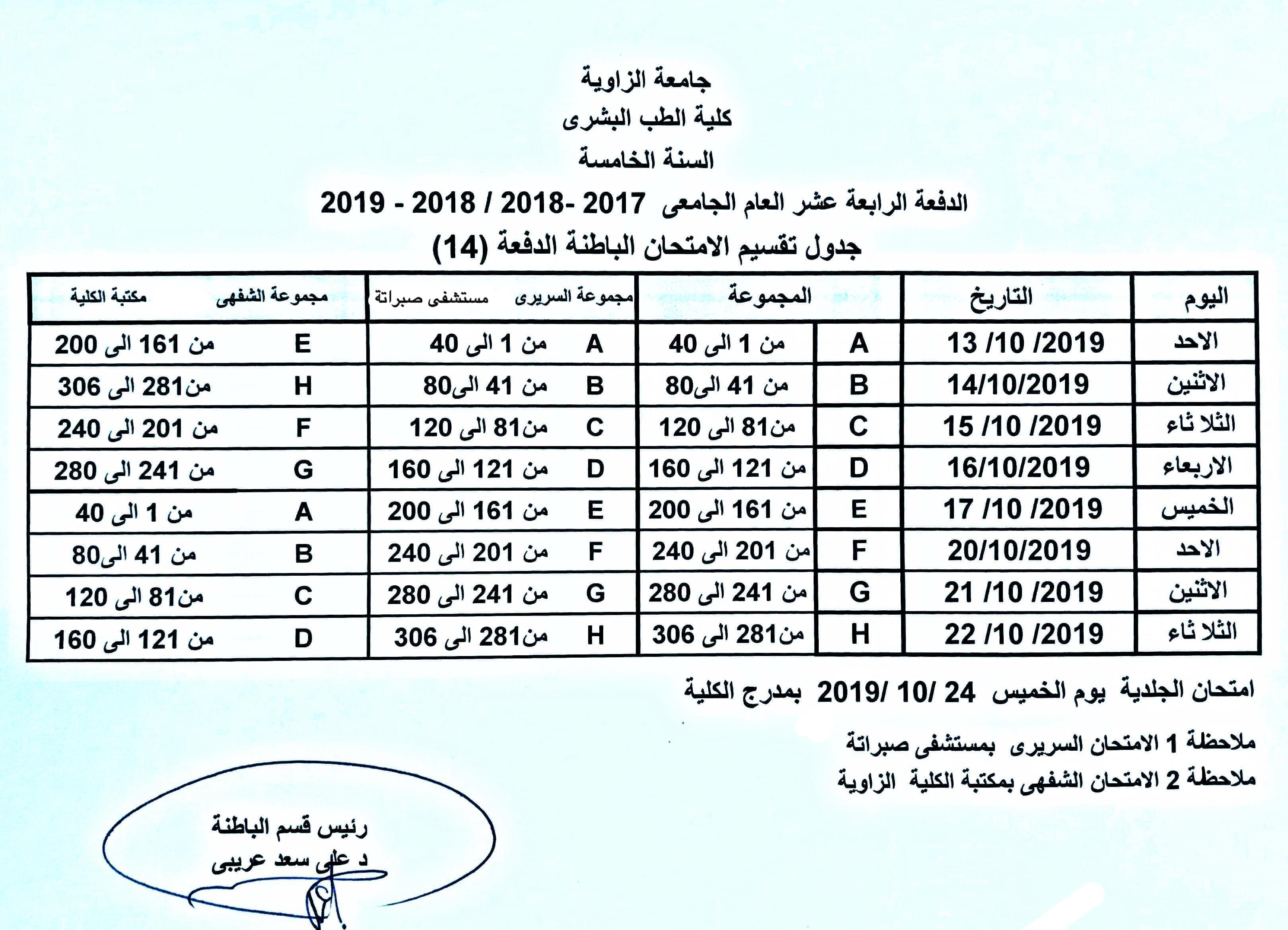 جدول إمتحانات الدور الاول للسنة الخامسة طب بشري الدفعة 14.