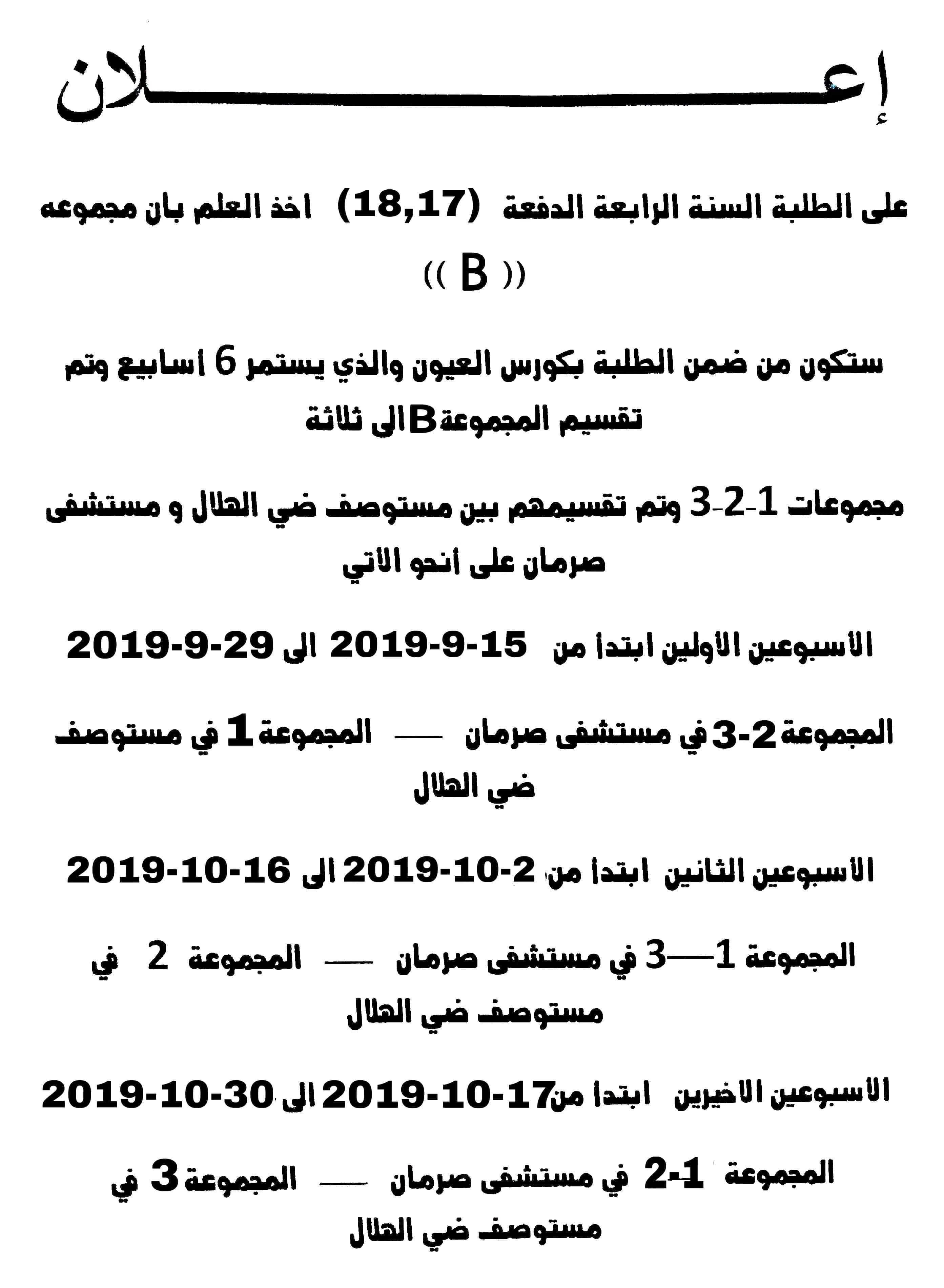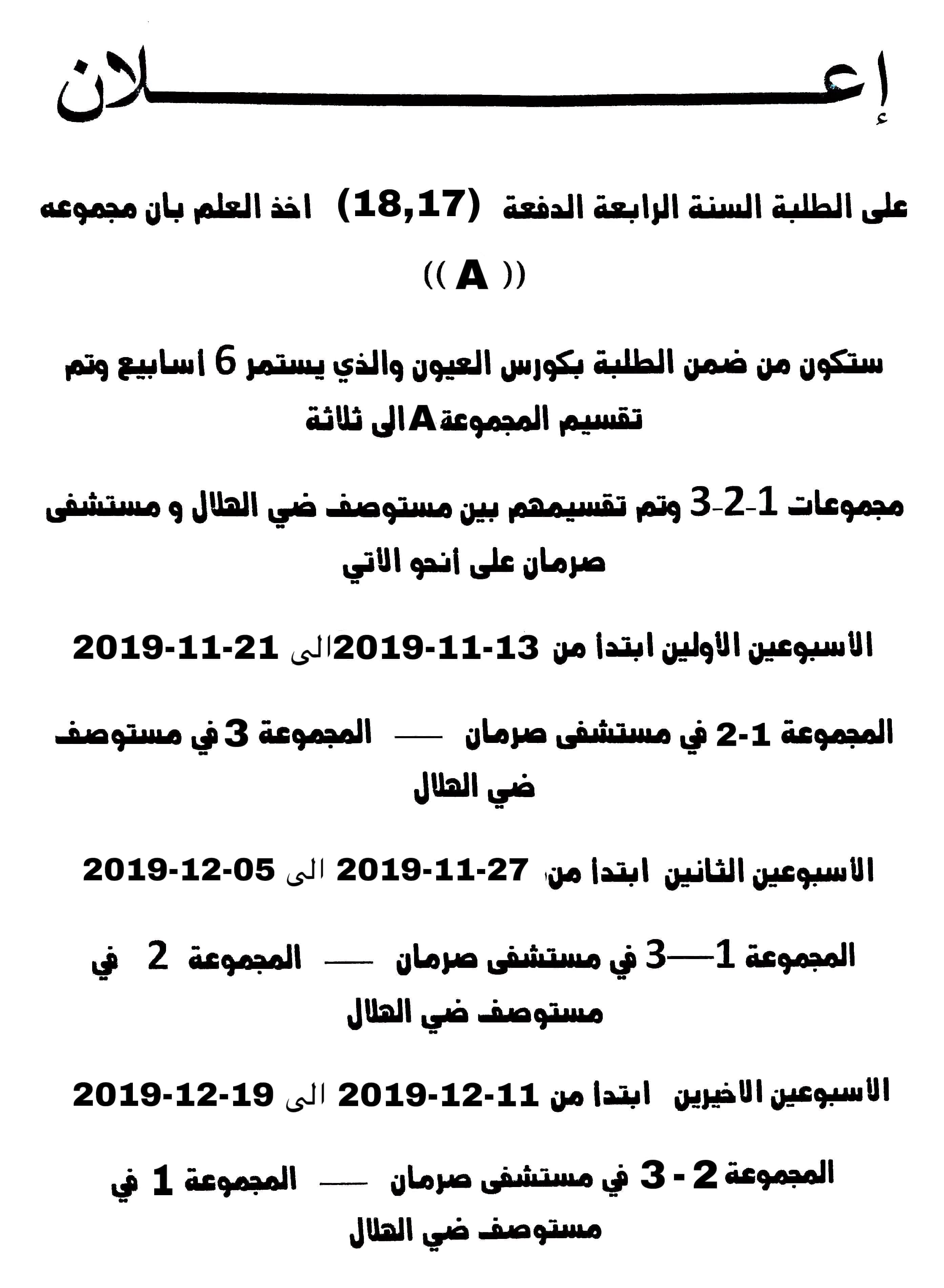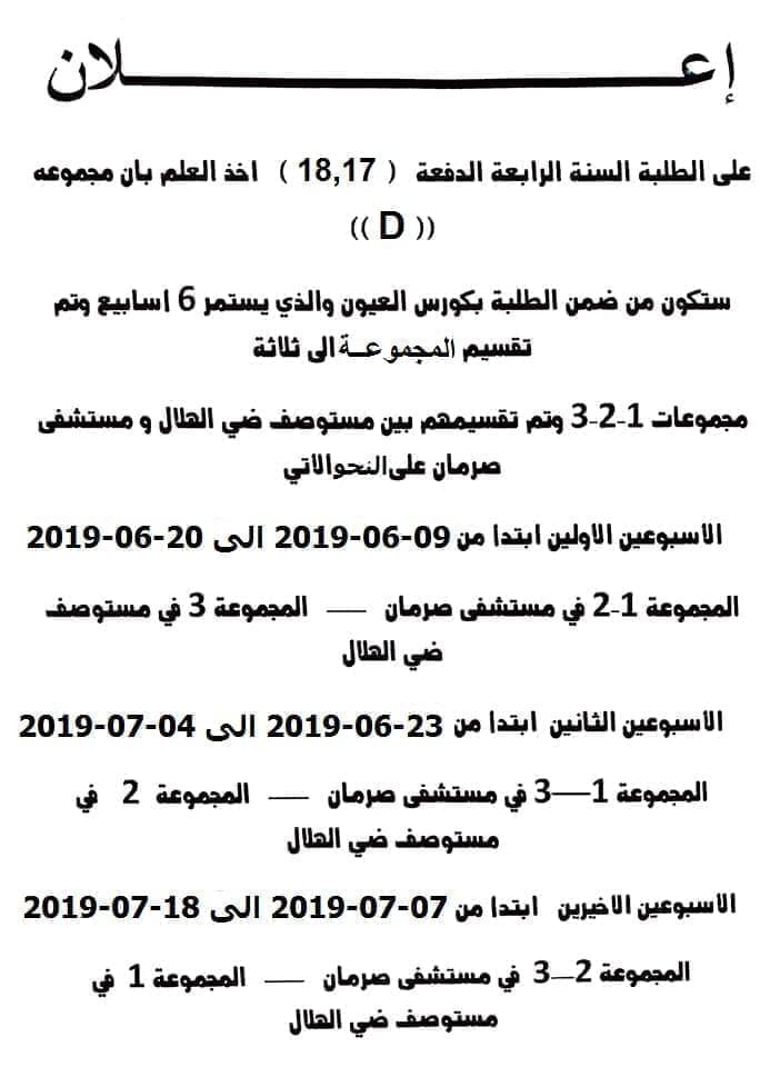 موعد الدراسة وتقسيم المجموعات لمادة طب العيون للسنة الرابعة الدفعة 17-18