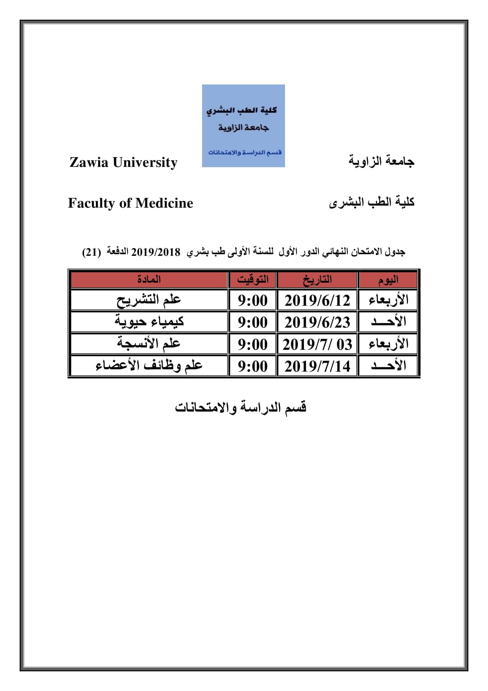 جداول الإمتحانات النهائية (الدور الأول) لسنوات (الإعداد-الأولى-الثانية-الثالثة) طب بشري للعام الجامعي 2018-2019