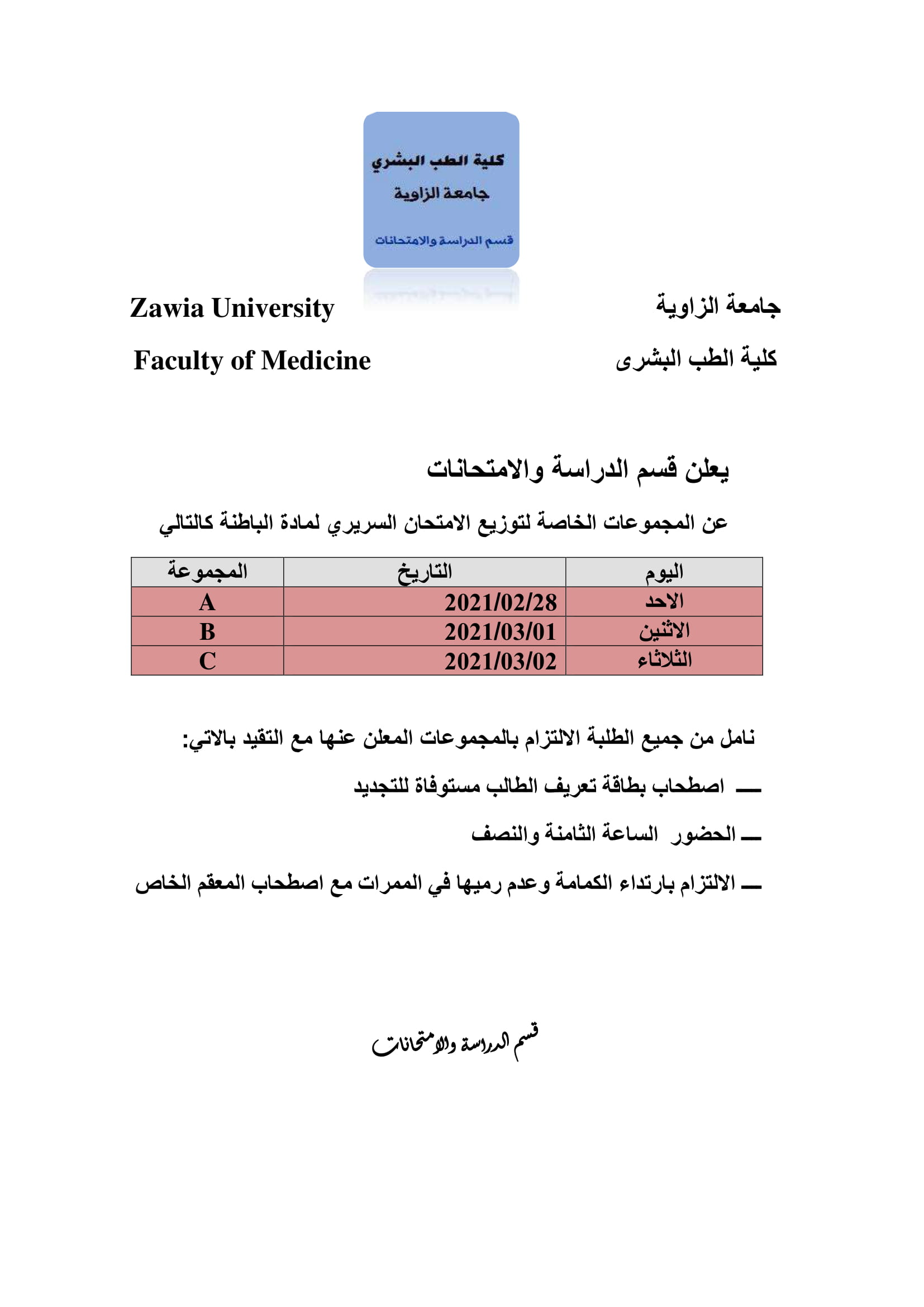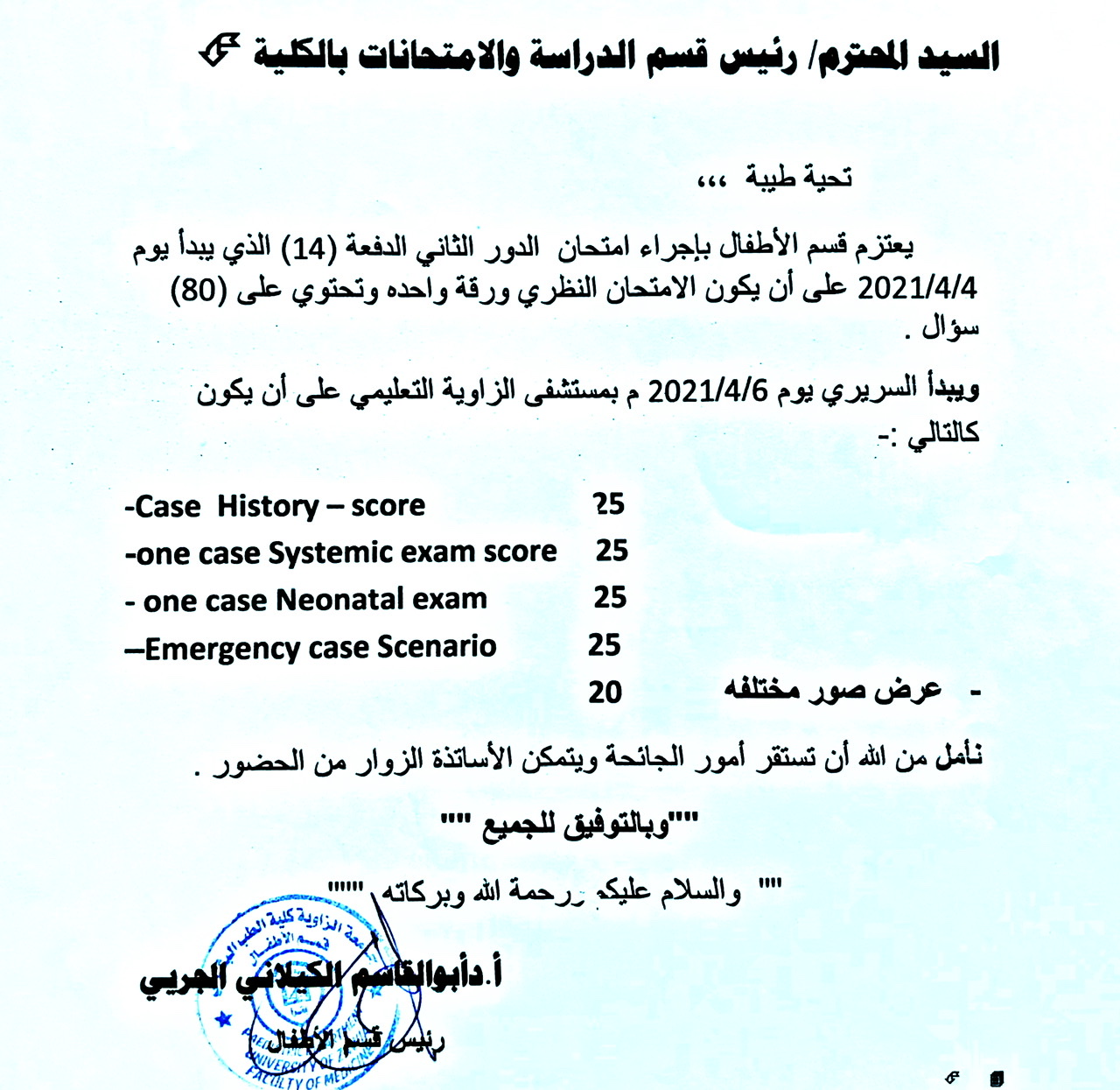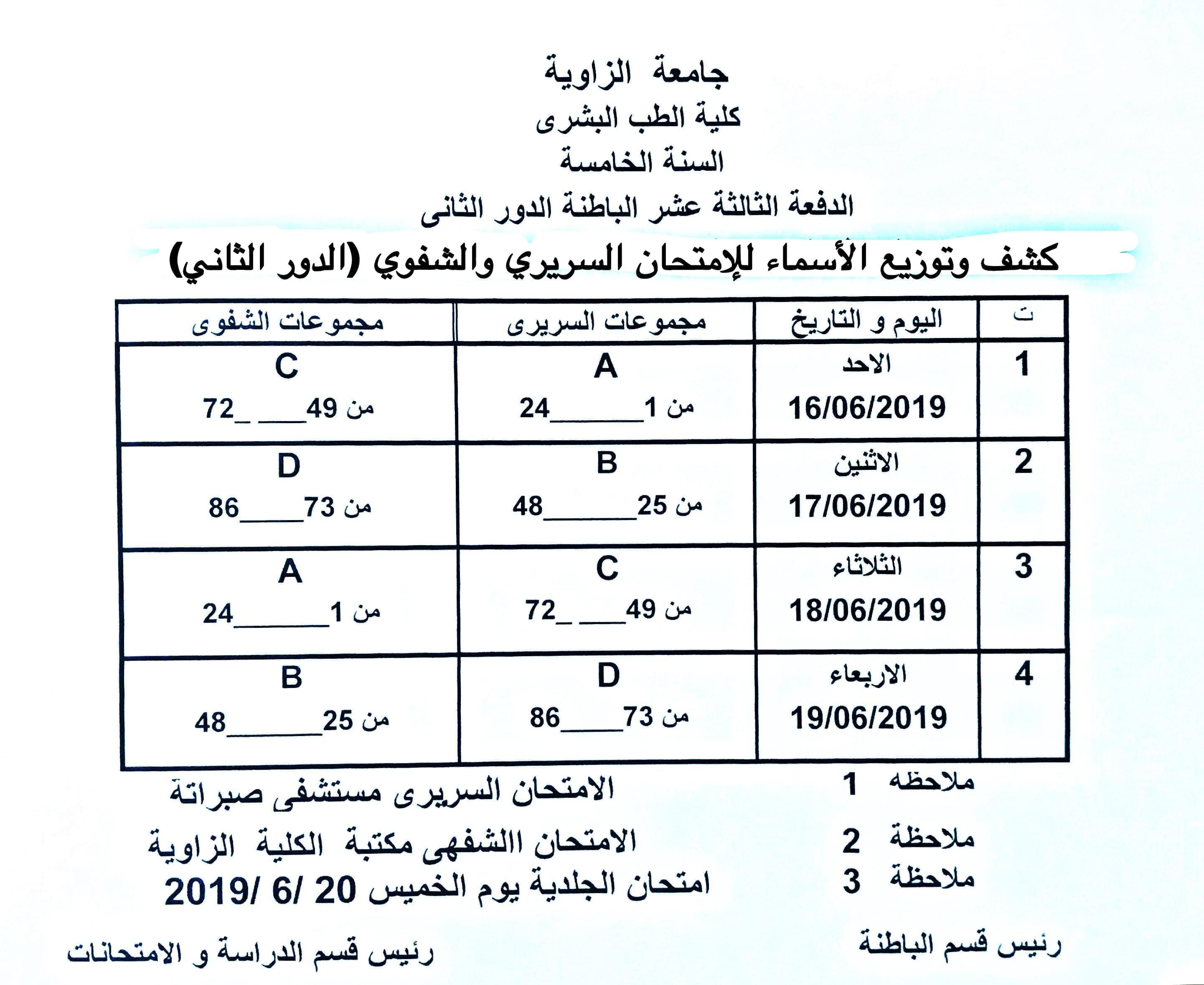 قوائم الأسماء وتوزيع المجموعات للإمتحان السريري والشفوي الدور الثاني لمادة الباطنة للسنة الخامسة الدفعة 13.