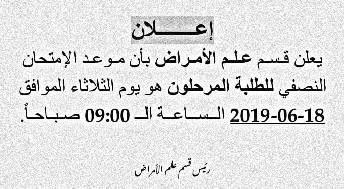 قوائم أسماء الطلبة للإمتحان النصفي للسنة الثالثة طب بشري (المرحلين) لمادة علم الأمراض للعام الجامعي 2018-2019.