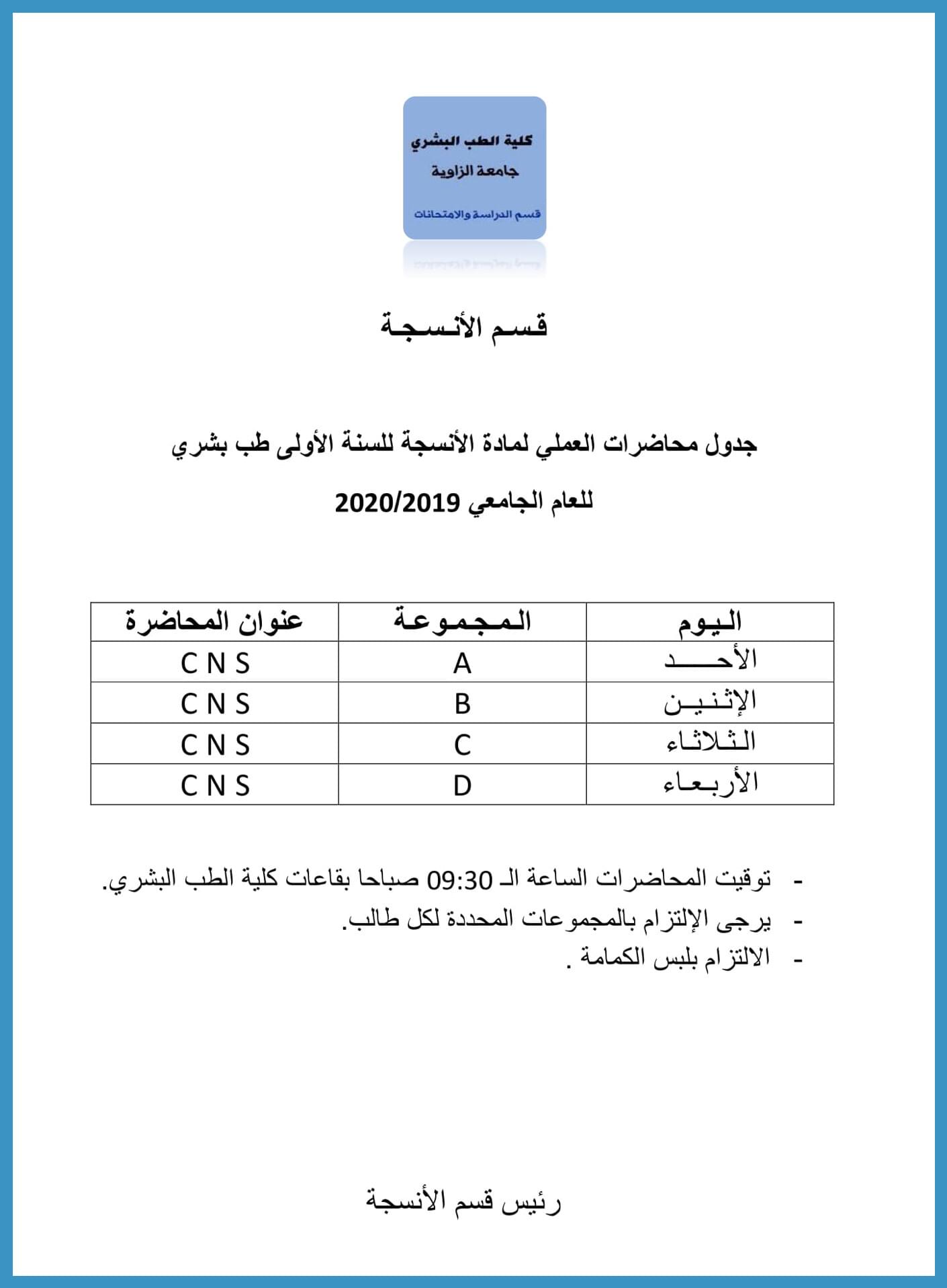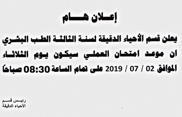 يعلن قسم التشريح بأن موعد الإمتحان العملي النهائي لسنة أولى طب بشري هو يوم الخميس الموافق13-06-2019 ابتداء من الساعة الــ08:30 صباحا لجميع الطلبة حسب تسلسل القائمة المرفقة.