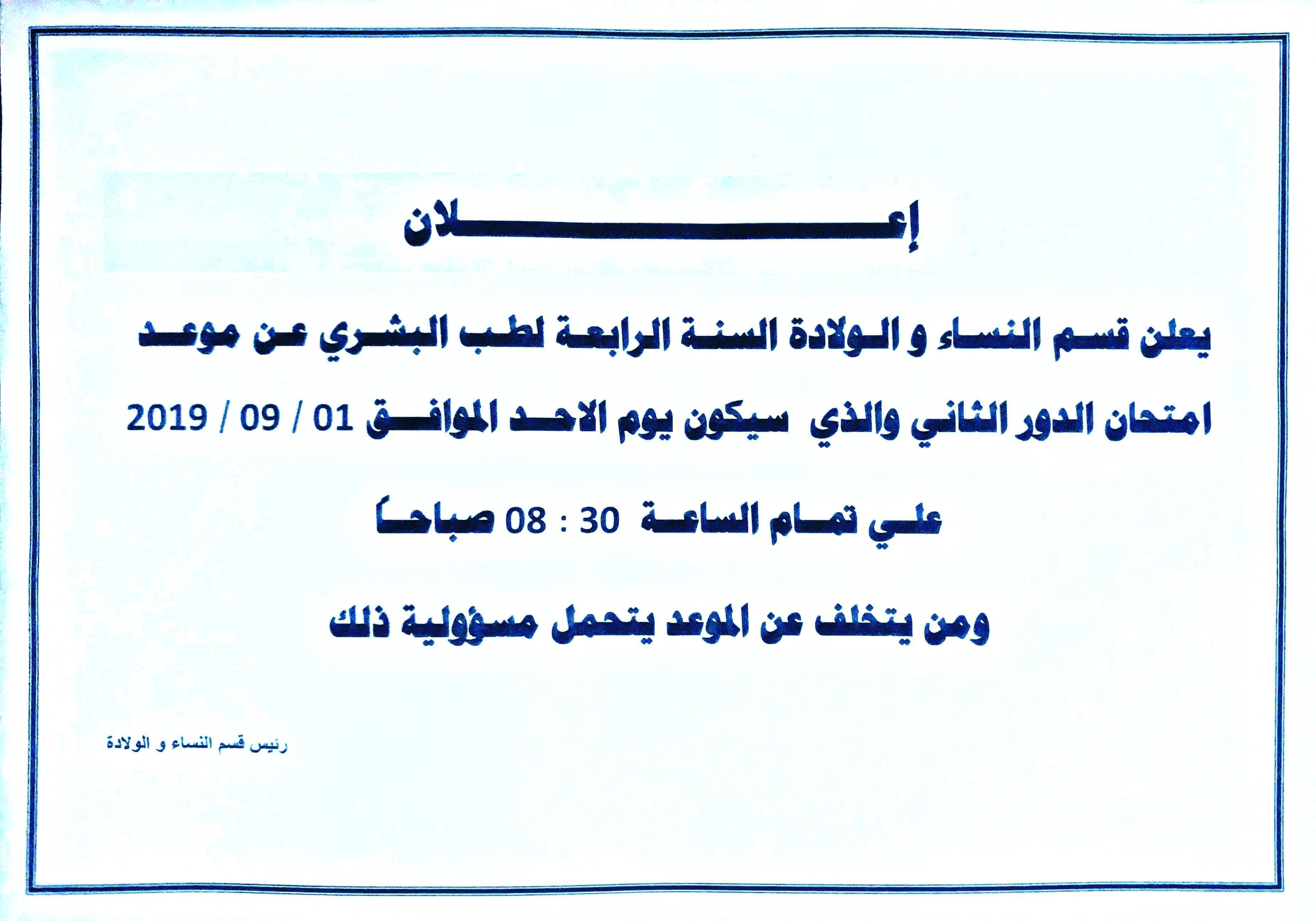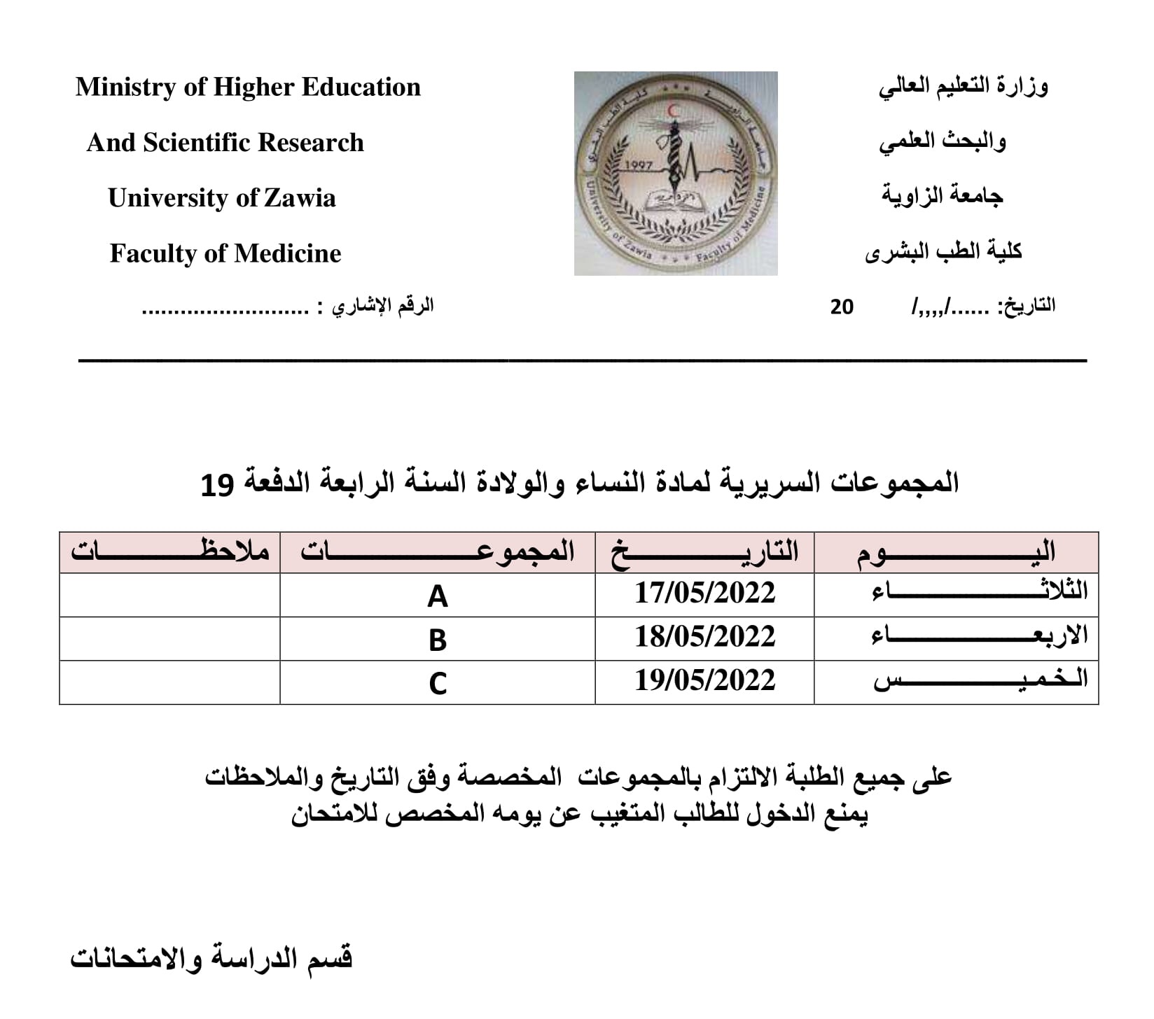 تقسيم لجان امتحان الدور الثاني لمادة النساء والولادة للسنة الرابعة الدفعة 19 وذلك يوم الاحد الموافق 8-5-2022 الساعة الـ08:30 صباحا يطلب من جميع الطلبة الالتزام باللجان حسب القوائم المرفقة ادناه