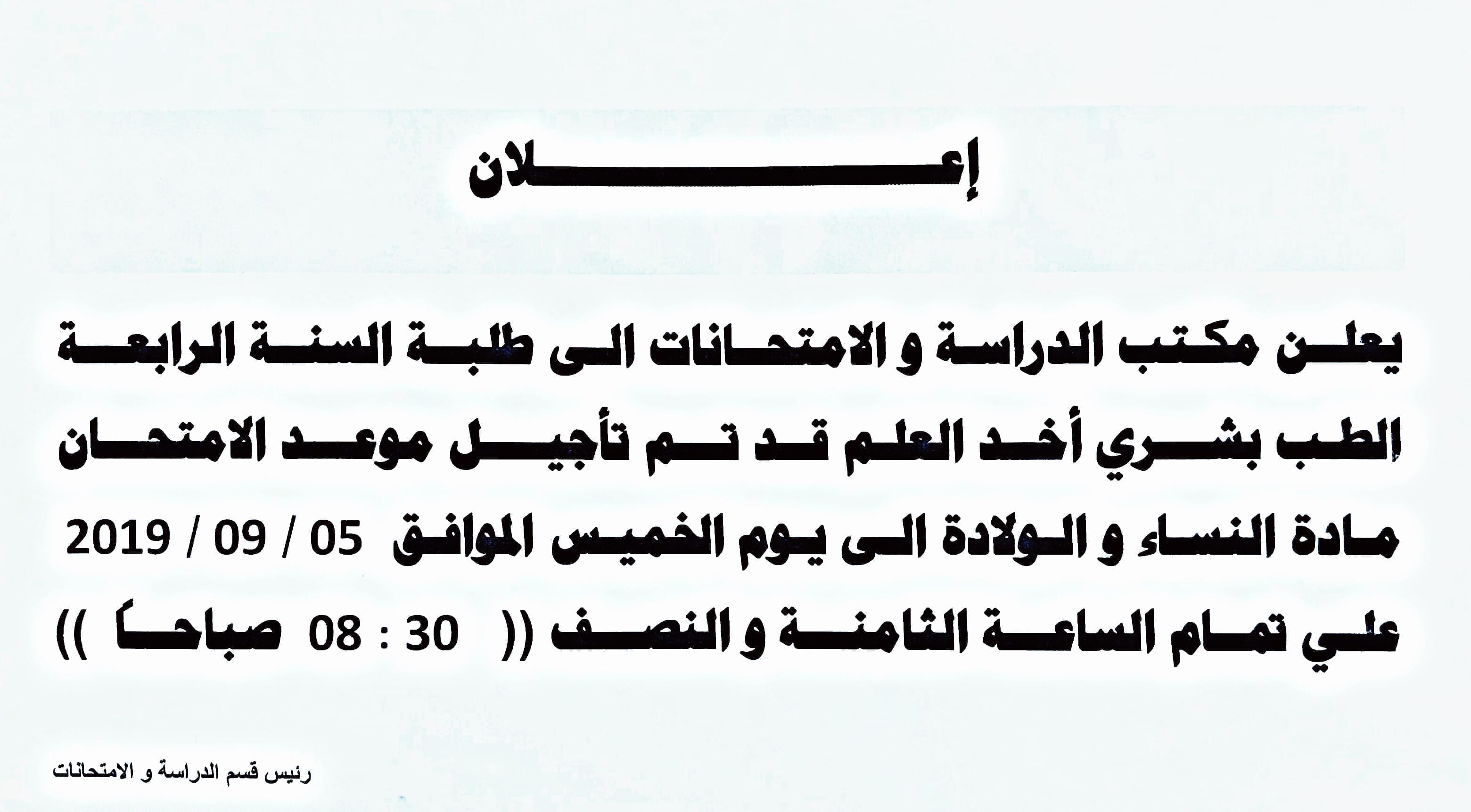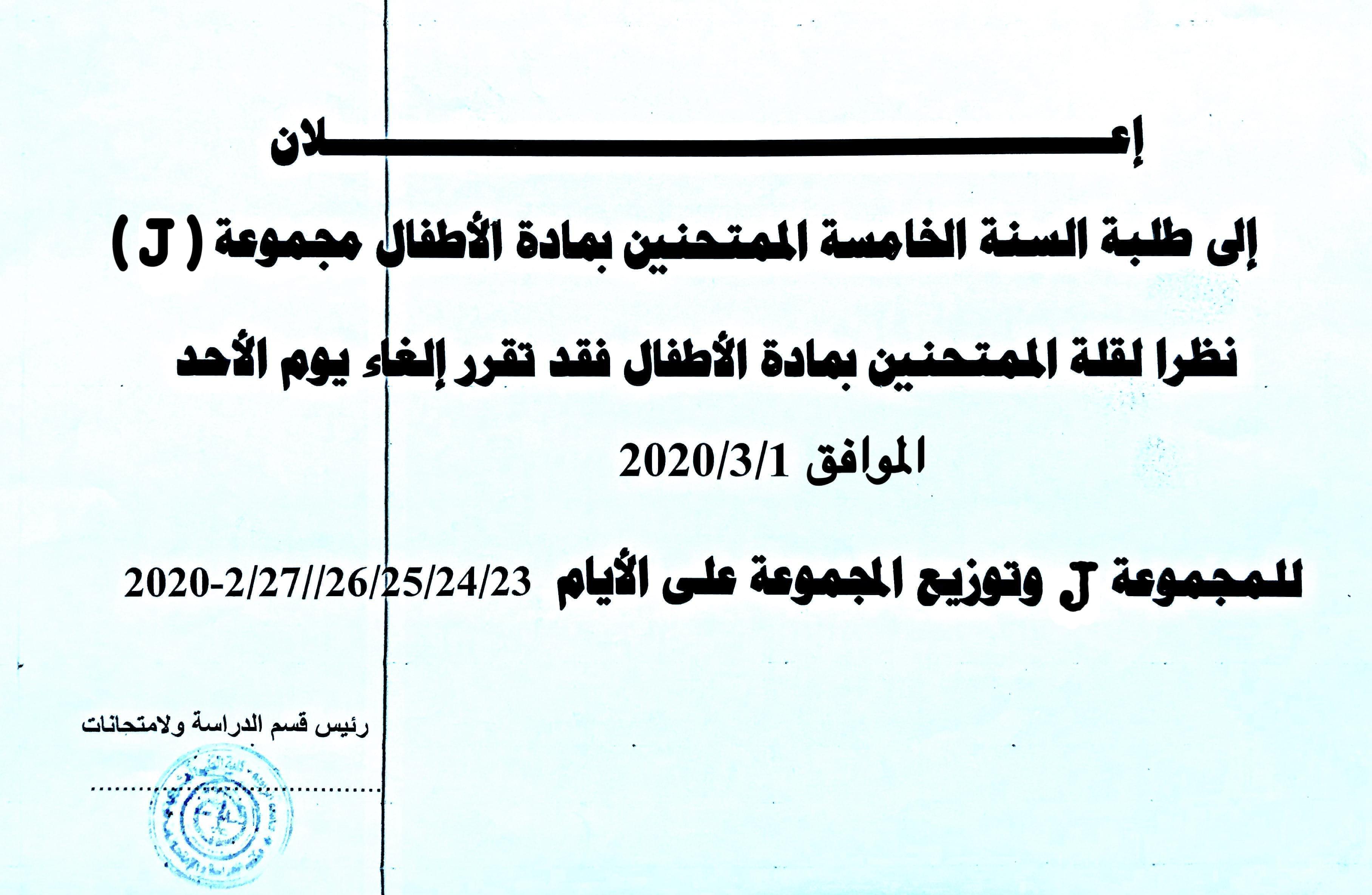 اعلان بخصوص تأجيل موعد امتحان الدور الثاني للسنة الرابعة الى يوم الخميس الموافق 5-9-2019