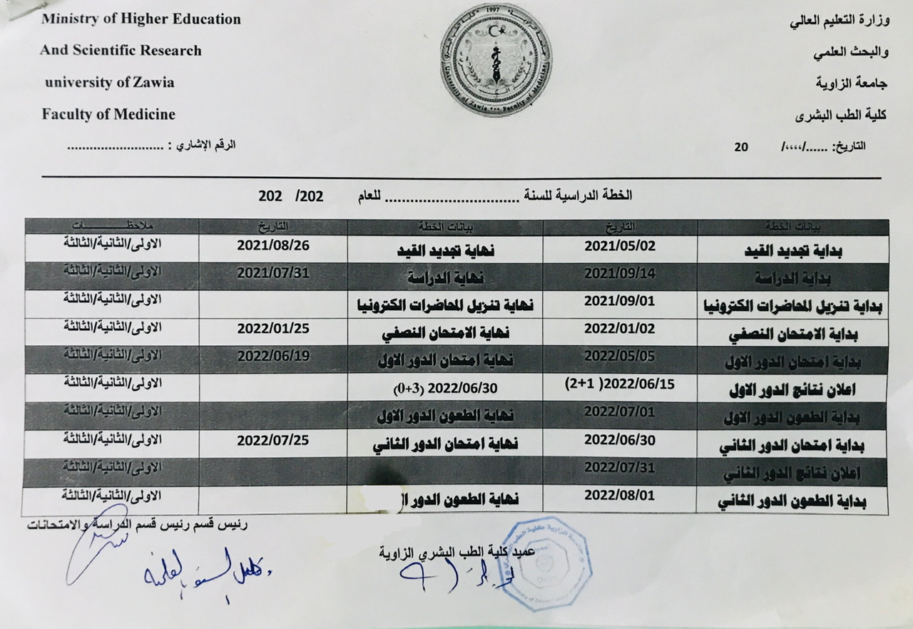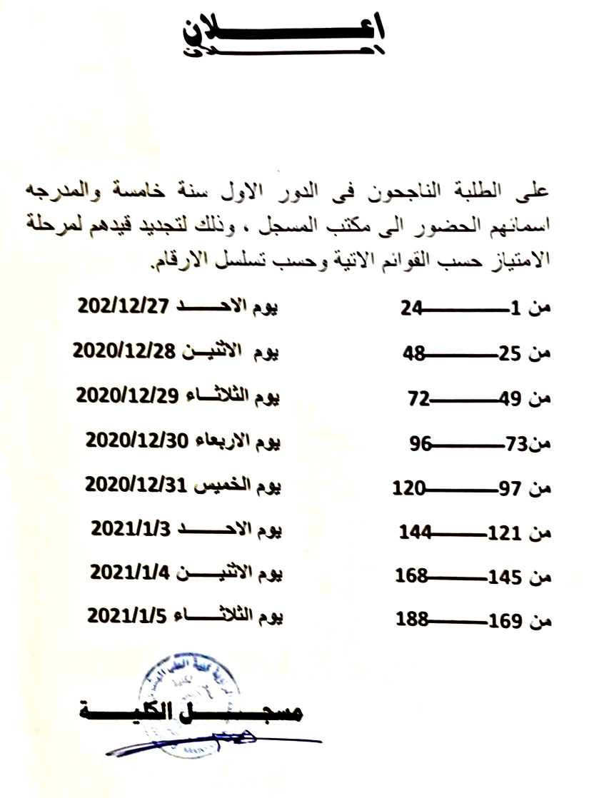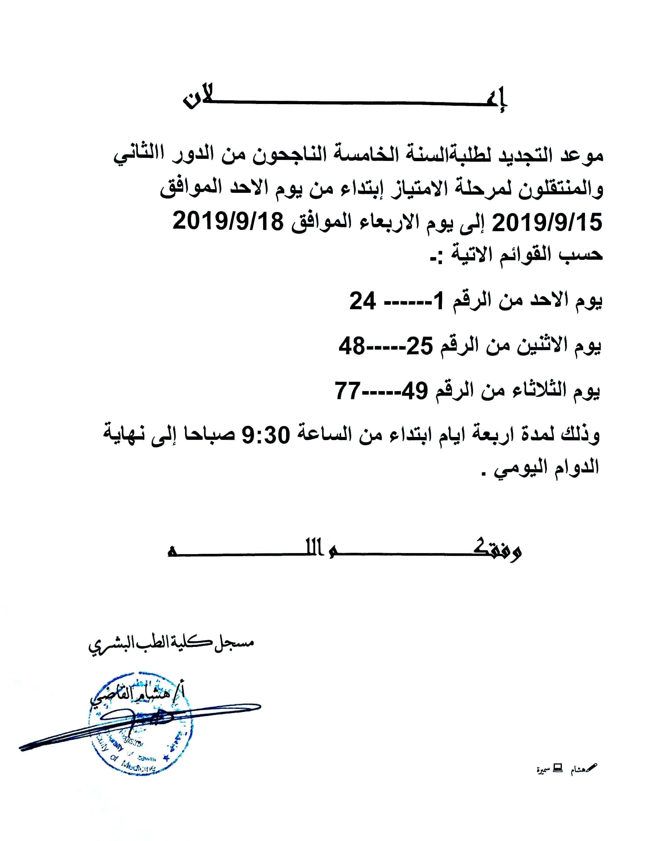 مواعيد تجديد القيد للناجحين من الدور الأول للسنة الأولى والثانية طب بشري حسب القوائم