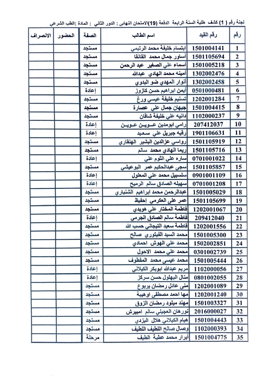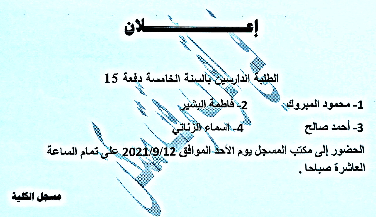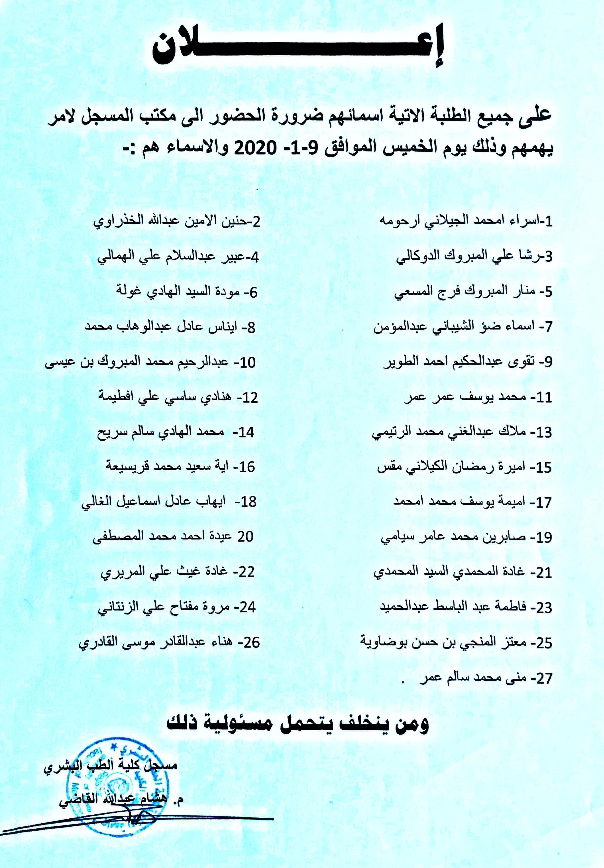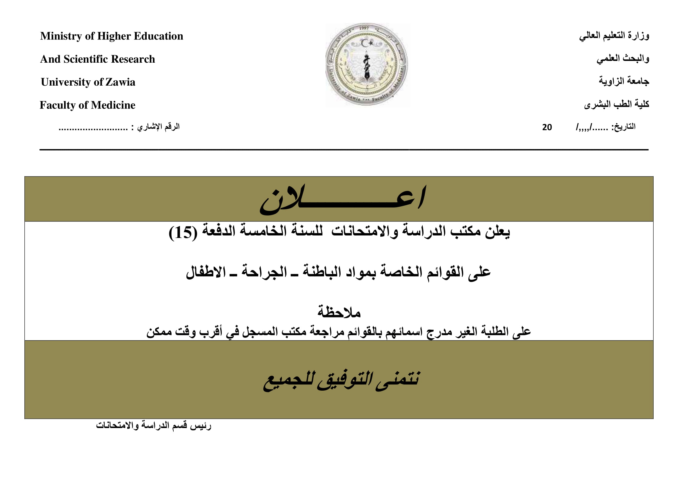 على الطلبة الغير مدرجة أسماؤهم بالقوائم مراجعة قسم الدراسة والإمتحانات.