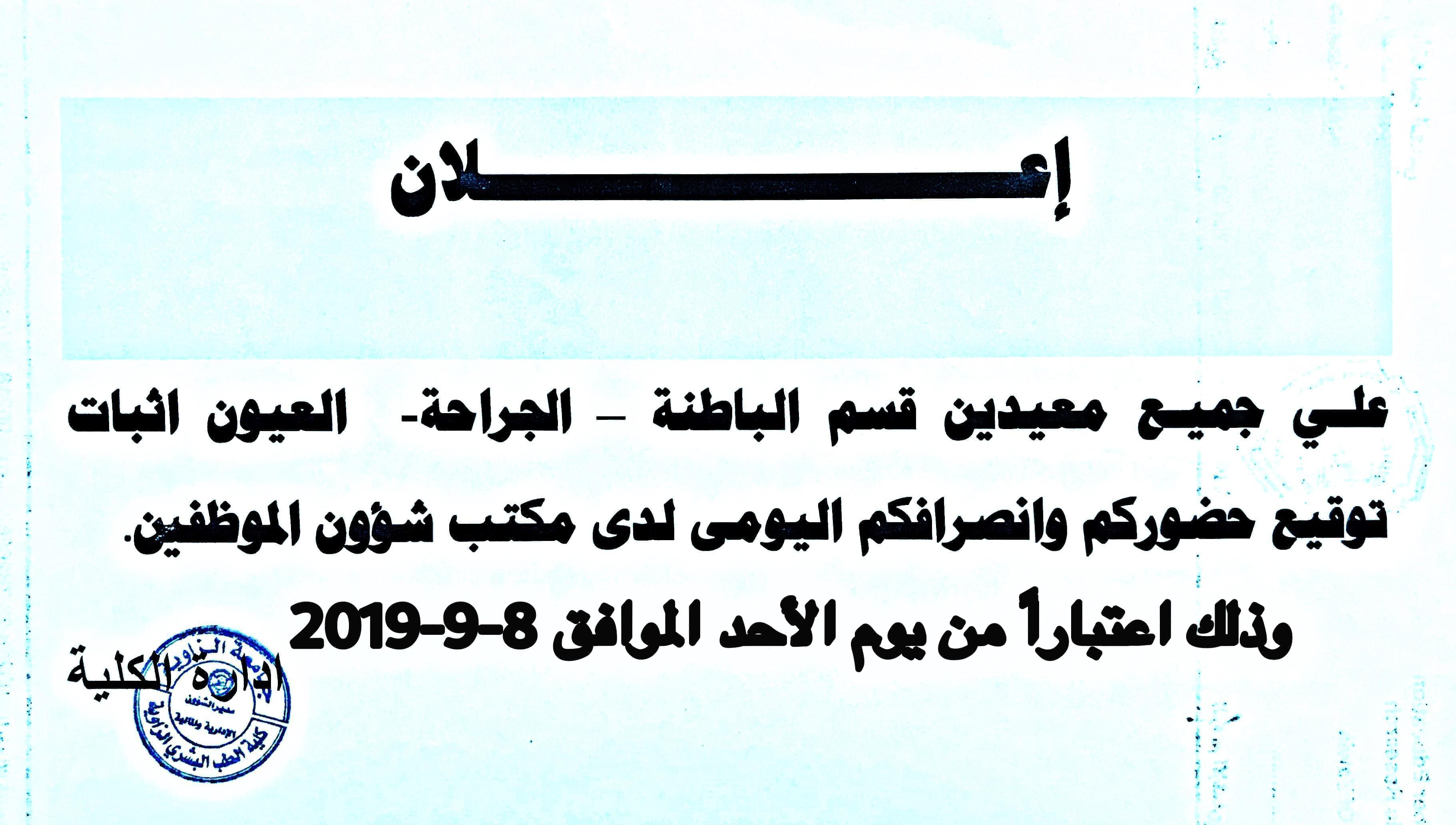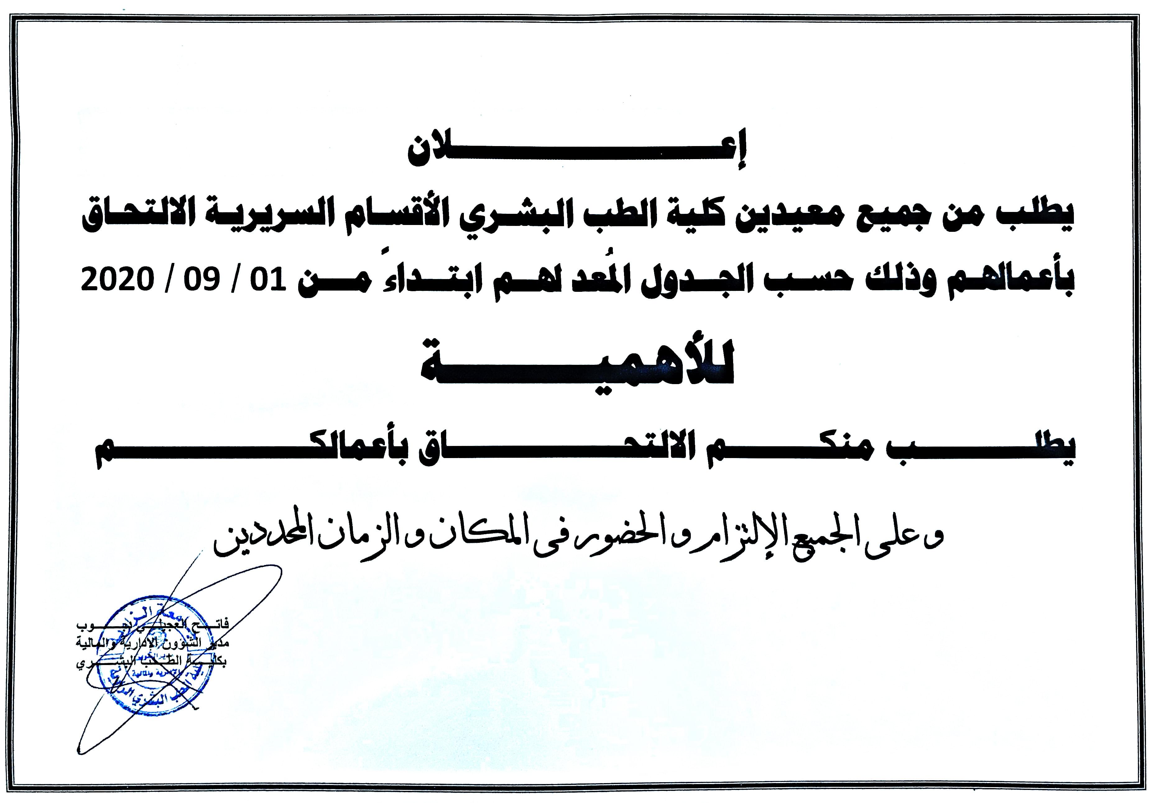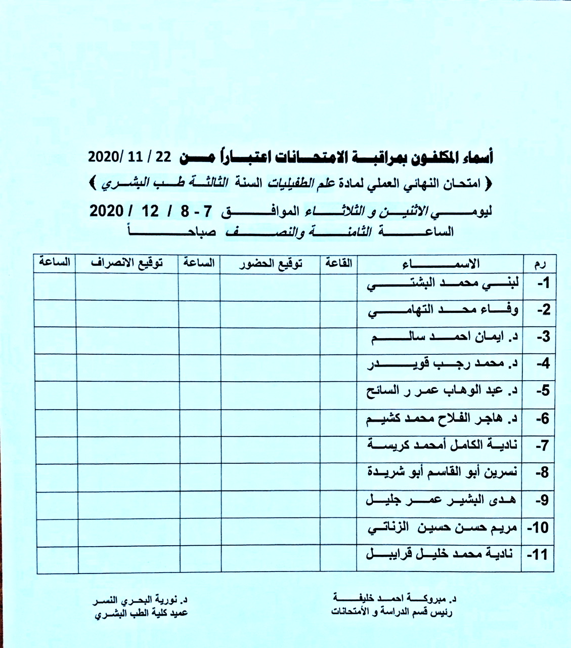 أسماء المكلفين بمراقبة امتحان الدور الأول لمادة علم الأمراض لسنة ثالثة طب بشري وذلك يوم الأحد الموافق 8-9-2019 الساعة 09:00 صباحاً.