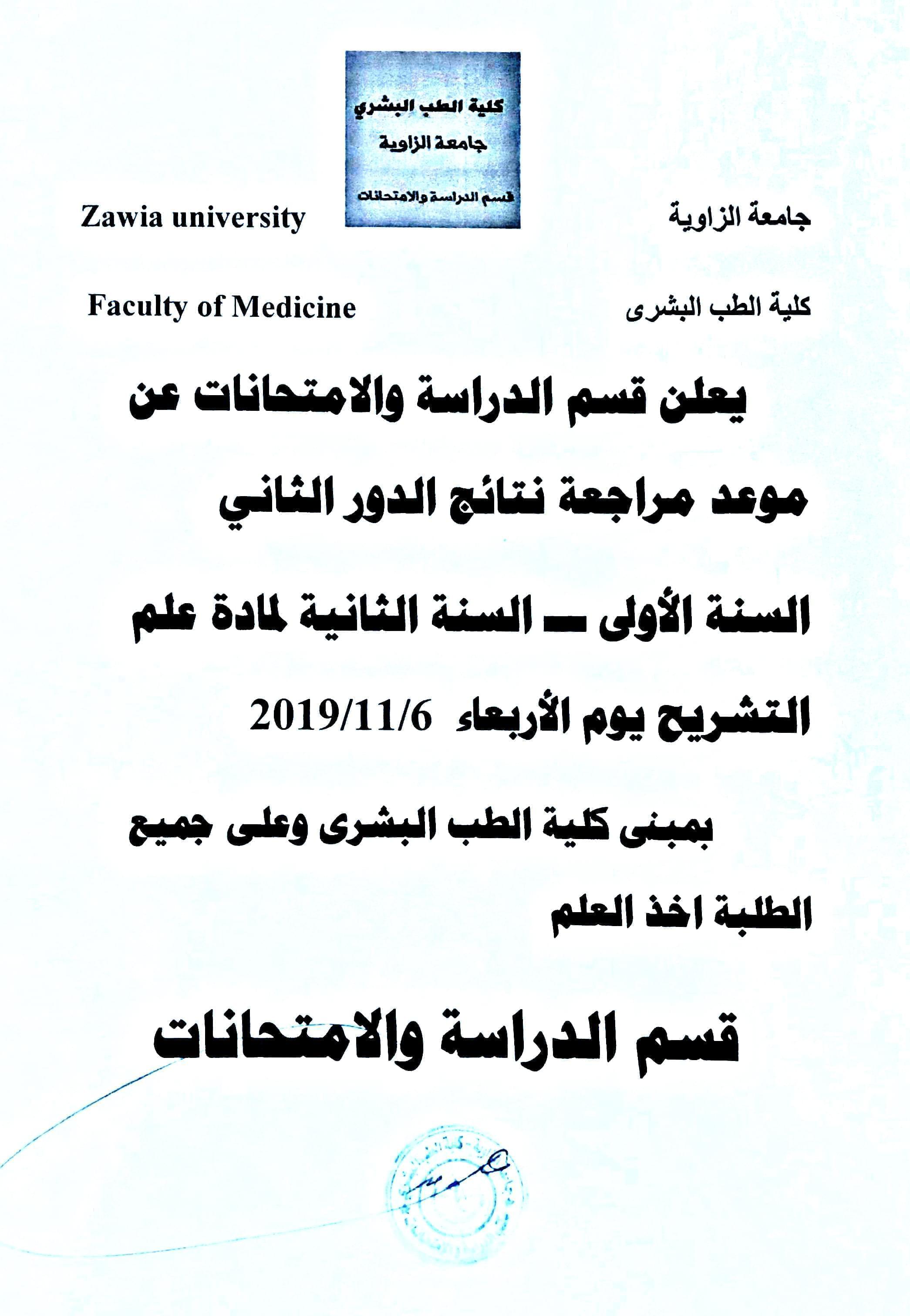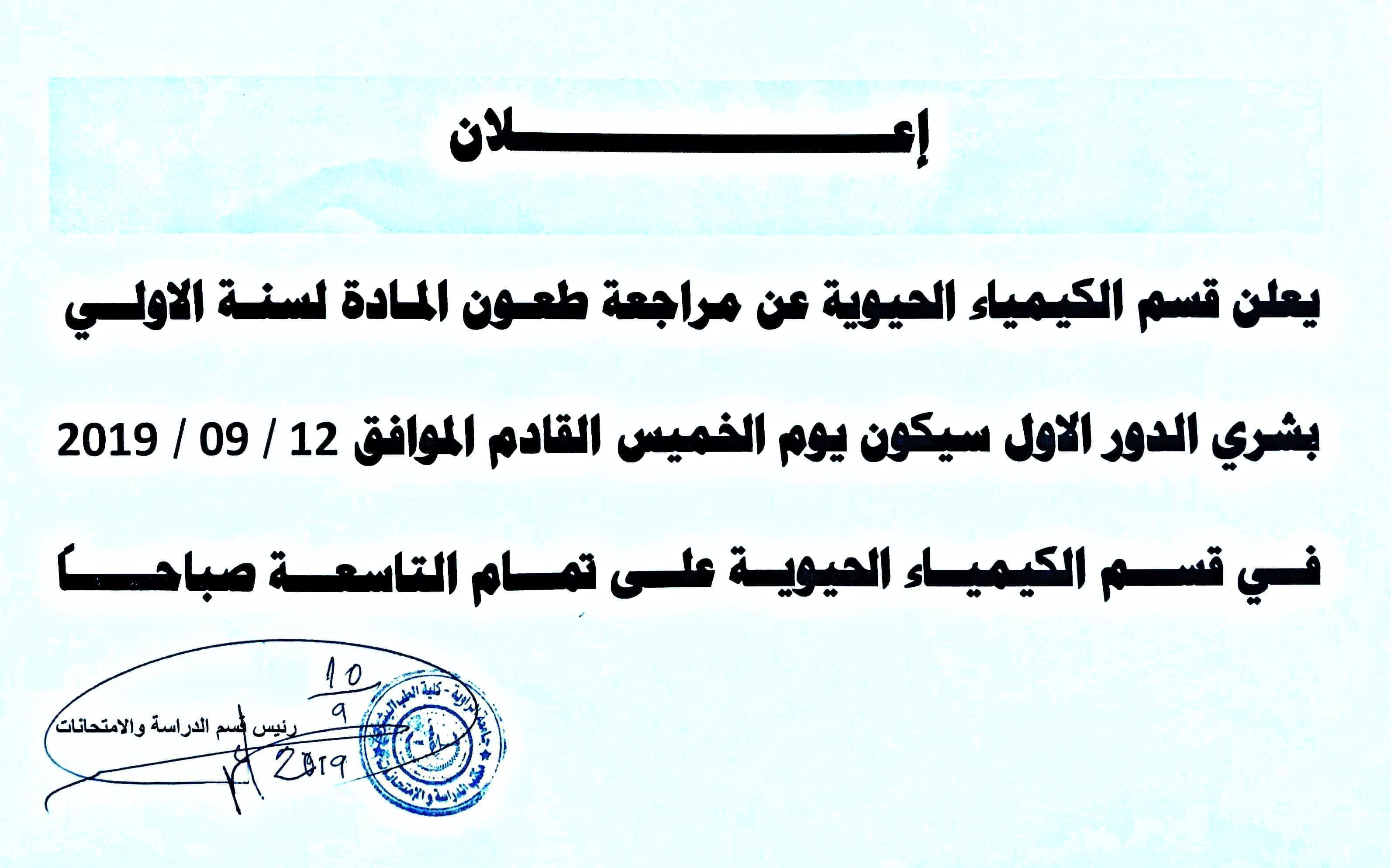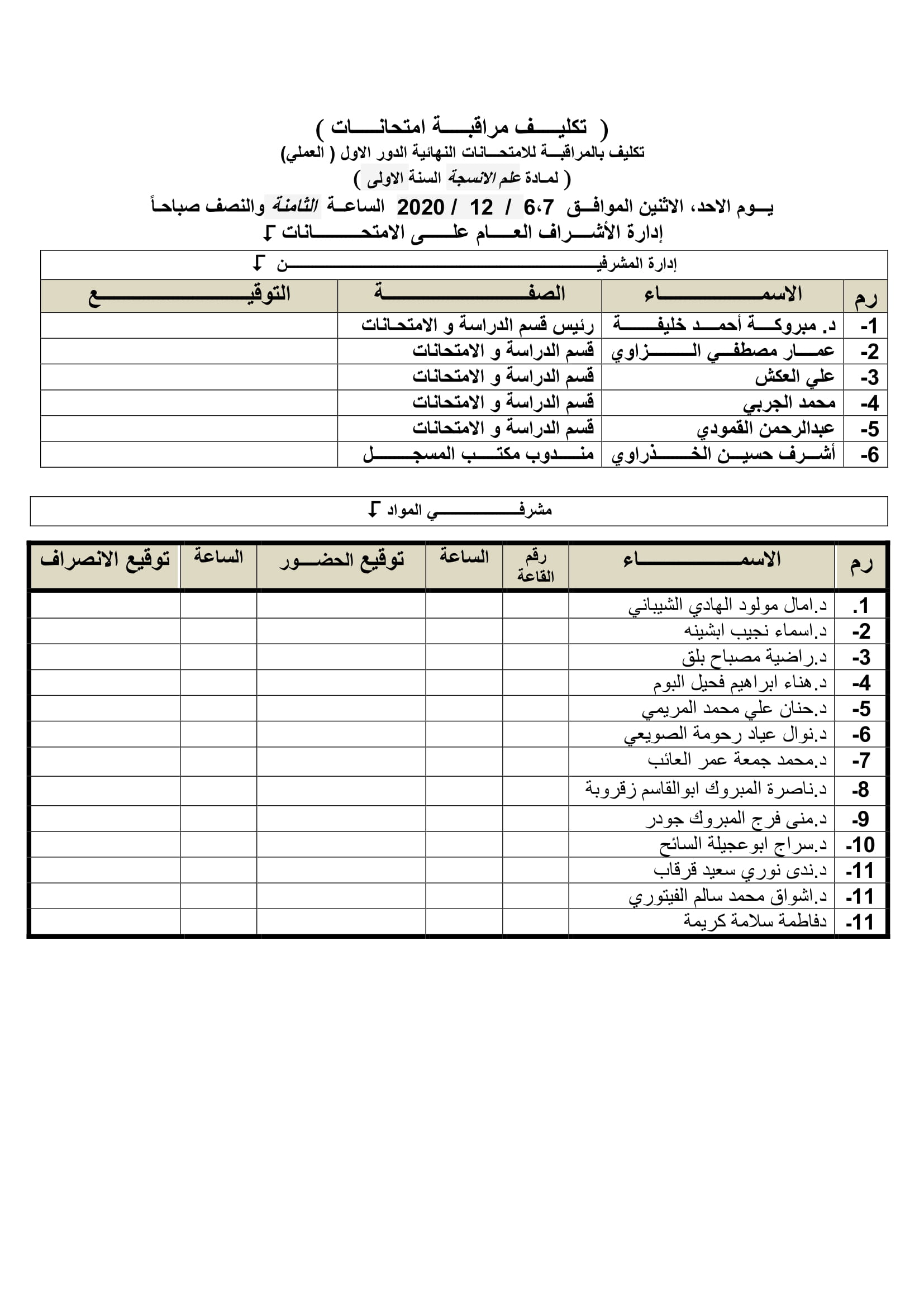أسماء المكلفين بمراقبة امتحان الدور الأول لمادة علم الأمراض لسنة ثالثة طب بشري وذلك يوم الأحد الموافق 8-9-2019 الساعة 09:00 صباحاً.