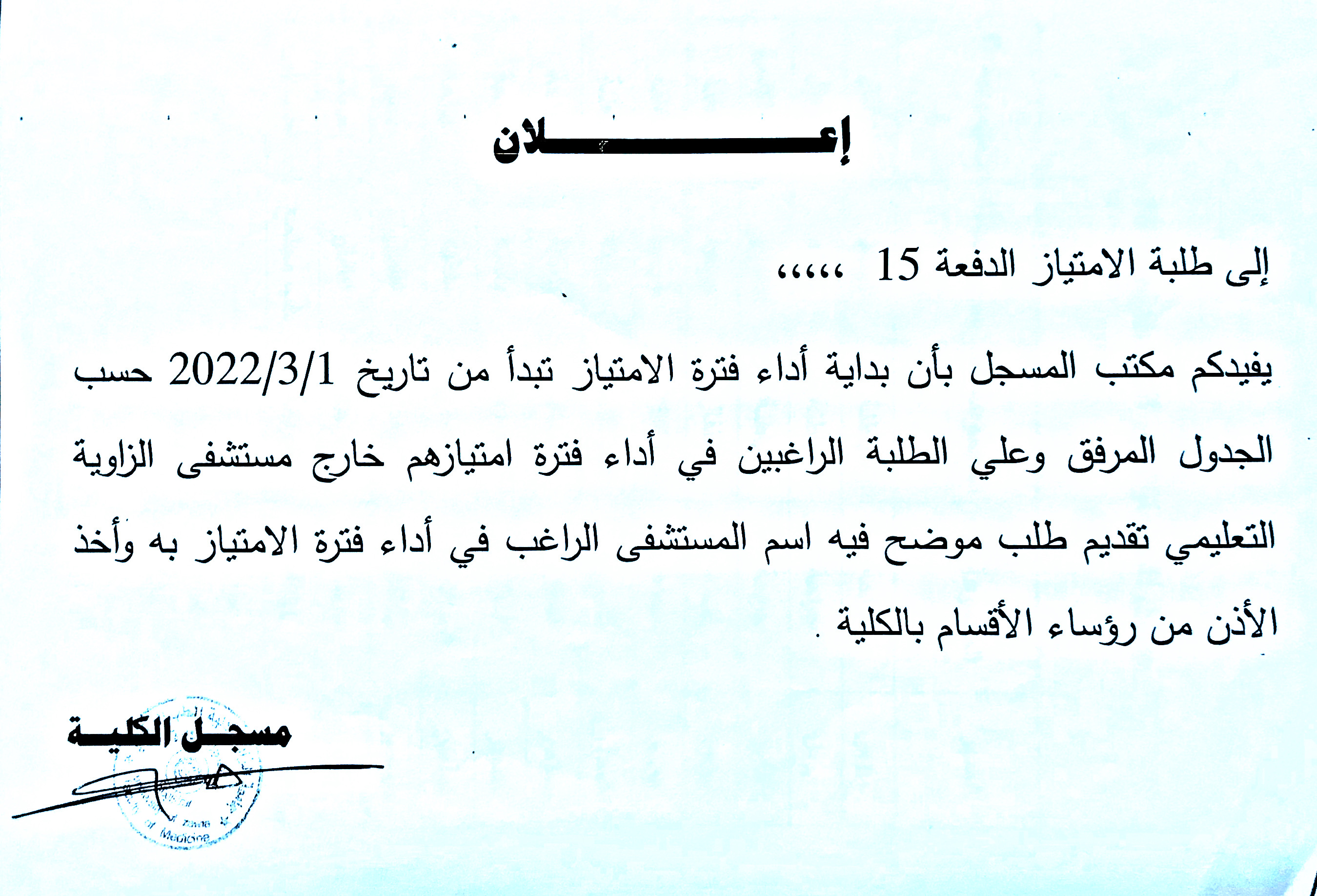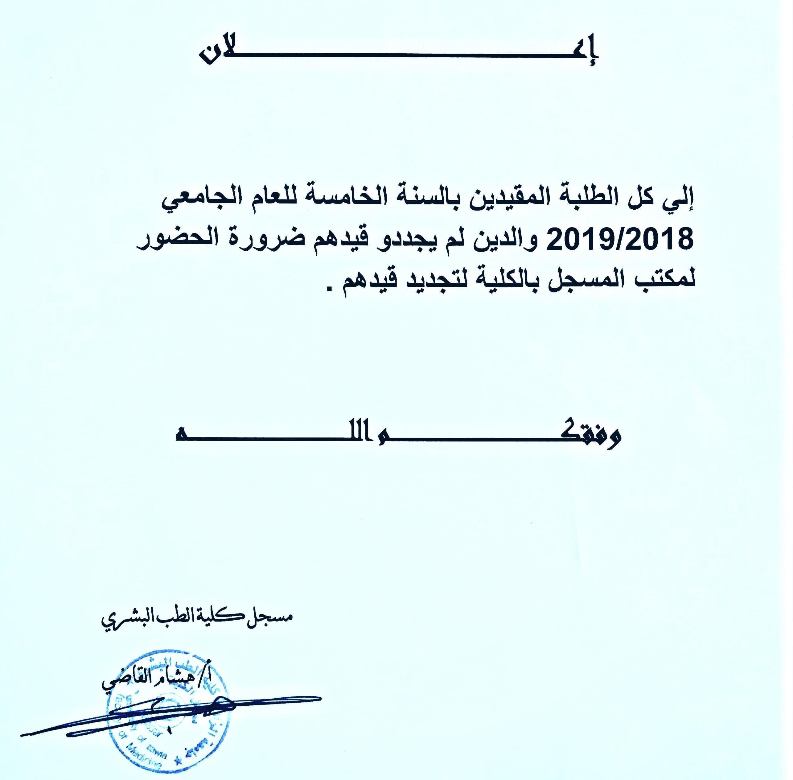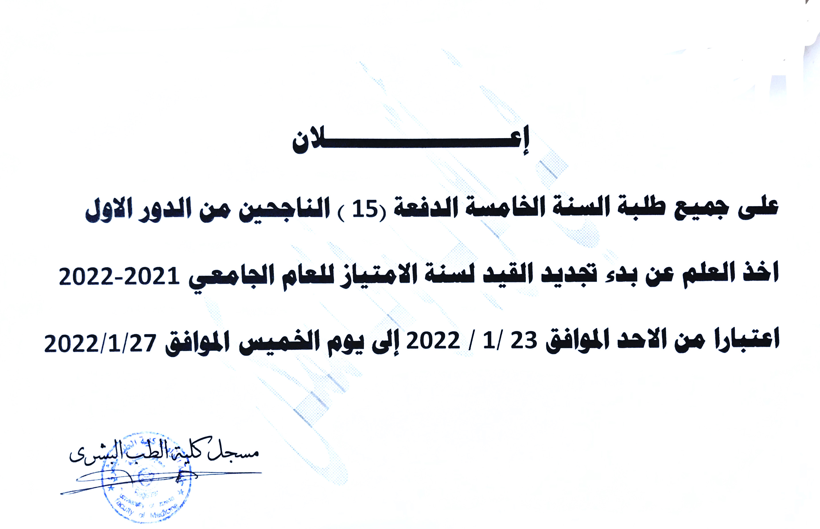 إعلان بخصوص تجديد القيد لسنة الإمتياز للطلبة الناجحين من الدور الثاني لطلبة السنة الخامسة الدفعة 13