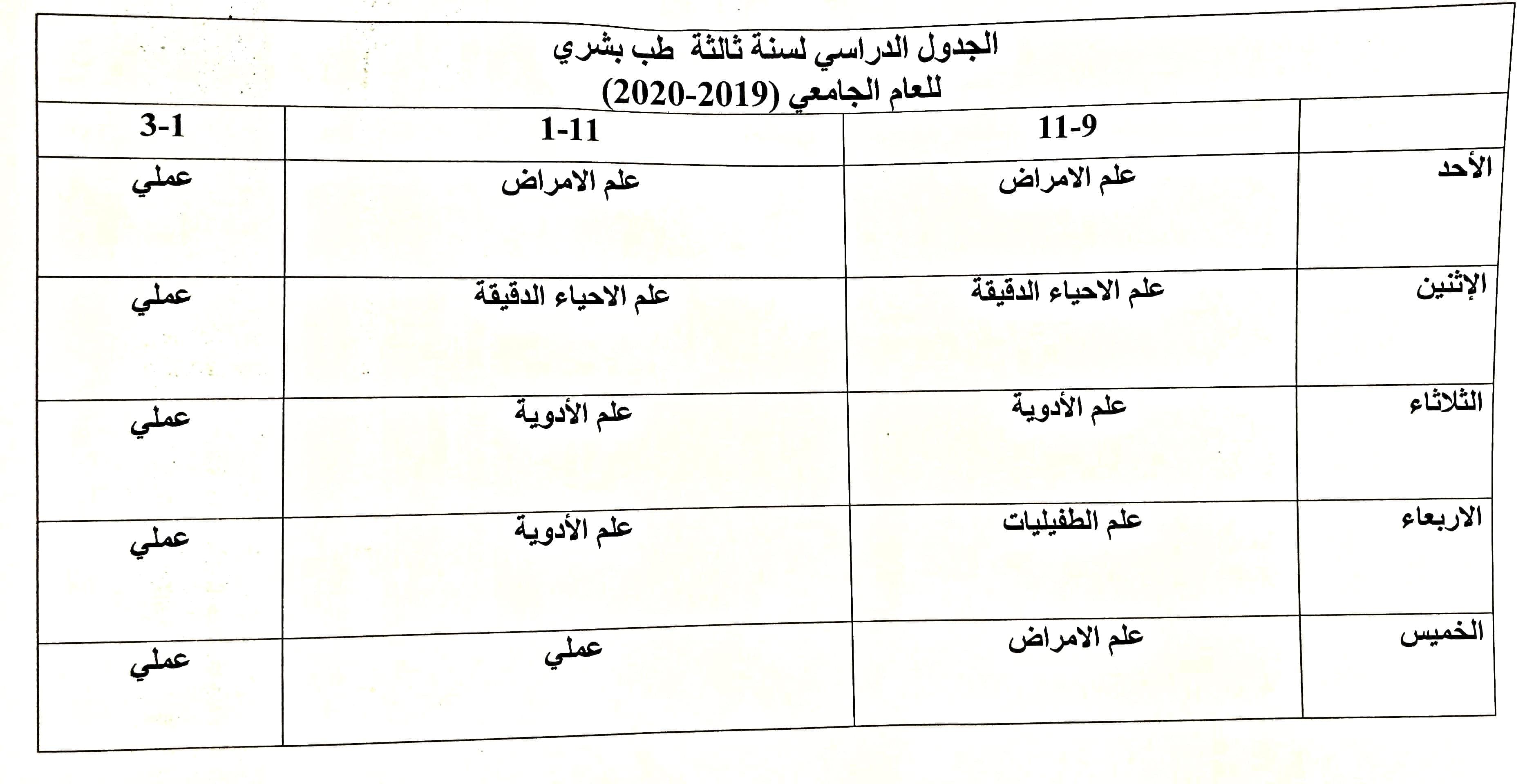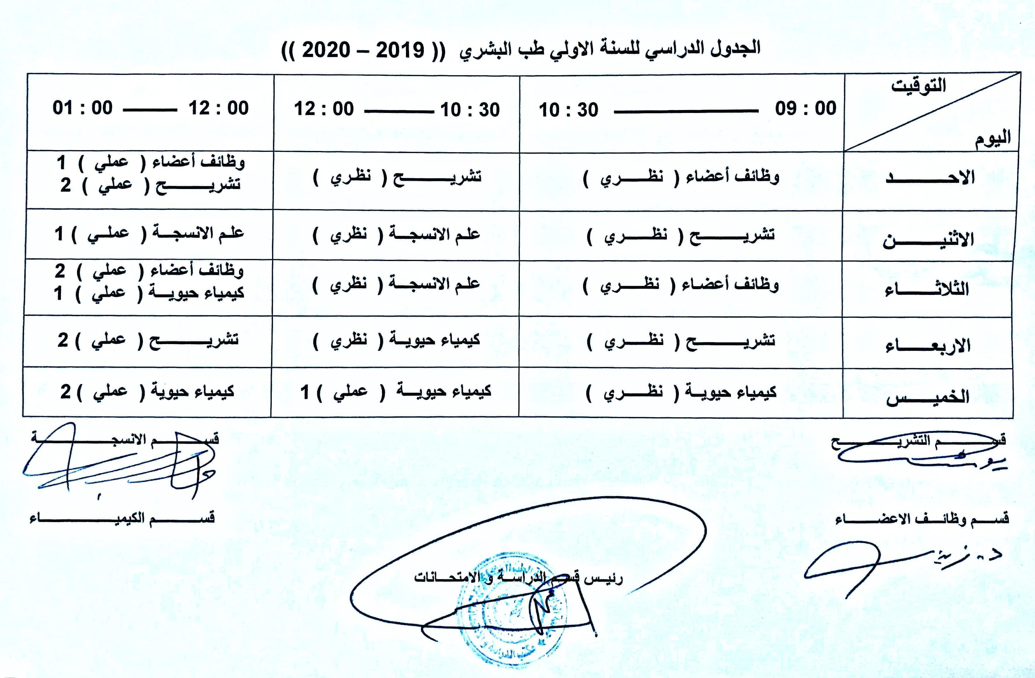 الجدول الدراسي والخطة الدراسية لسنة أولى طب بشري للعام الجامعي 2019-2020
