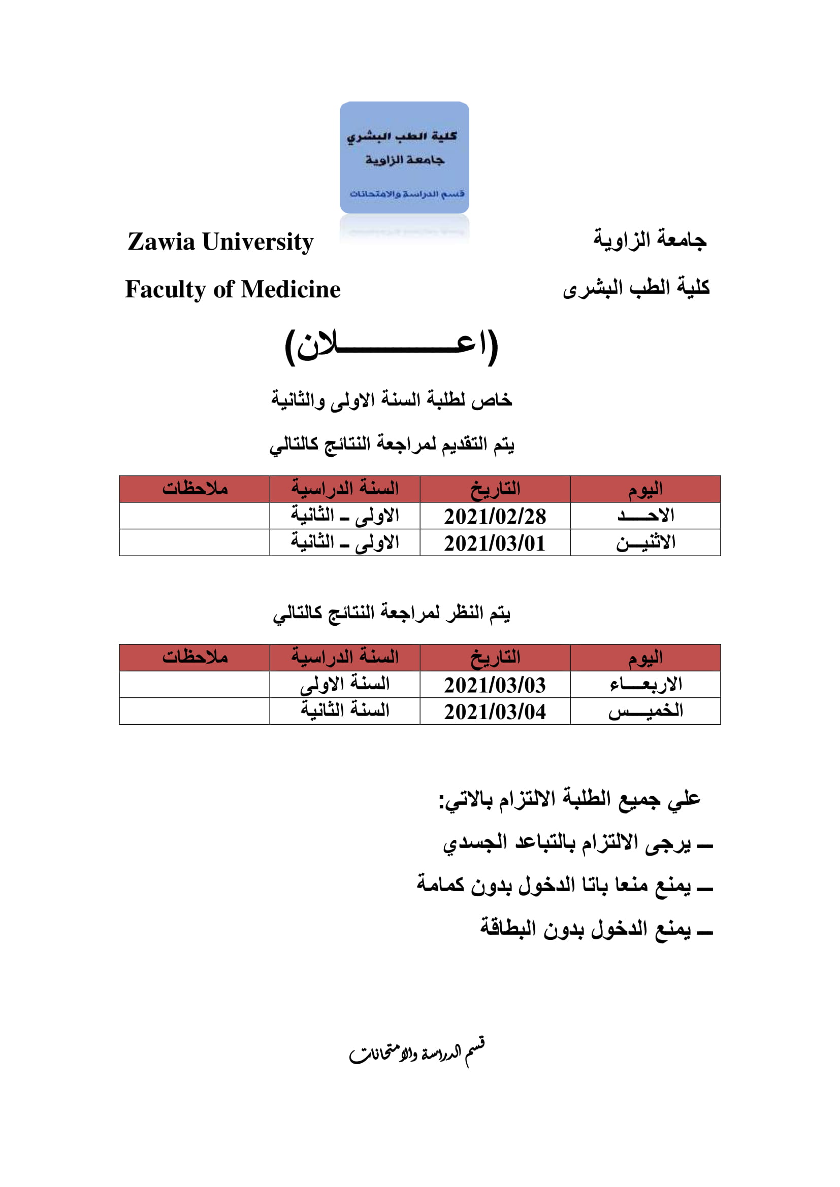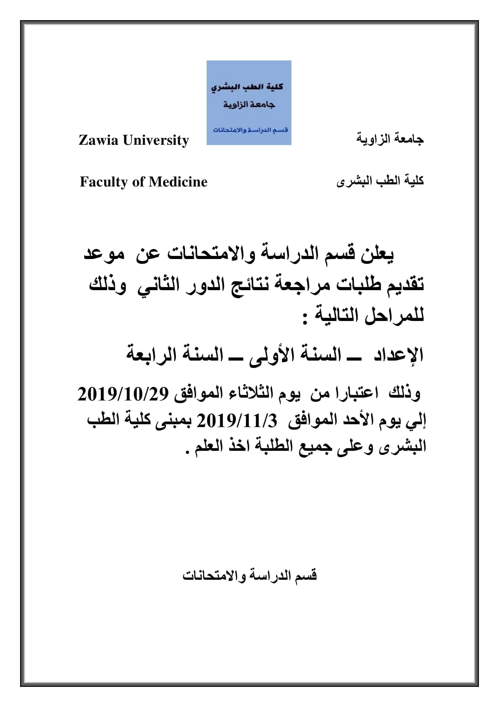 موعد تقديم طلبات مراجعة نتائج الدور الثاني لسنوات الإعداد والأولى والرابعة طب بشري ومرفقة بجداول مراجعة المواد لسنة الإعداد والأولى طب بشري