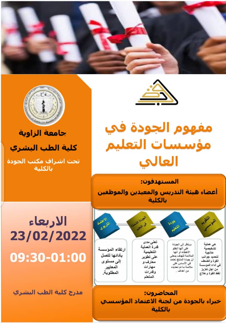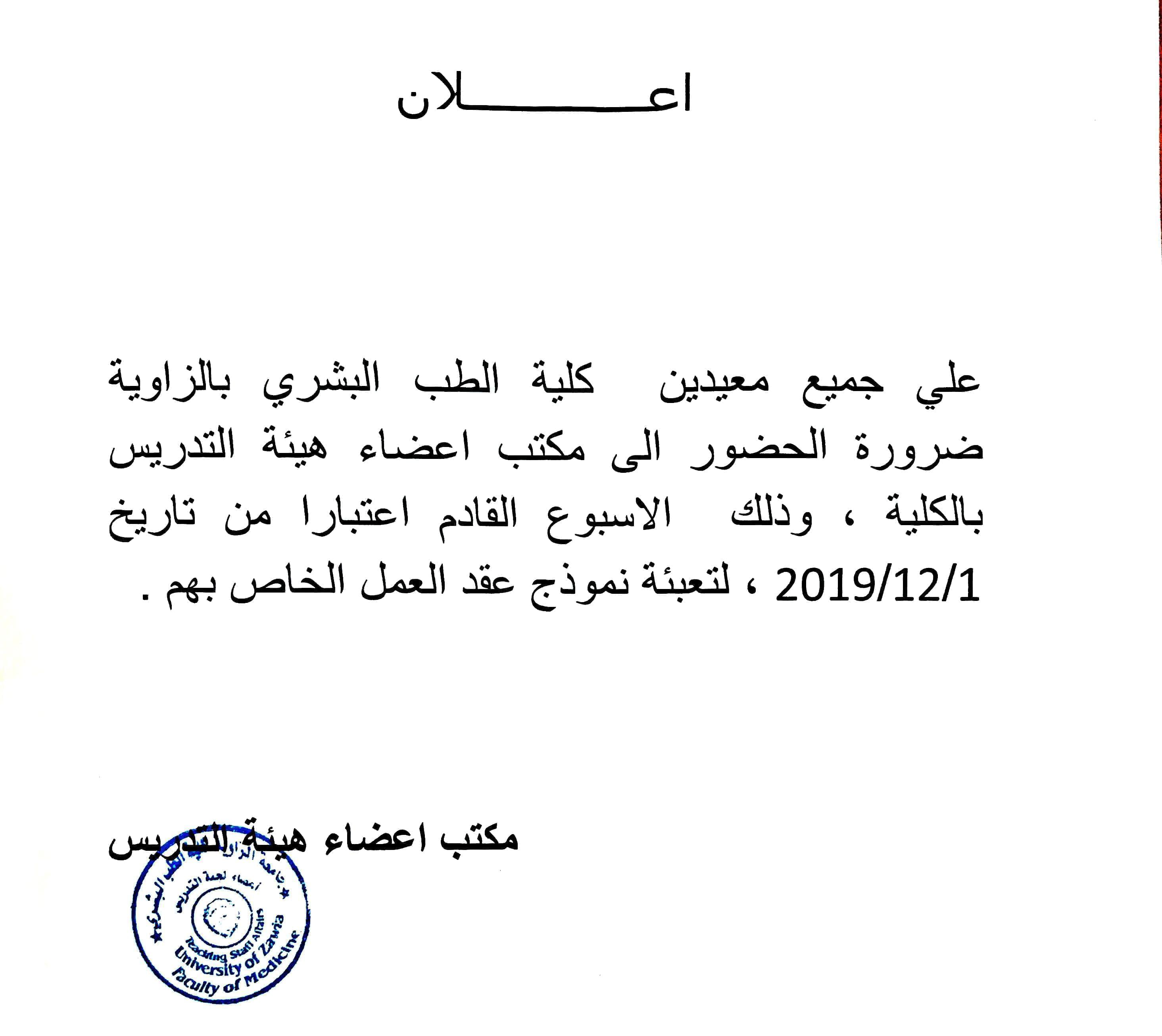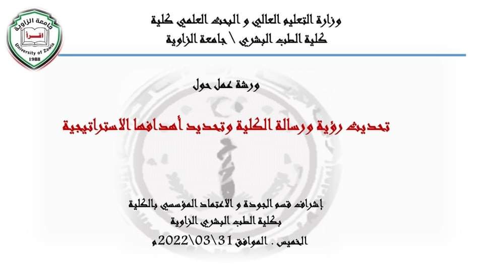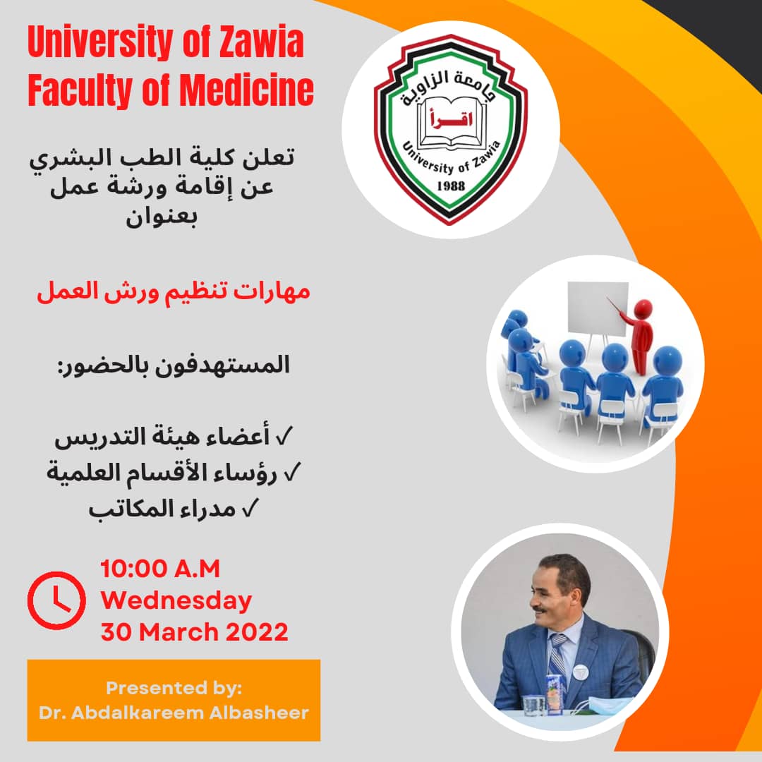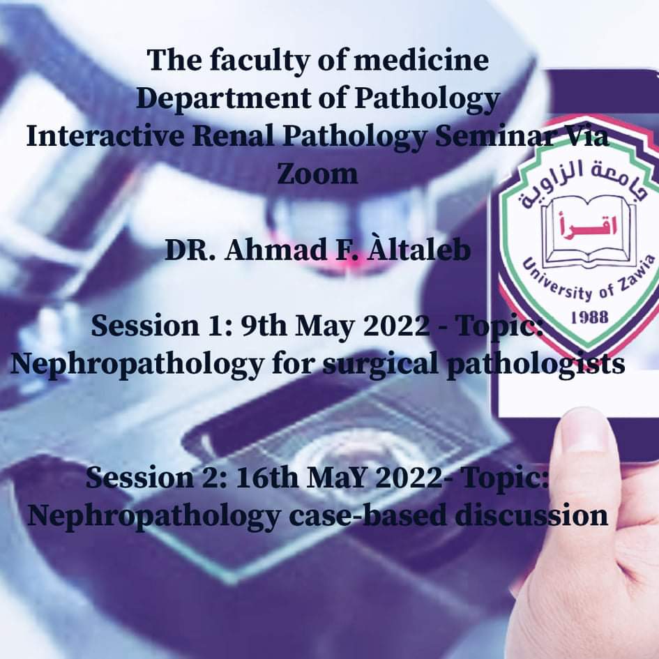في اطار التعليم الطبي المستمر والرفع من الكفاءات التشخيصية لأطباء علم الأمراض في ليبيا وأعضاء هيئة التدريس والمعيدين بقسم علم الأمراض بكلية الطب البشري جامعة الزاوية وبالتعاون مع الكفاءات والخبرات من أطباء الوطن العربى في هذا المجال يستضيف قسم علم الأمراض كلية الطب البشري جامعة الزاوية وعبر تقنية الزوم ضيف الشرف الأستشاري في علم الأمراض من دولة الكويت الدكتور أحمد الطالب و علي يومين كما هو موضح بالجدول الورشة حول تشخيص أمراض الكلي ومناقشة بعض الحالات المرضية يوم الاثنين القادم الساعة العاشرة صباحا بتوقيت ليبيا وستنقل المحاضرة داخل قاعة التعليم الالكتروني بالكلية لمن لديه الرغبة بالحضور الدعوة لكل الأطباء وأعضاء هيئة التدريس والمهتمين بهذا المجال لمتابعة المحاضرات عبر رابط الزوم