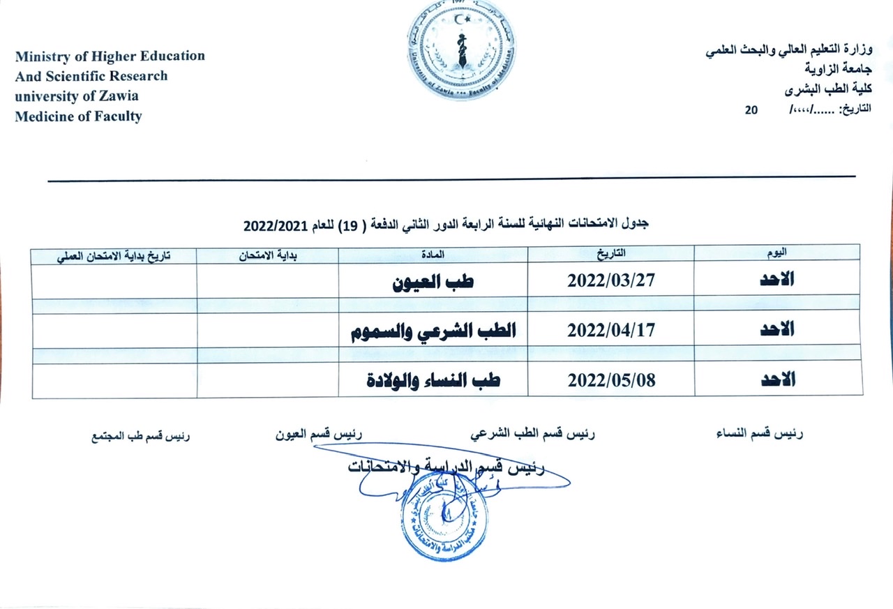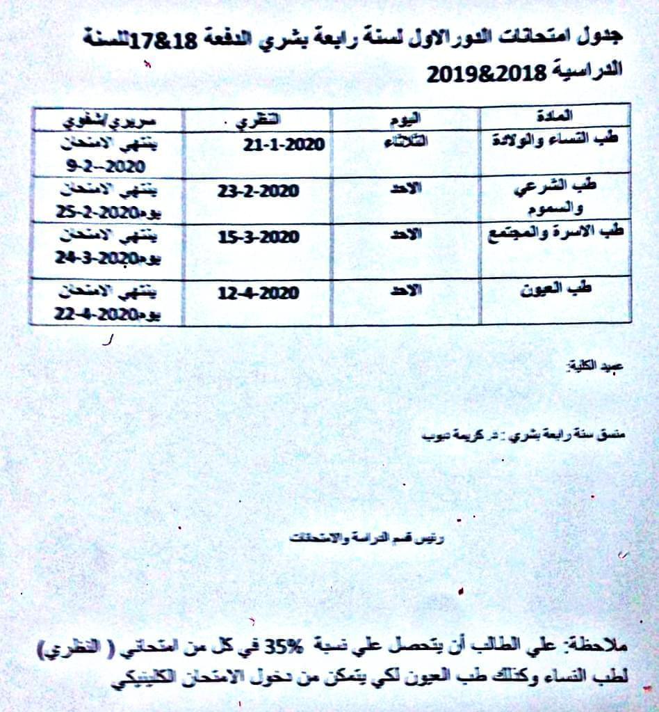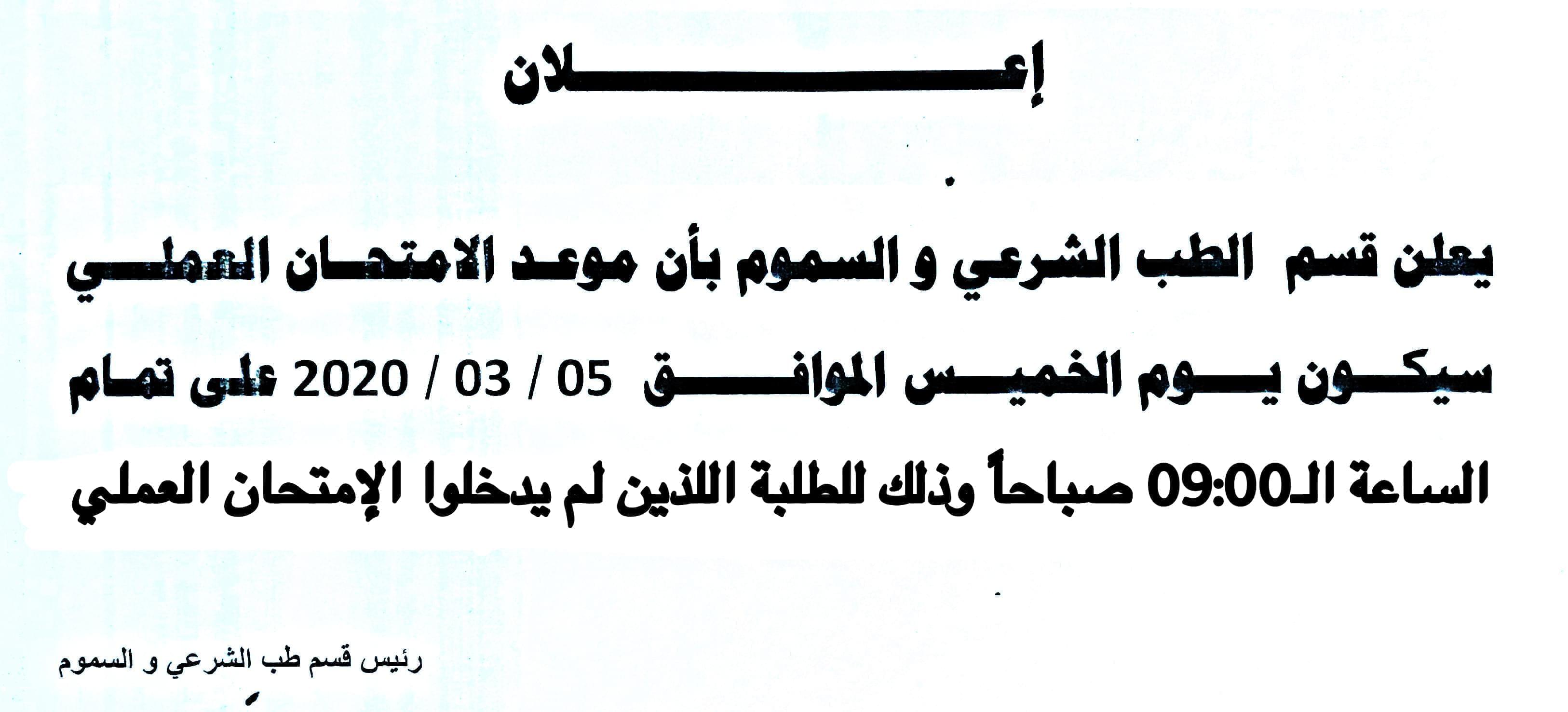لجنة امتحان الدور الثاني لمادة الطب الشرعي والسموم للسنة الرابعة الدفعة 19 وذلك يوم الأحد الموافق 17-4-2022 الساعة الـ9:00 صباحاً.