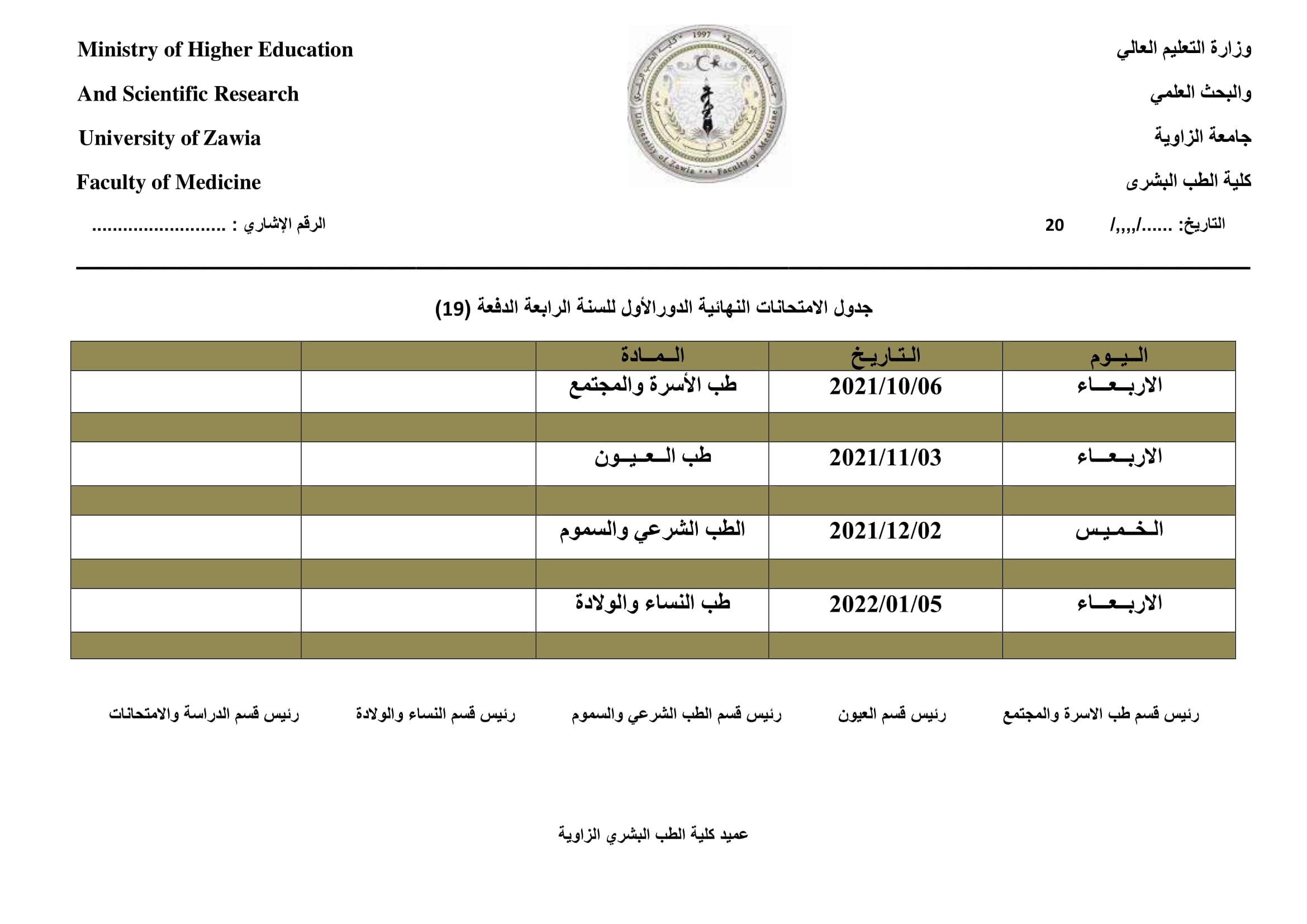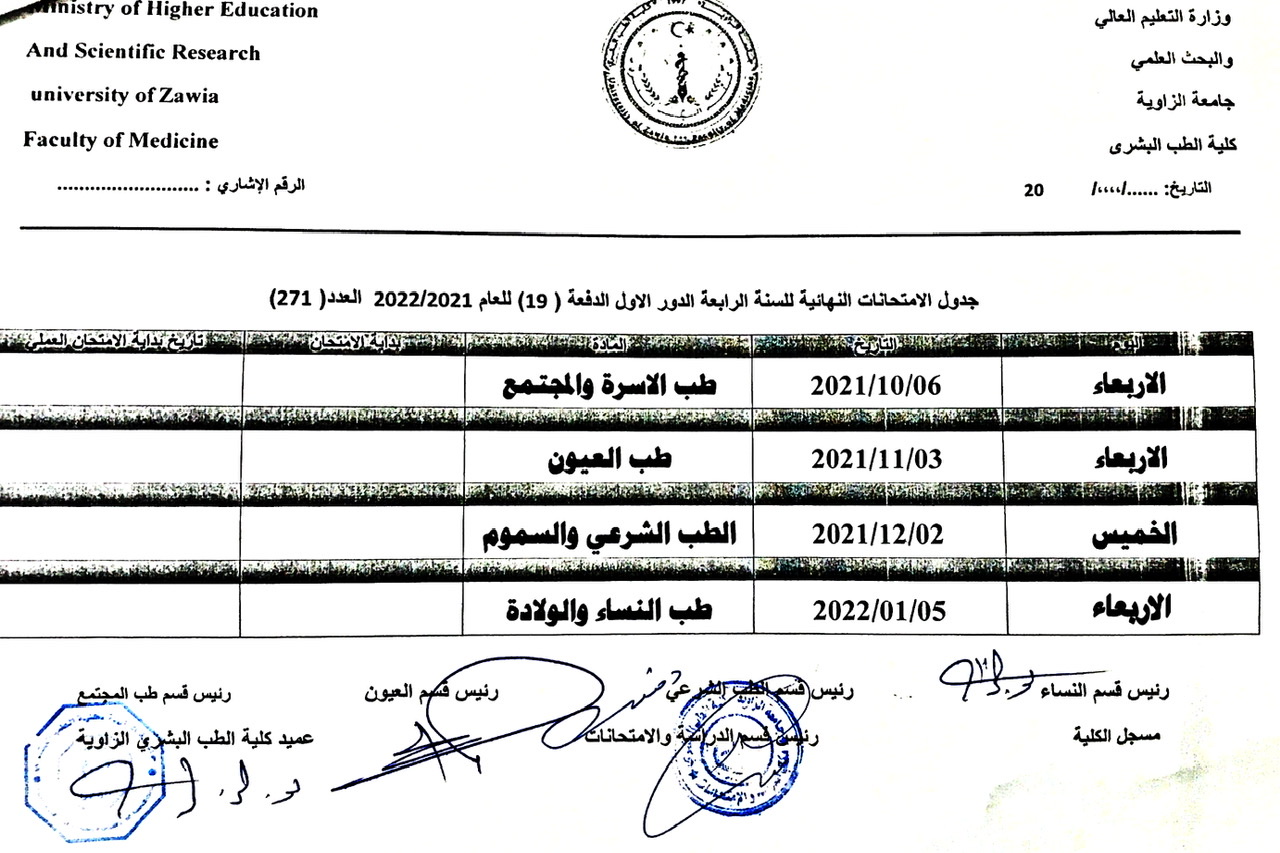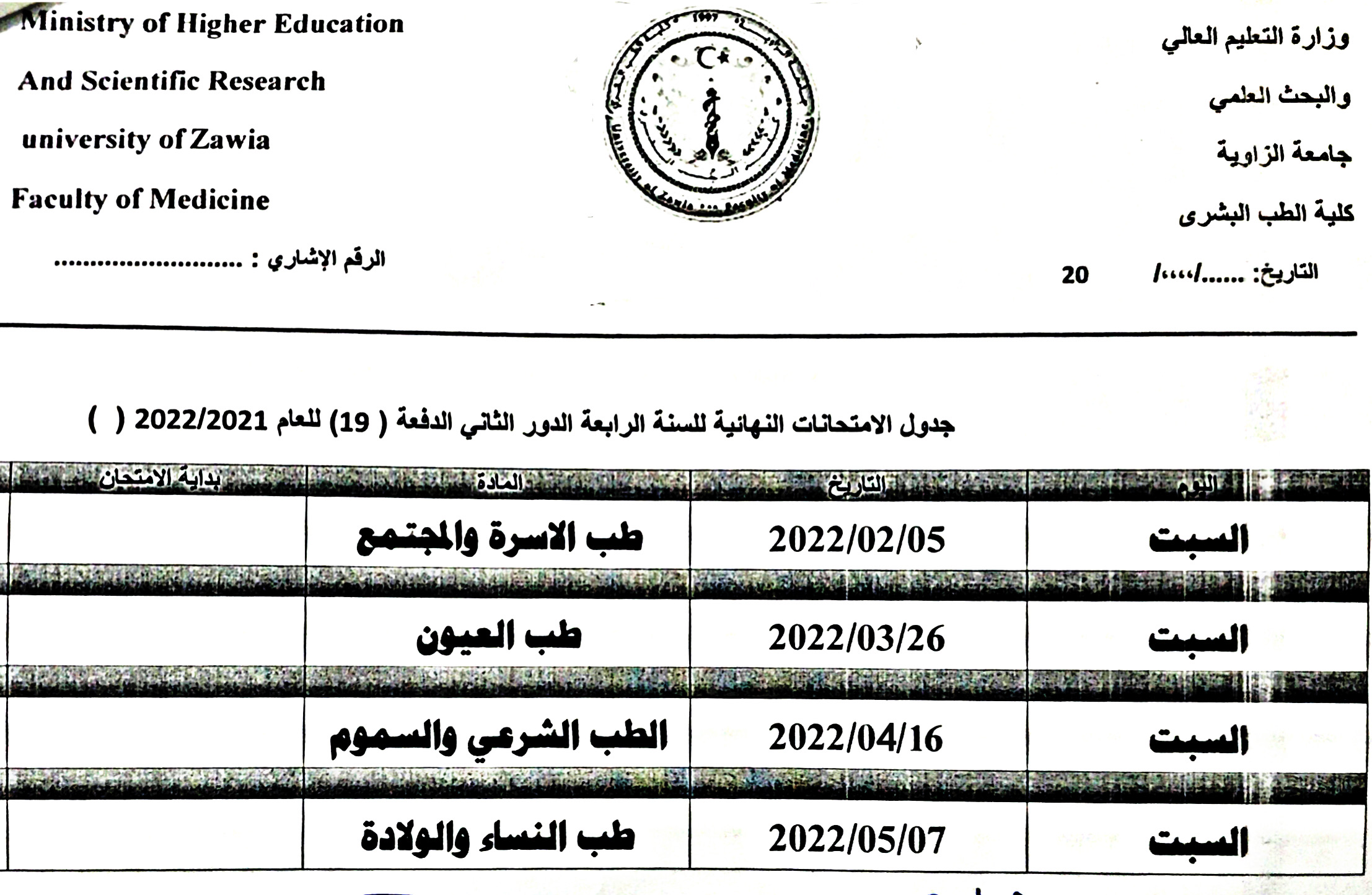 لجنة امتحان الدور الثاني لمادة الطب الشرعي والسموم للسنة الرابعة الدفعة 19 وذلك يوم الأحد الموافق 17-4-2022 الساعة الـ9:00 صباحاً.