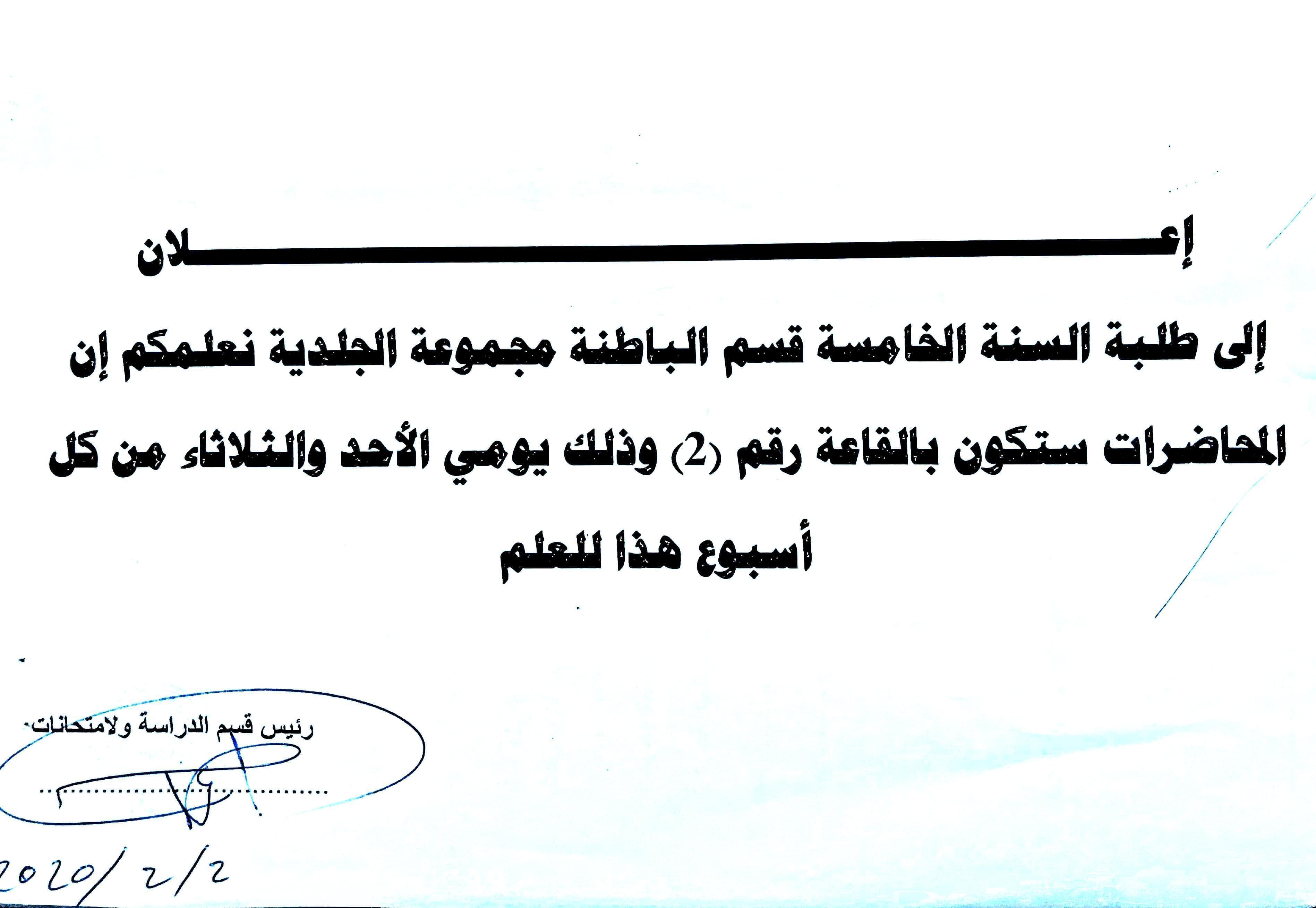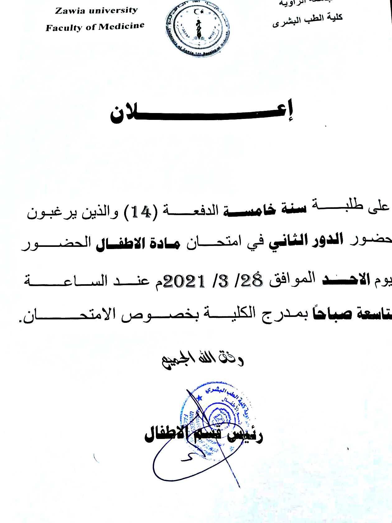 يعلن قسم الأطفال عن القاء بعض المحاضرات النظرية في طب الأطفال وذلك لطلبة السنة الخامسة الدفعة 16