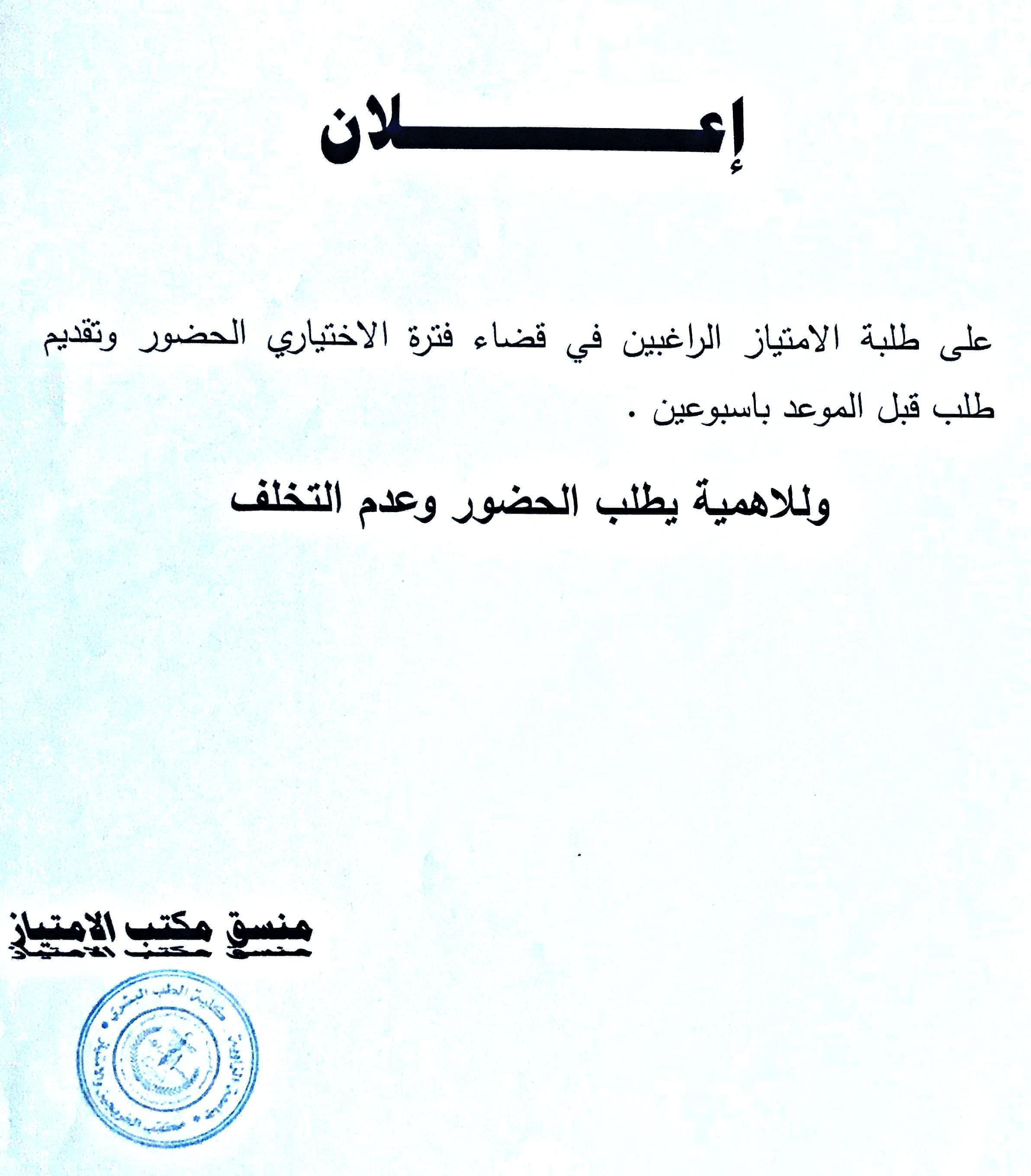 على طلبة الامتياز الدفعة 15(الدور الثاني) ضرورة احضار الاتي:
