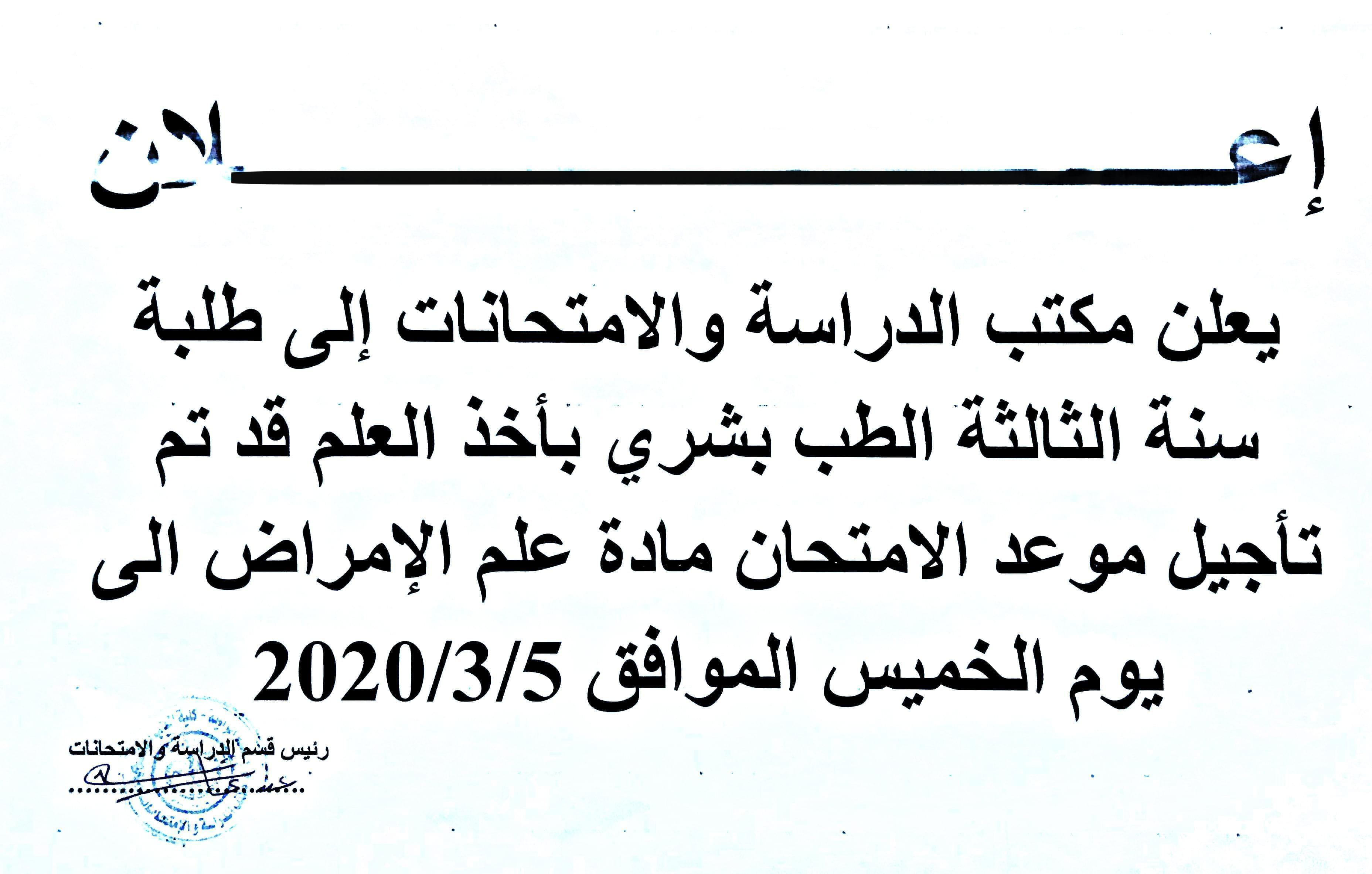 قوائم الطلبة لإمتحان مادة (علم الأمراض) للسنة الثالثة طب بشري للعام الجامعي(2018-2019). الإمتحان يوم الإثنين الموافق 01-04-2019 الساعة الـ09:00 صباحاً.