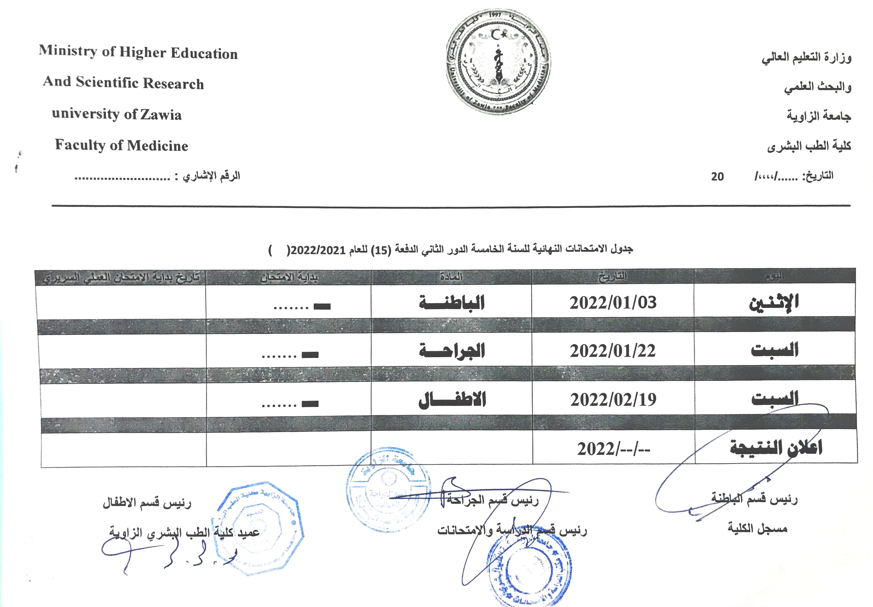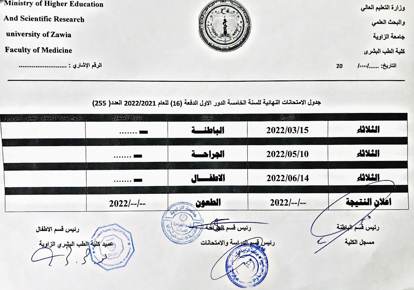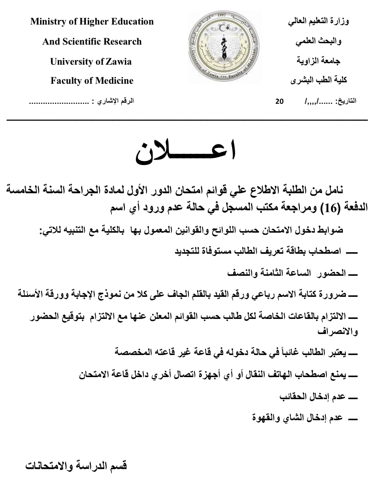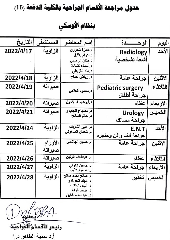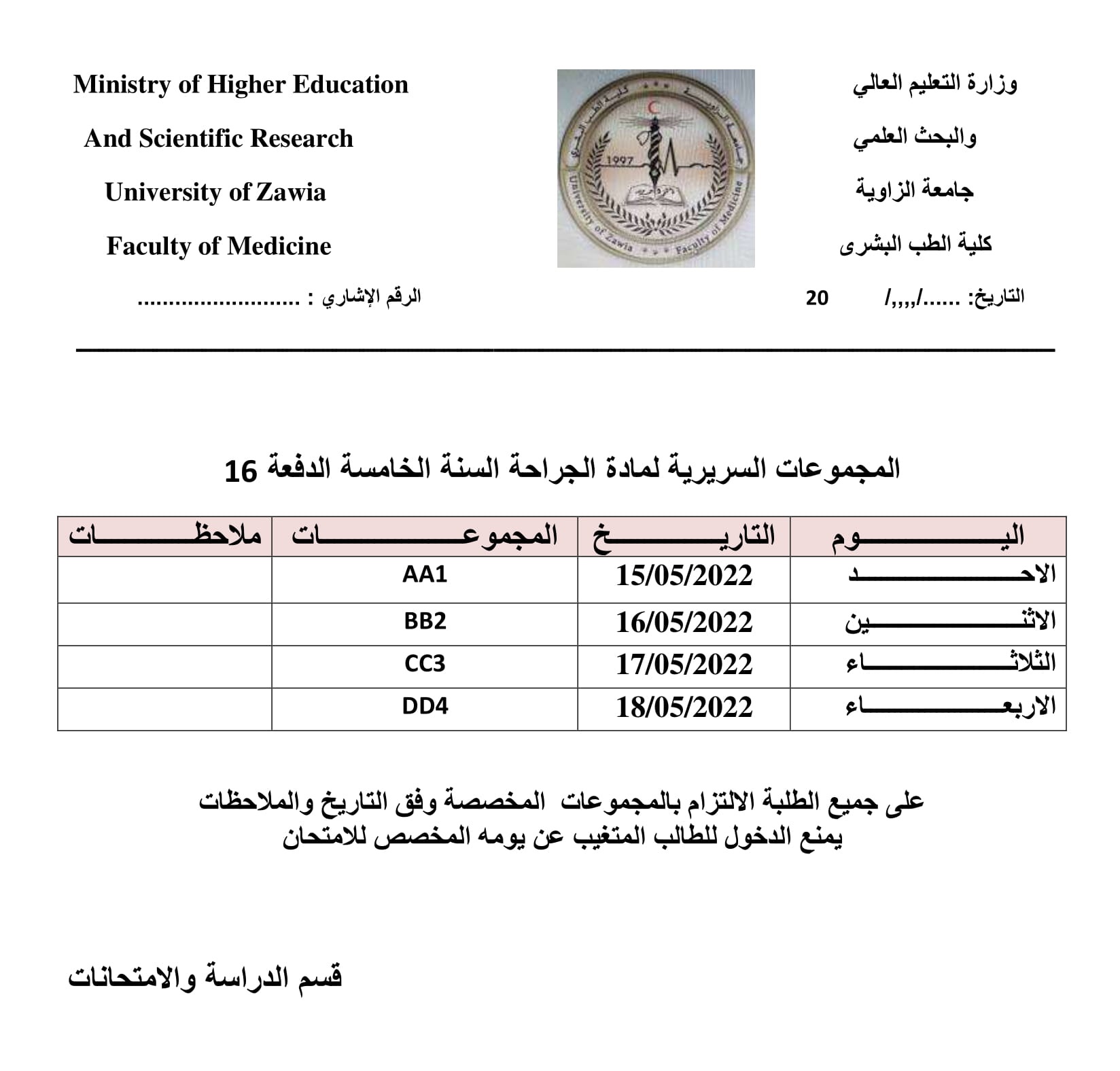اسماء المكلفين بمراقبة امتحان الدور الأول لمادة الجراحة للسنة الخامسة الدفعة 16 وذلك يوم الثلاثاء الموافق 10-5-2022 الساعة الـ08:30 صباحاً.