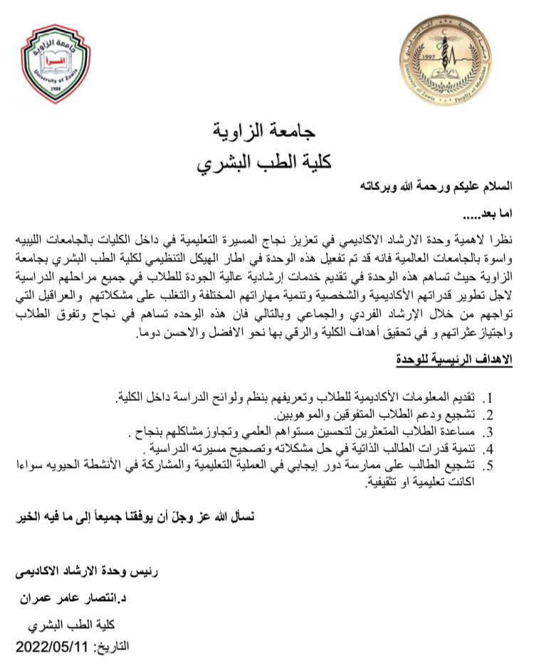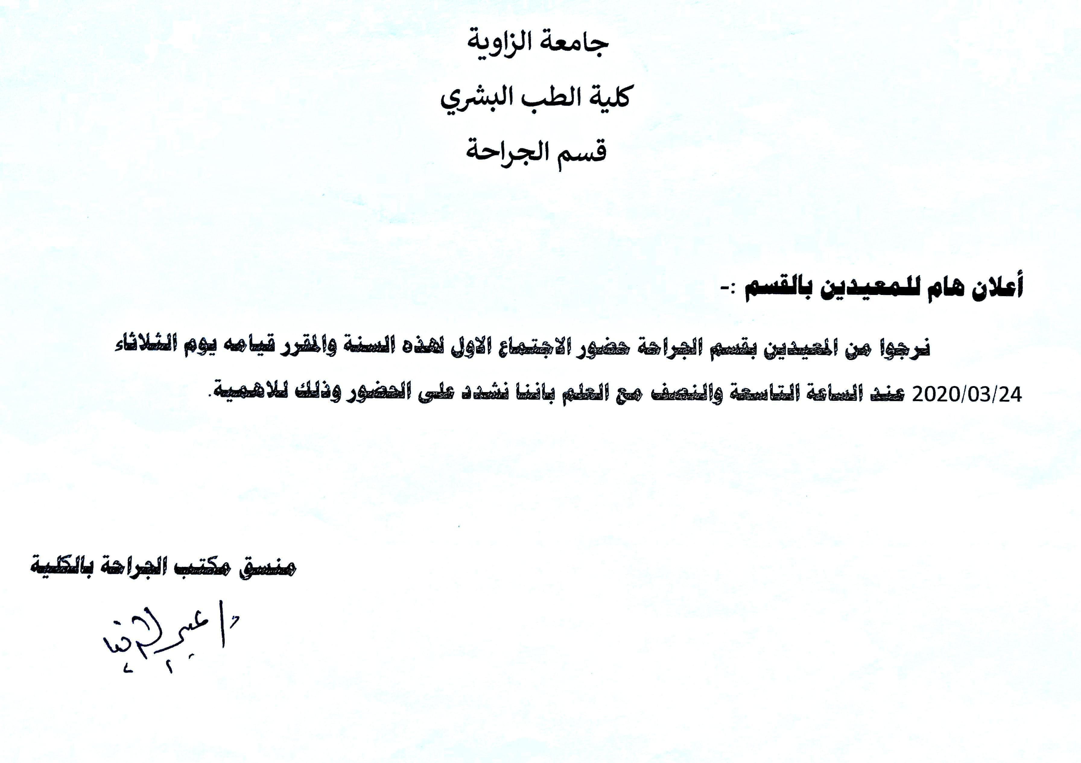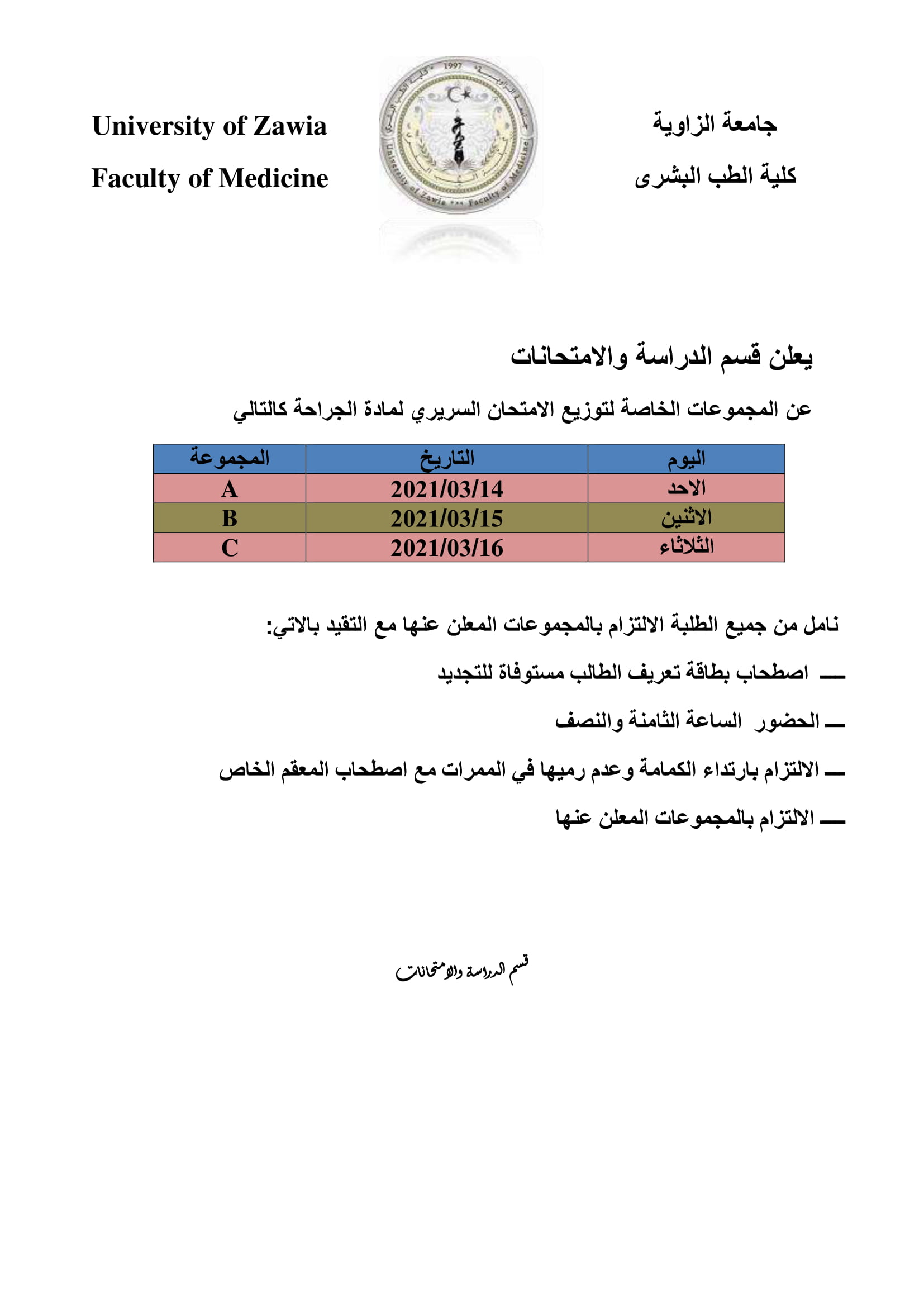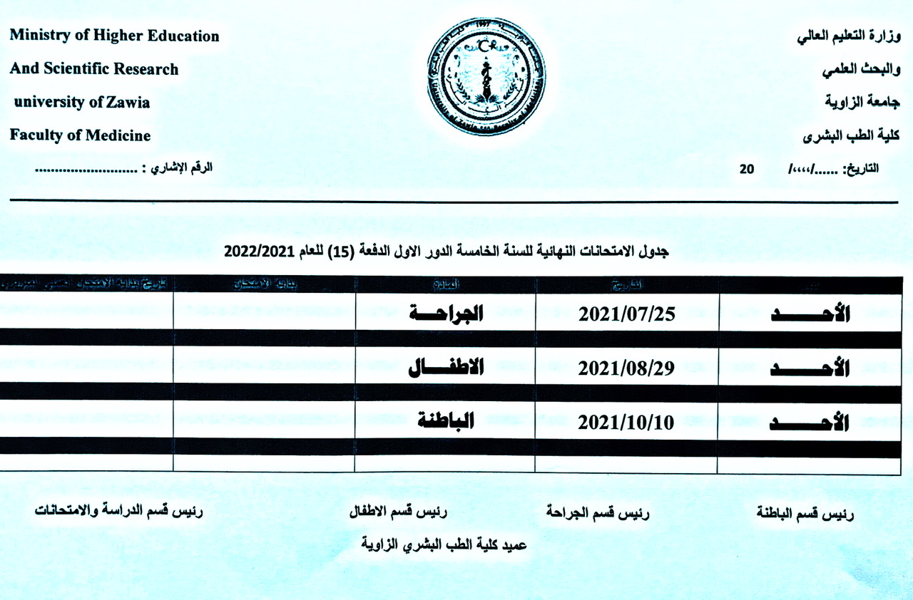 اسماء المكلفين بمراقبة امتحان الدور الأول لمادة الجراحة للسنة الخامسة الدفعة 16 وذلك يوم الثلاثاء الموافق 10-5-2022 الساعة الـ08:30 صباحاً.