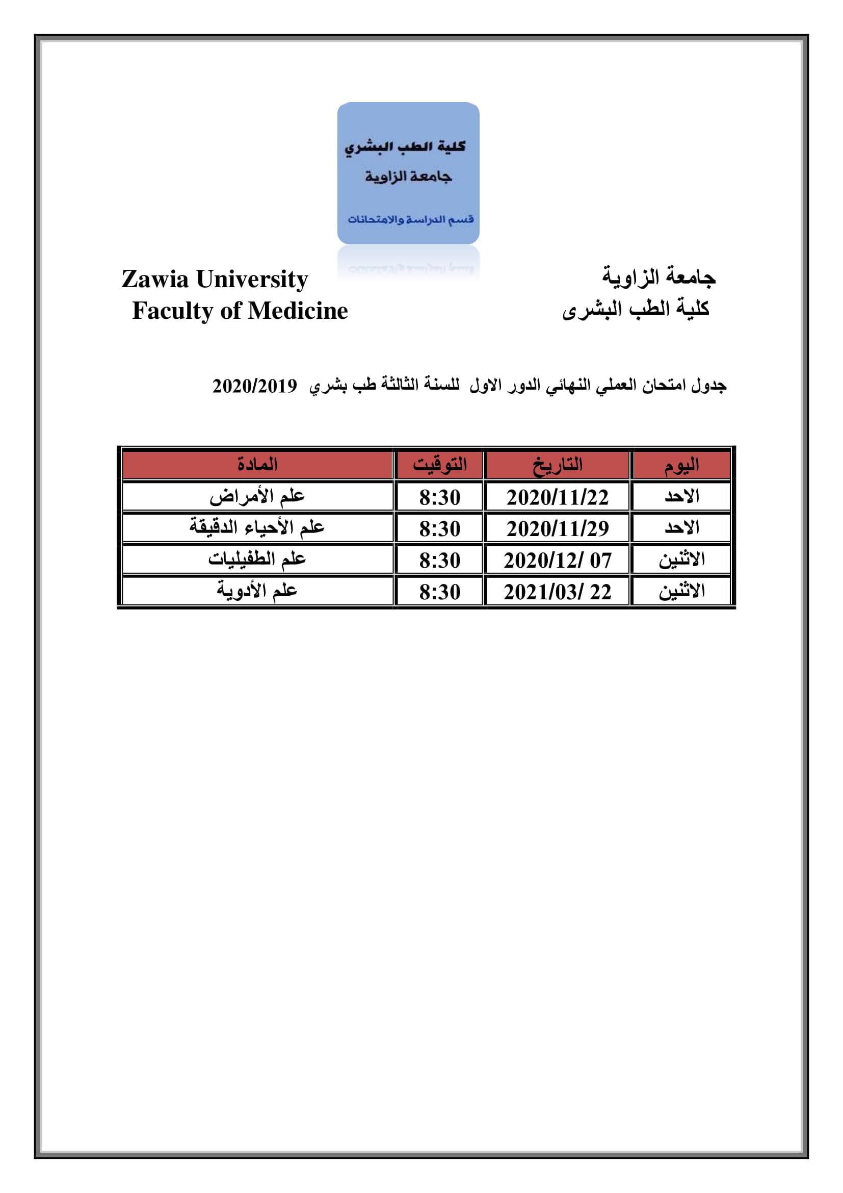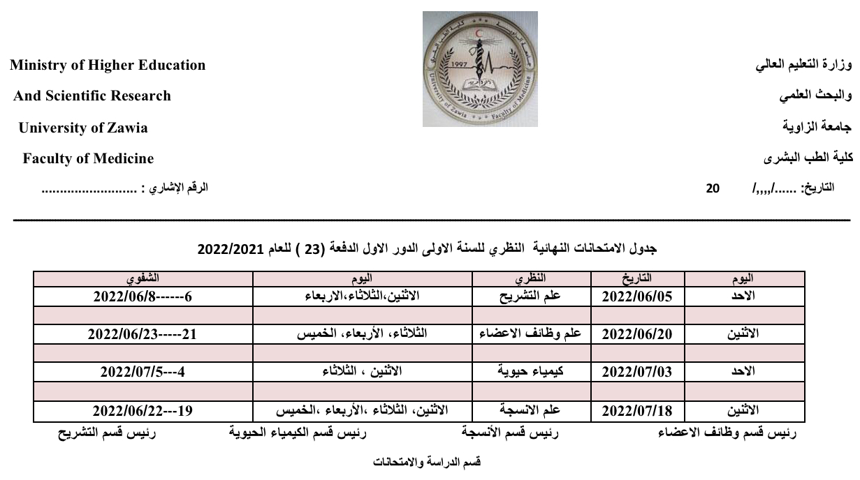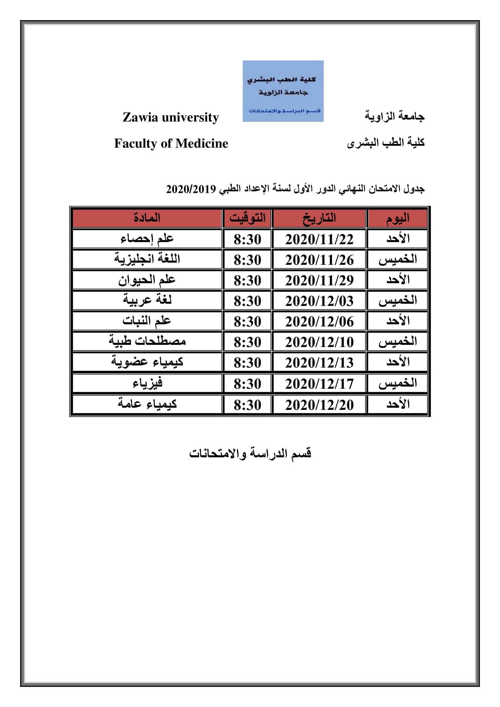 جدول الامتحانات النهائيه الدور الأول (العملي والنظري) للسنة الأولى طب بشري.