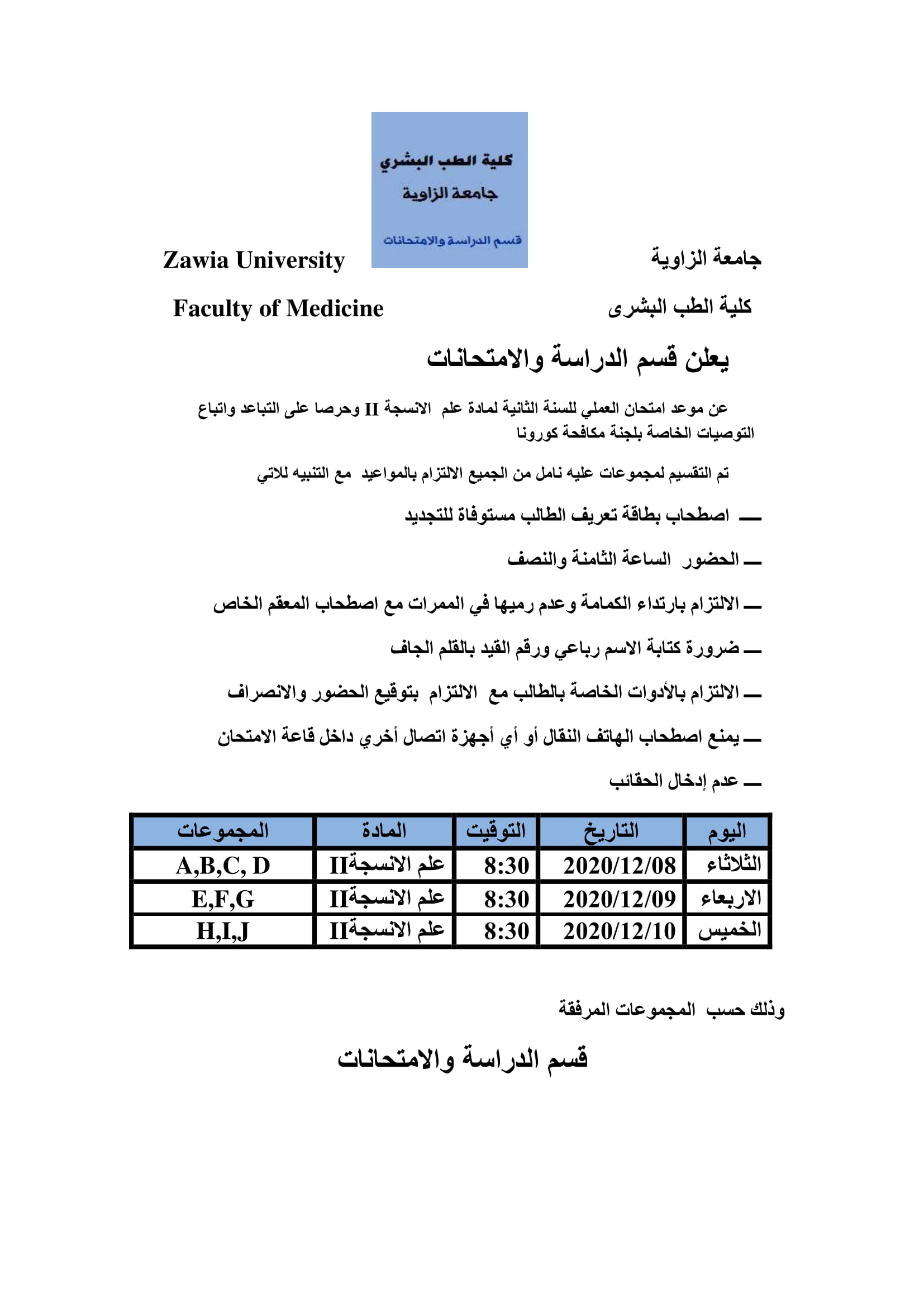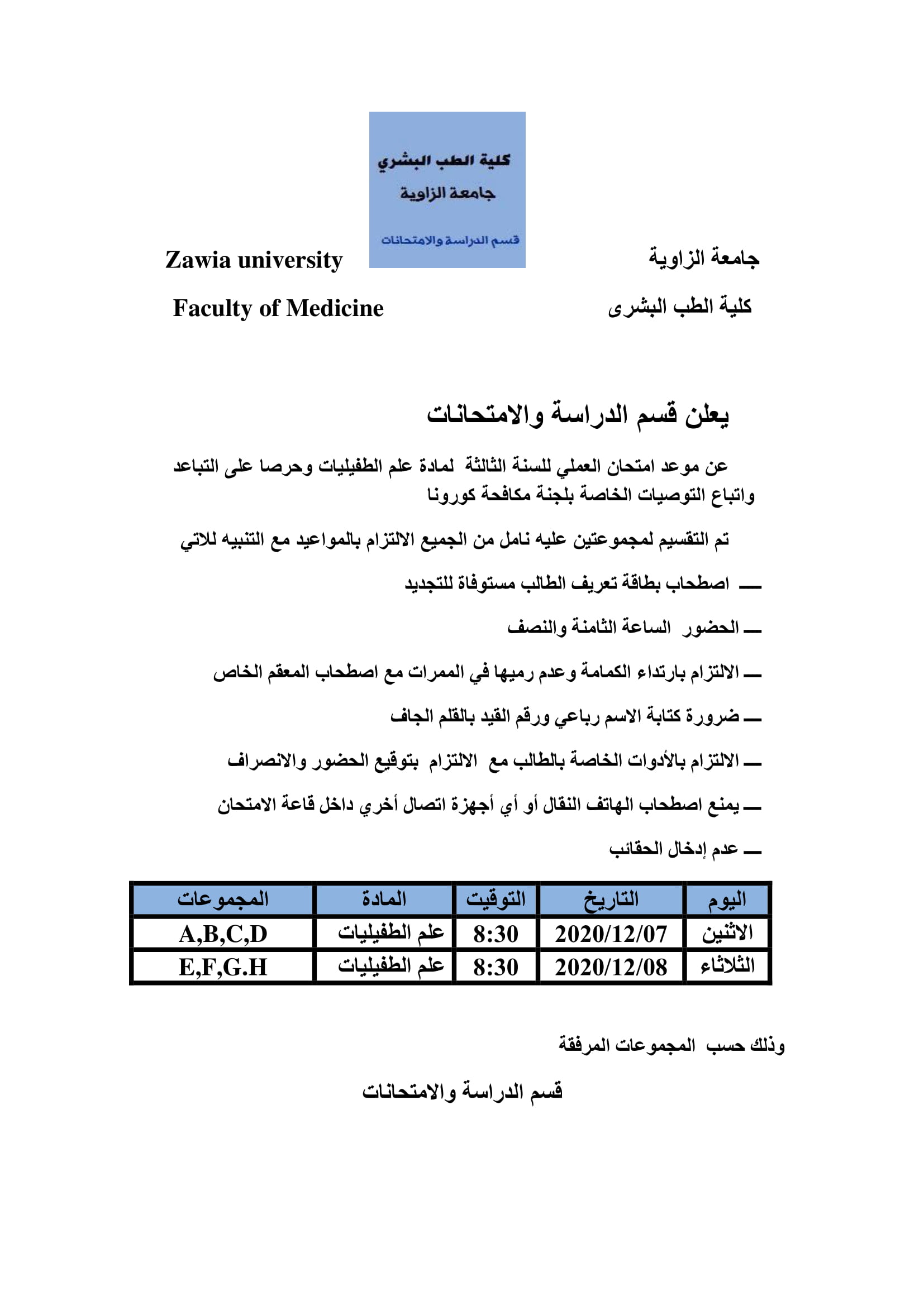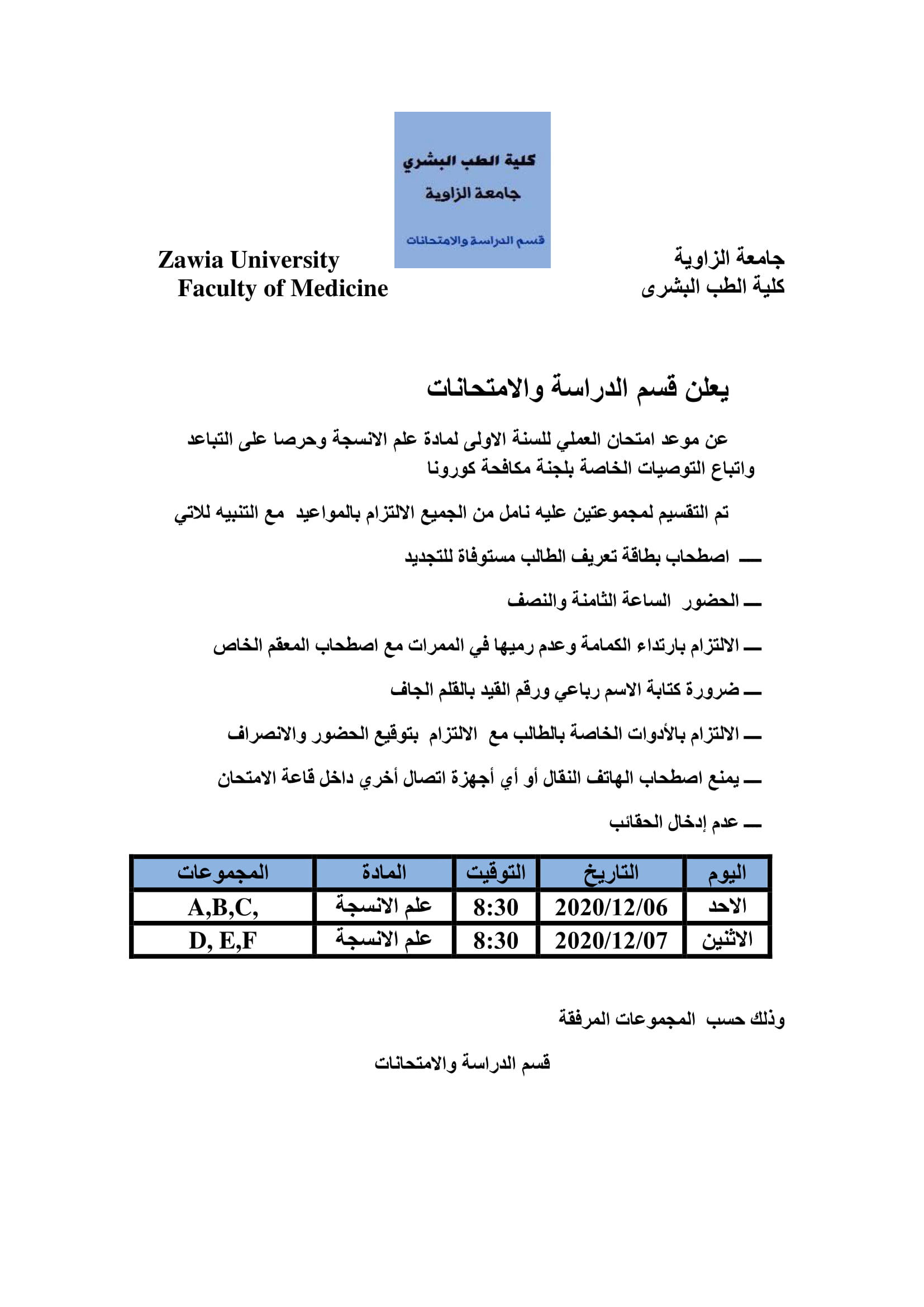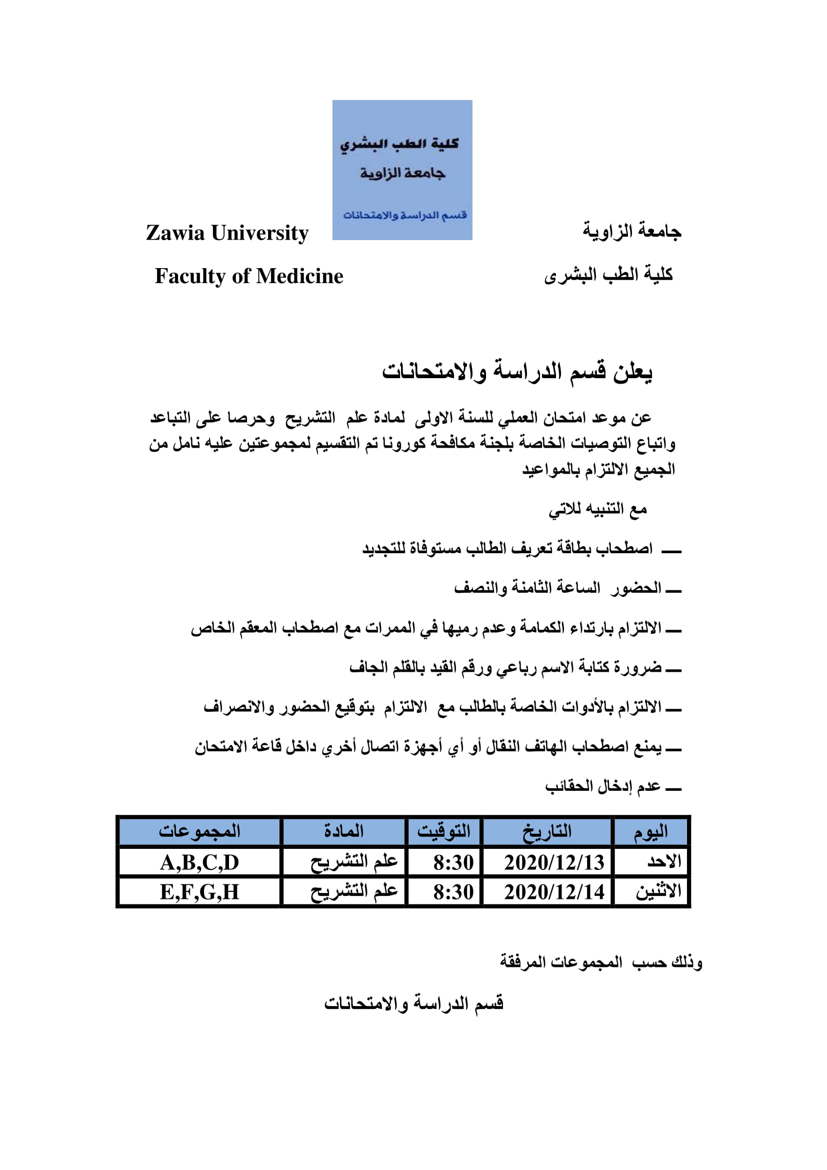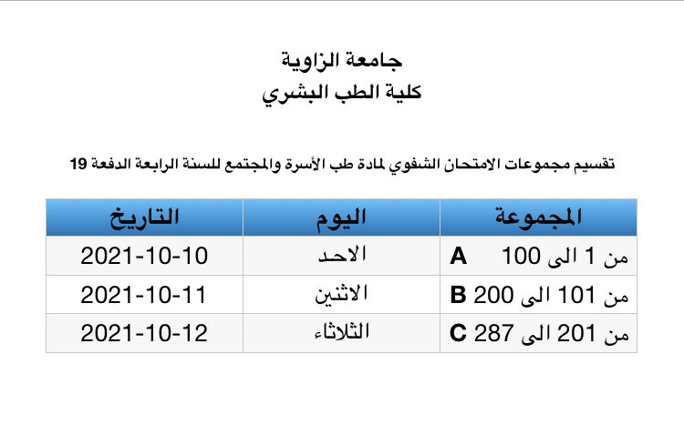 علي الطلبة المدرجين تحت المجموعتين C&D الإلتزام بحضور المحاضرات العامة ابتداء من يـوم 2-9 الي يوم 12-9 في ايّام الاسبوع ابتداء من الاثنينن إلى الخميس علي مدار أسبوعين علما بأن المحاضرات ستكون بمادة طب الاسرة والمجتمع فقط.