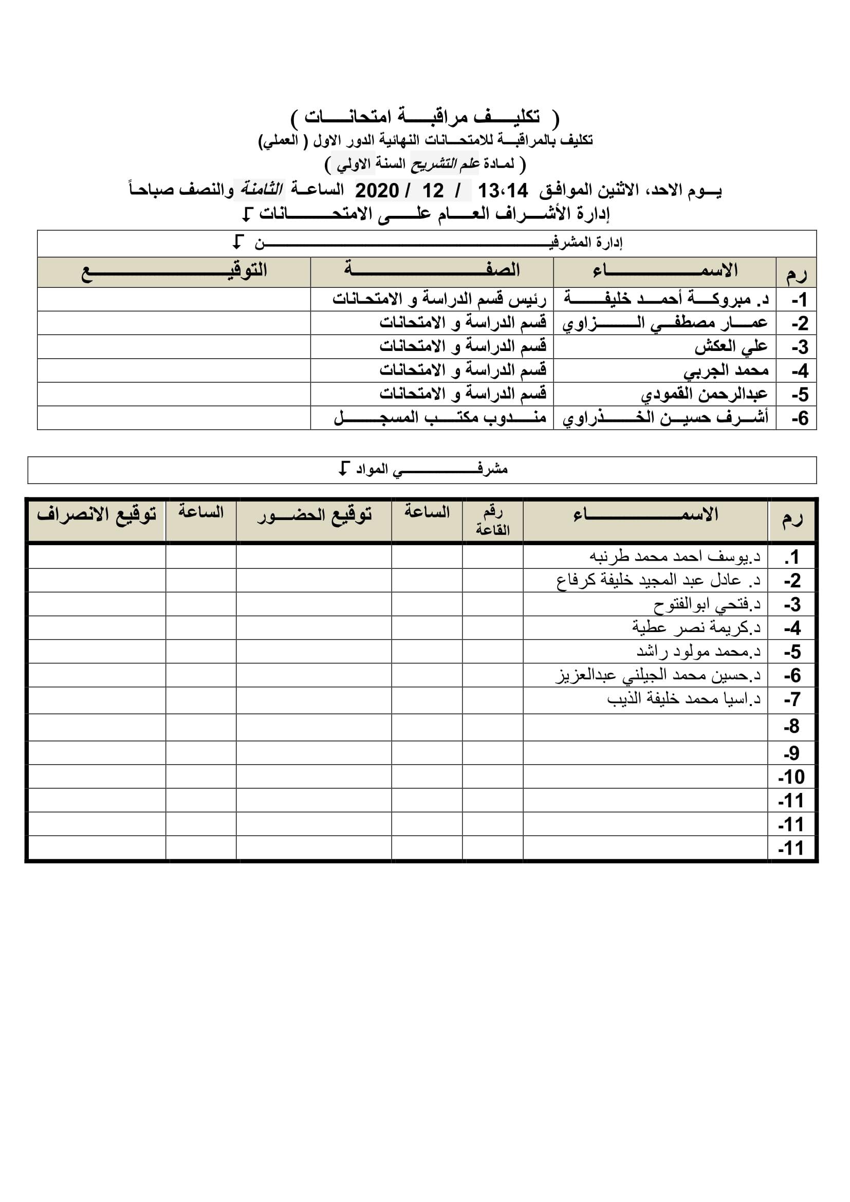 أسماء المكلفين بمراقبة امتحان الورقة الأولى والثانية لمادة الباطنة للسنة الخامسة الدفعة 14
