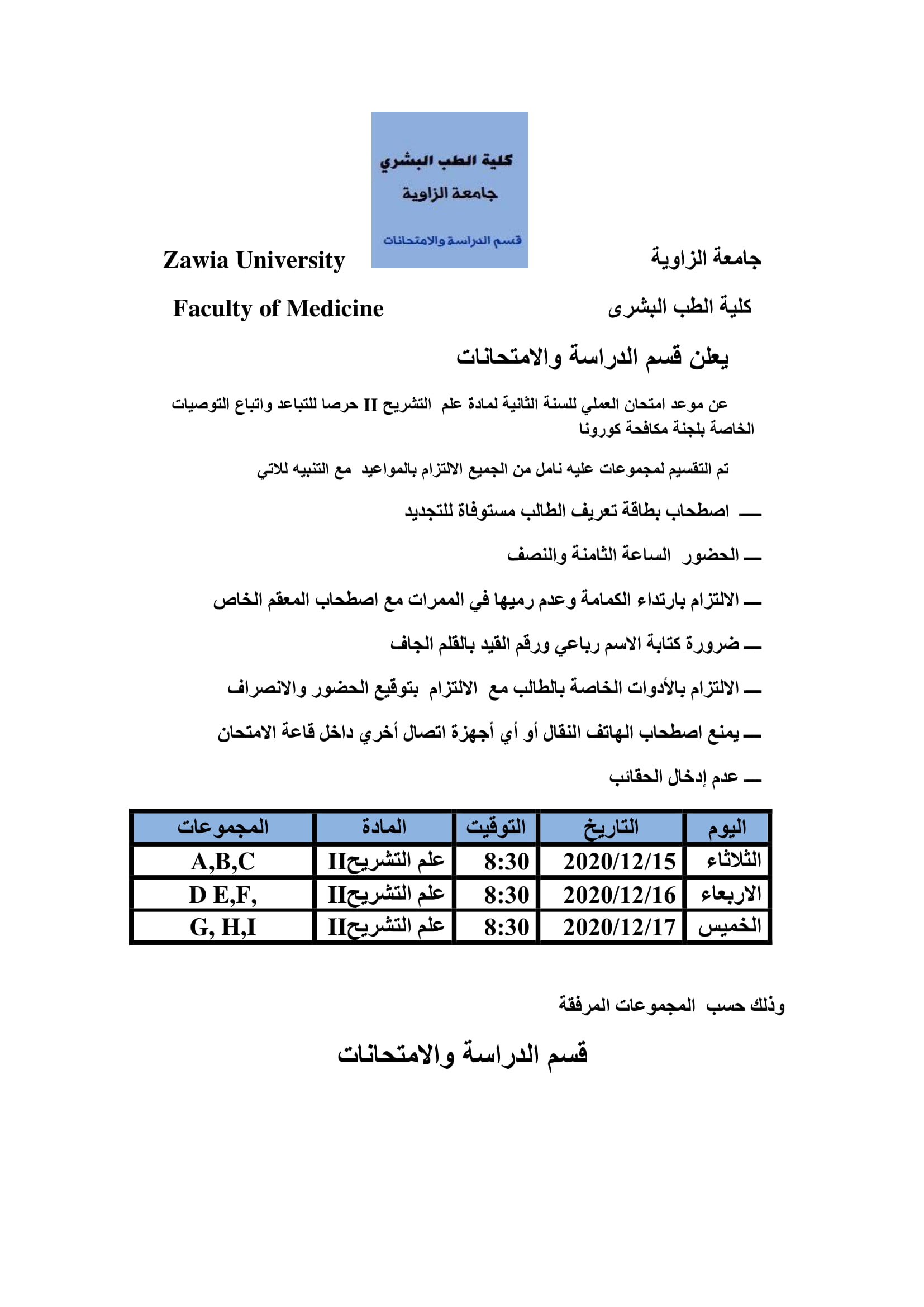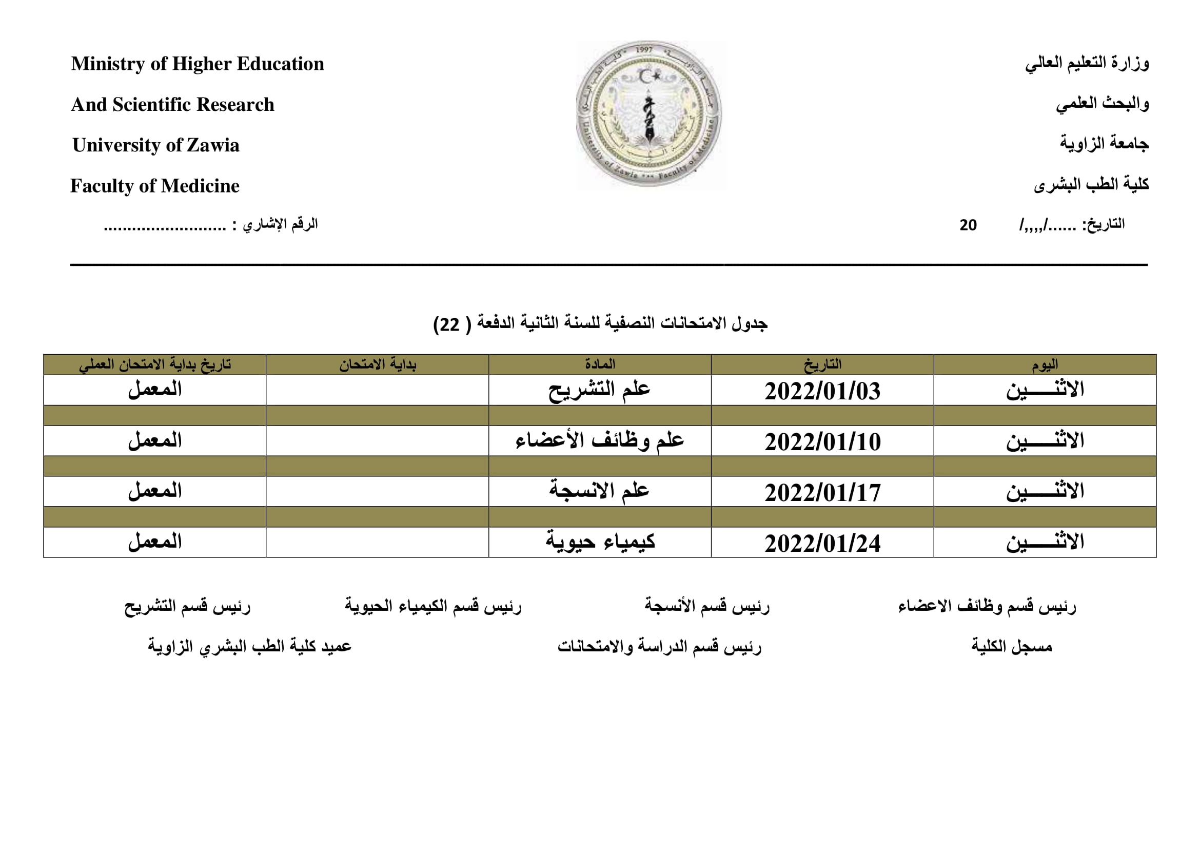 أسماء المكلفين بمراقبة امتحان الدور الأول لمادة التشريح للسنة الثانية طب بشري وذلك يوم الخميس الموافق 26-5-2022 الساعة الـ08:30 صباحاً.