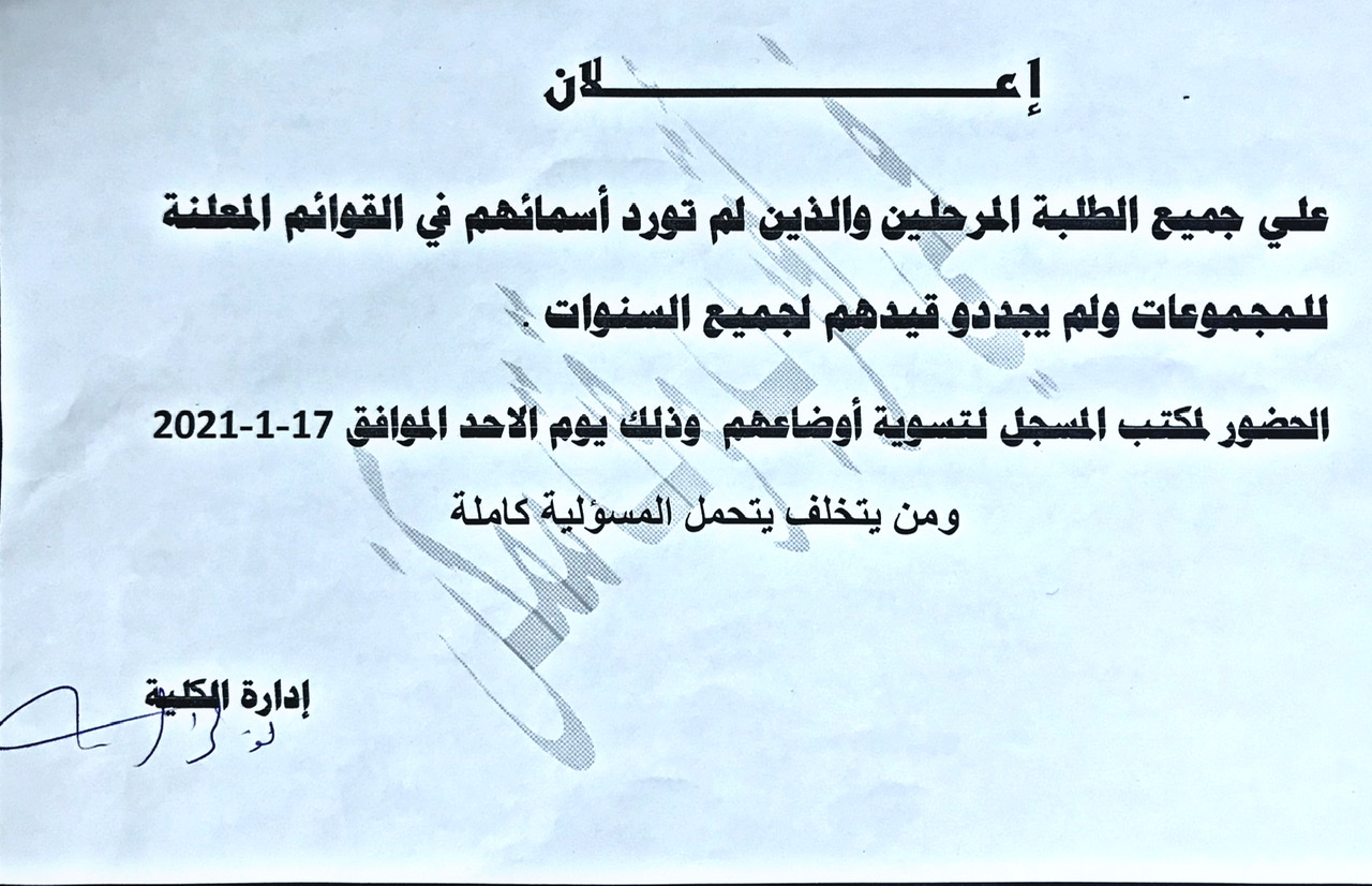 يطلب من الطلبة الغير مدرج أسماؤهم بالقوائم مراجعة مكتب المسجل قبل يوم الخميس الموافق 21-4-2022 علما بأنه لن يسمح الطلبة الغير مدرج اسمائهم بالقوائم دخول الامتحان.
