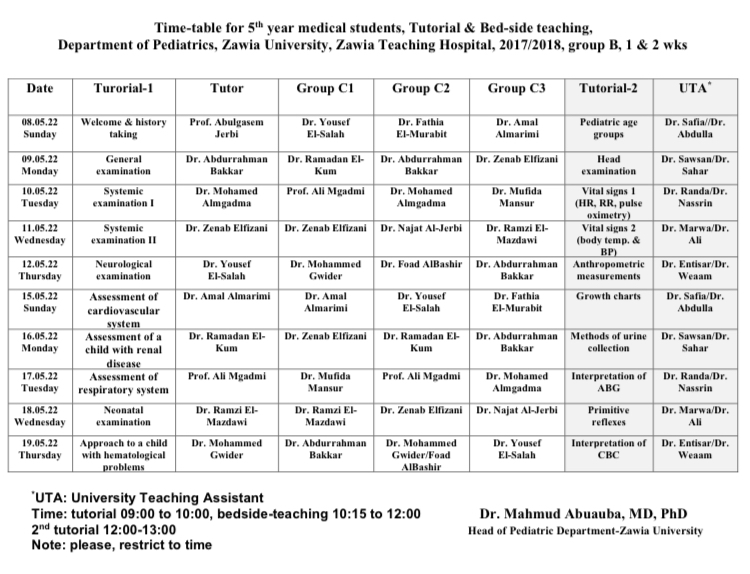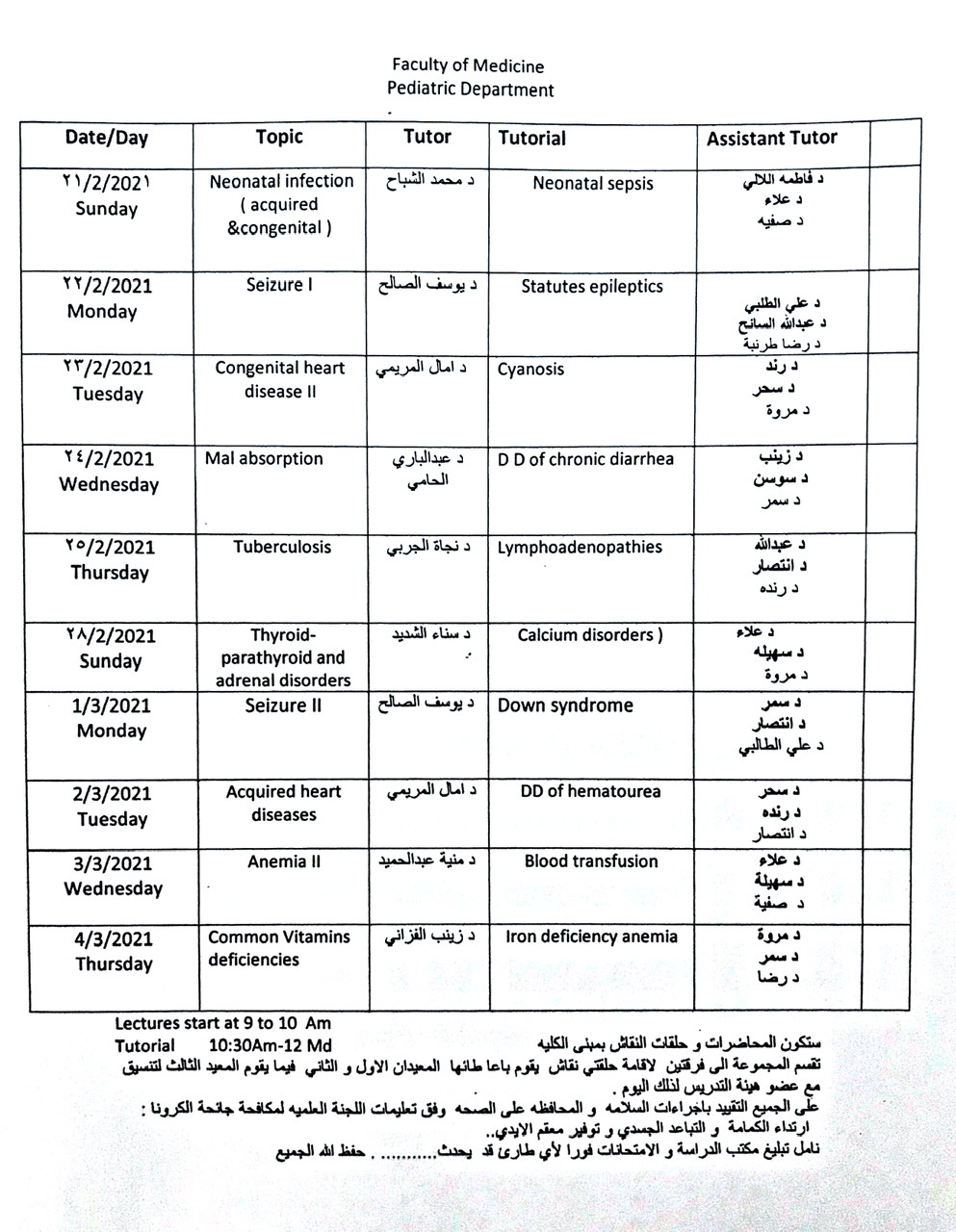 جدول محاضرات الاسبوع الاول والثاني للسنة الخامسة الدفعة 18،17، المجموعةB ابتداء من يوم الأحد الموافق 08-05-2022 بقاعة السنة الخامسة طب الأطفال بالكلية يرجى الالتزام بالحضور.