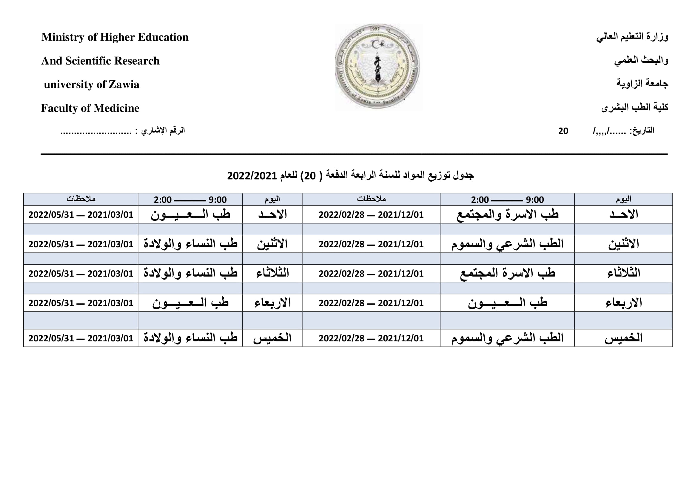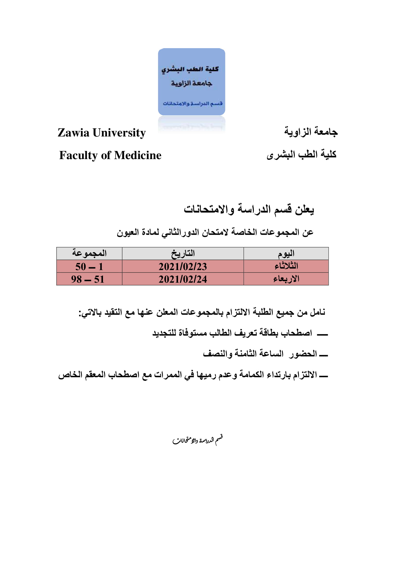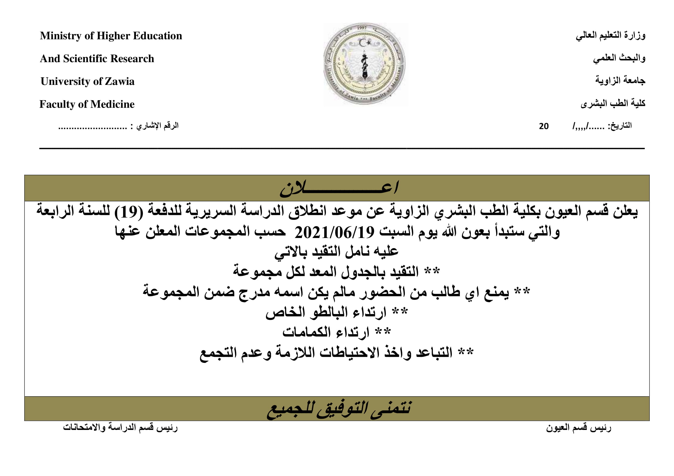 تقسيم مجموعات محاضرات العملي لمادة العيون للسنة الرابعة الدفعة 20 وذلك ابتداء من يوم الأحد الموافق 17-4-2022 ولمدة 6 أسابيع وذلك ايام الأحد والاثنين من كل أسبوع حسب الاتي