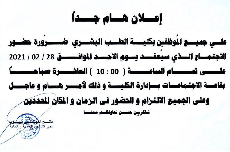 على جميع الموظفين والموظفات وفنيات المعامل بالكلية ضرورة حضور الاجتماع بالكلية وذلك يوم الاثنين الموافق 30-5-2022 الساعة الـ10:00 صباحاً.