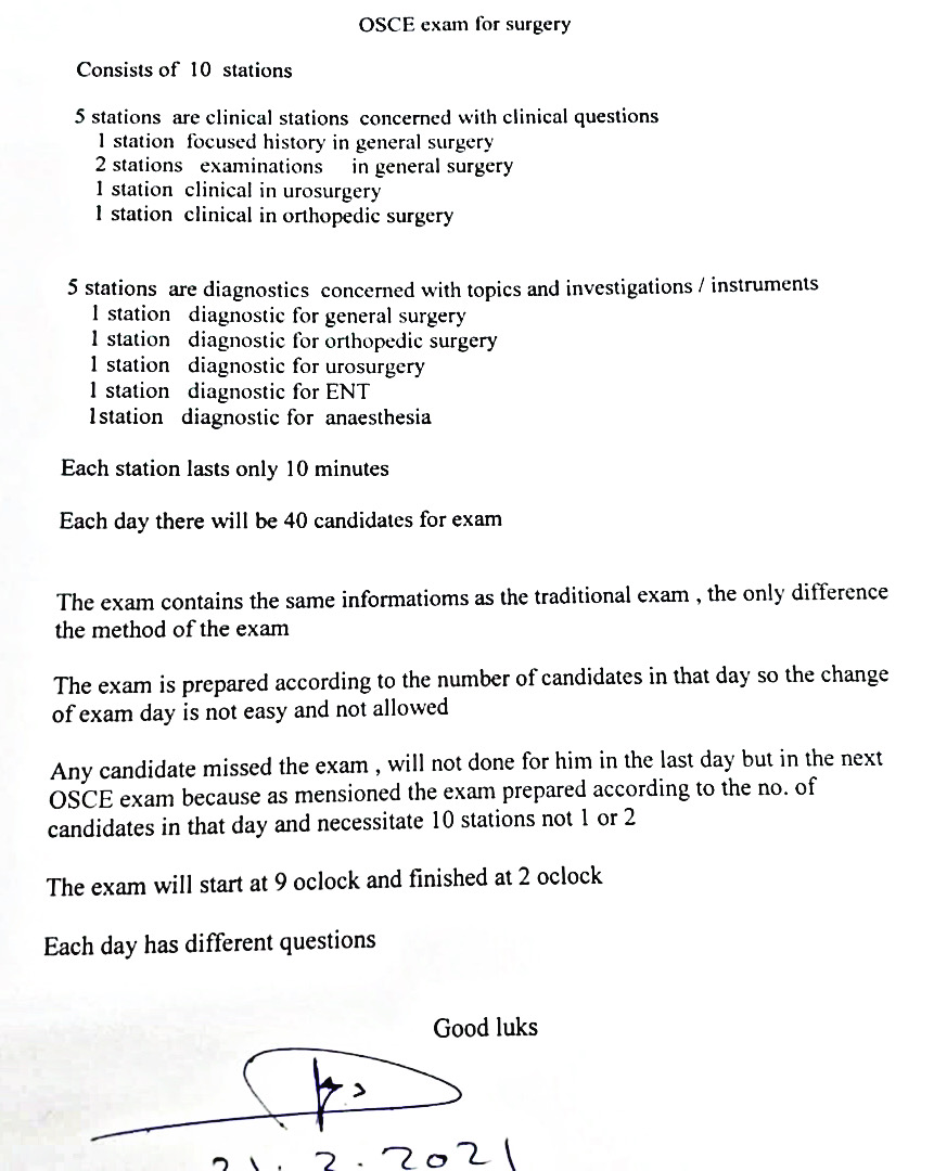 على جميع طلبة المستهدفين لدخول الامتحان السريري الدور الأول لمادة الجراحة الالتزام بالآتي: