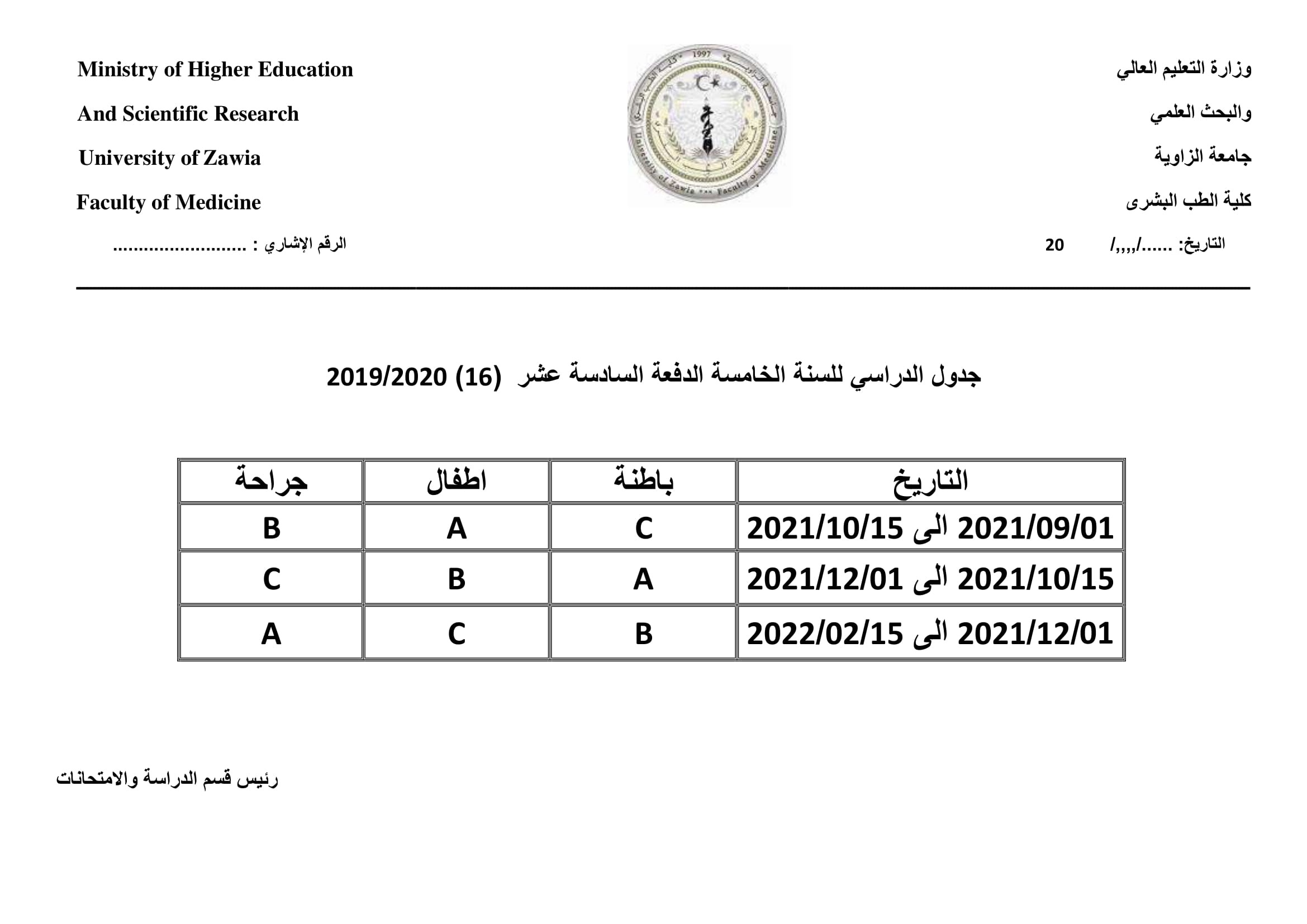 تقسيم لجان الامتحان السريري الدور الأول لمادة الجراحة للسنة الخامسة الدفعة 16.