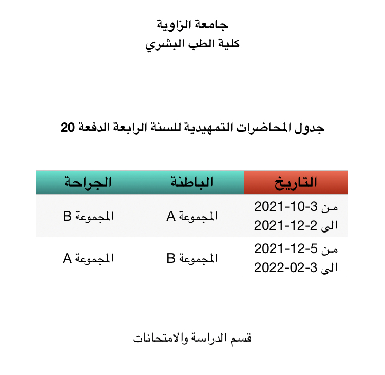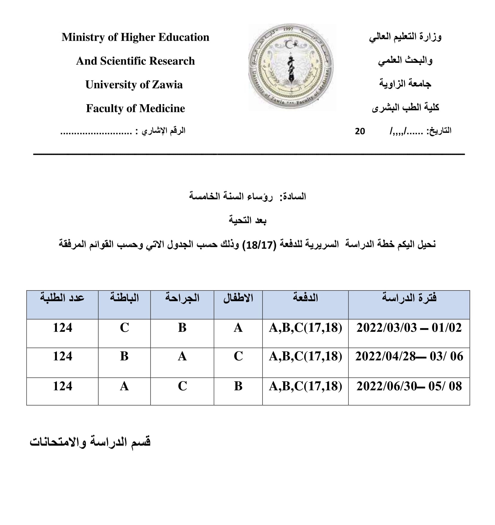 الجدول الدراسي وقوائم المجموعات لطلبة السنة الخامسة طب بشري الدفعة (15).