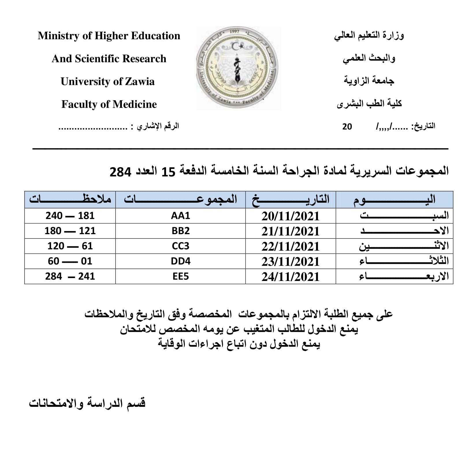 تقسيم لجان امتحان الدور الاول لمادة الجراحة للسنة الخامسة الدفعة 16 وذلك يوم الثلاثاء الموافق 10-5-2022 الساعة الـ08:30 صباحا يطلب من جميع الطلبة الالتزام باللجان حسب القوائم المرفقة ادناه