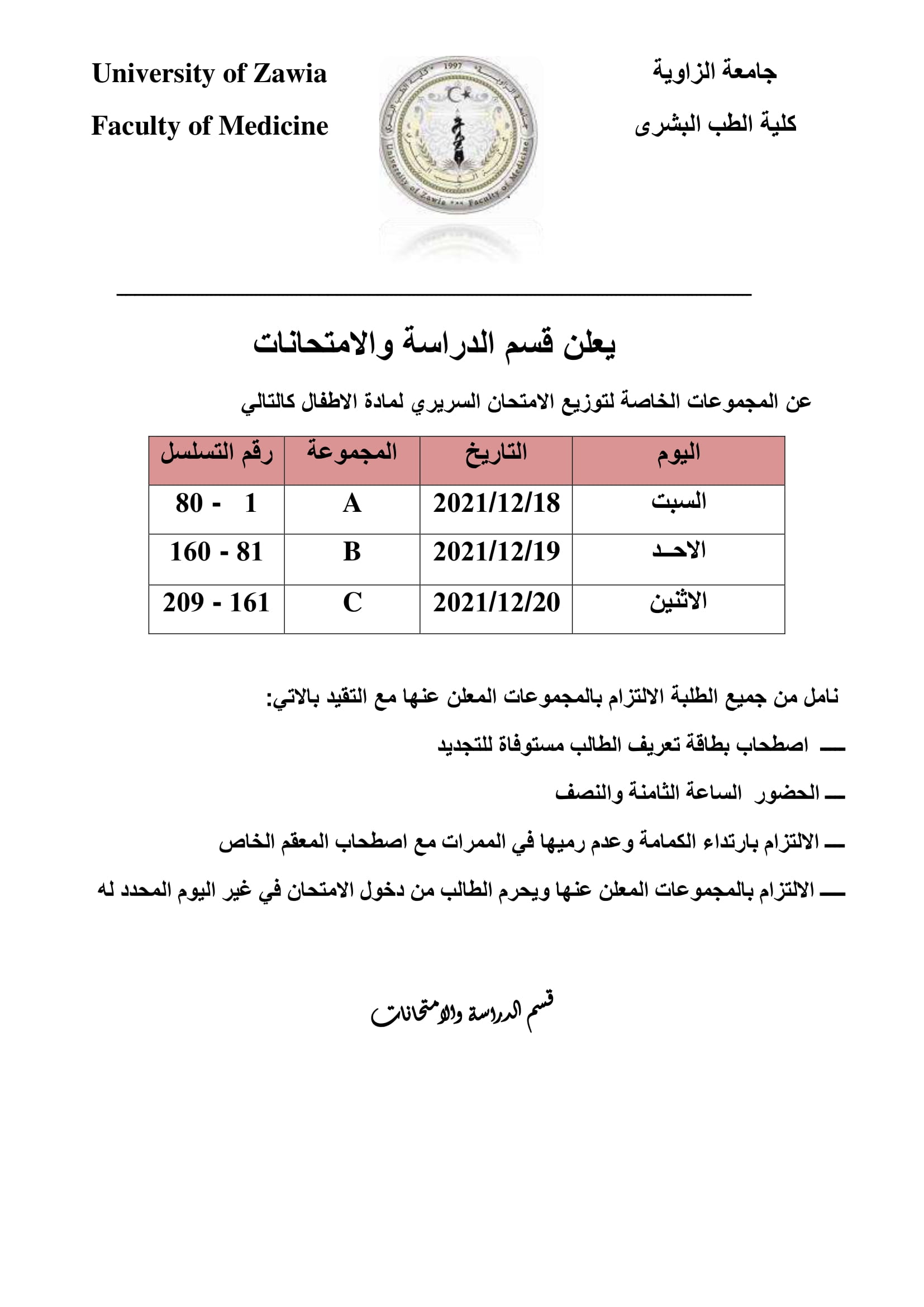 تقسيم المجموعات للإمتحان السريري والشفهي لـمـادة الباطنة للسنة الخامسة الدفعة 14 والتكميلي.