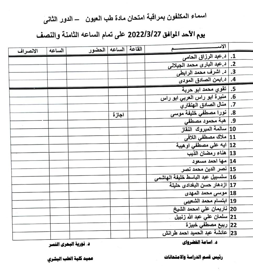 اسماء المكلفين بمراقبة امتحان الدور الثاني لمادة الطب الشرعي والسموم للسنة الرابعة الدفعة 19 وذلك يوم الأحد الموافق 17-4-2022 الساعة الـ09:00 صباحاً.