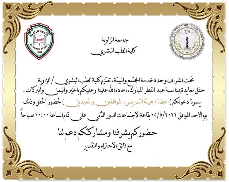 تحت اشراف وحدة خدمة المجتمع و البيئة تعتزم كلية الطب البشري اقامة حفل معايدة بمناسبة عيد الفطر المبارك وتوجه الدعوة الي اعضاء هيئة التدريس و المعيدين و الموظفين لحضور الحفل و ذلك يوم الاحد الموافق 15-5-2022 بقاعة الاجتماعات الدور الثاني علي تمام الساعة العاشرة صباحا